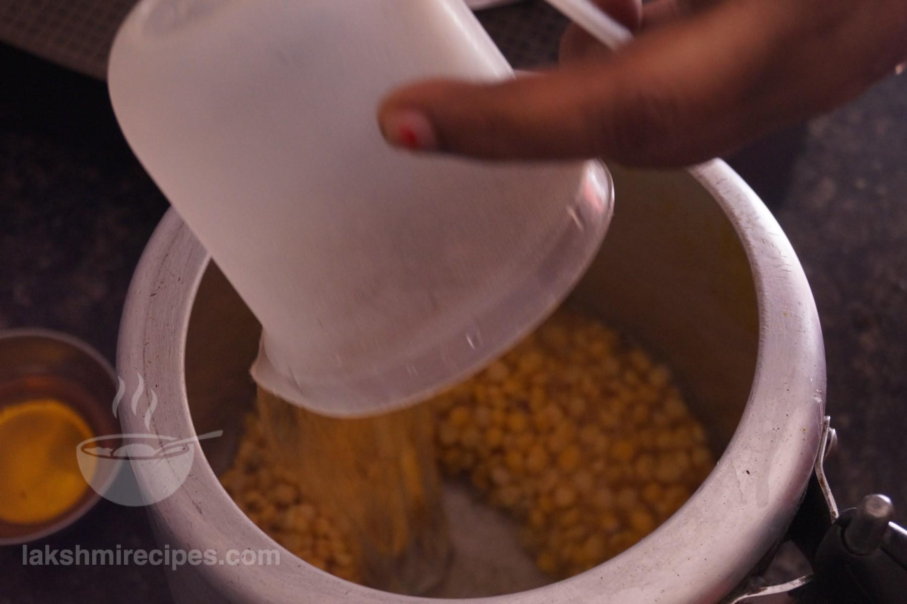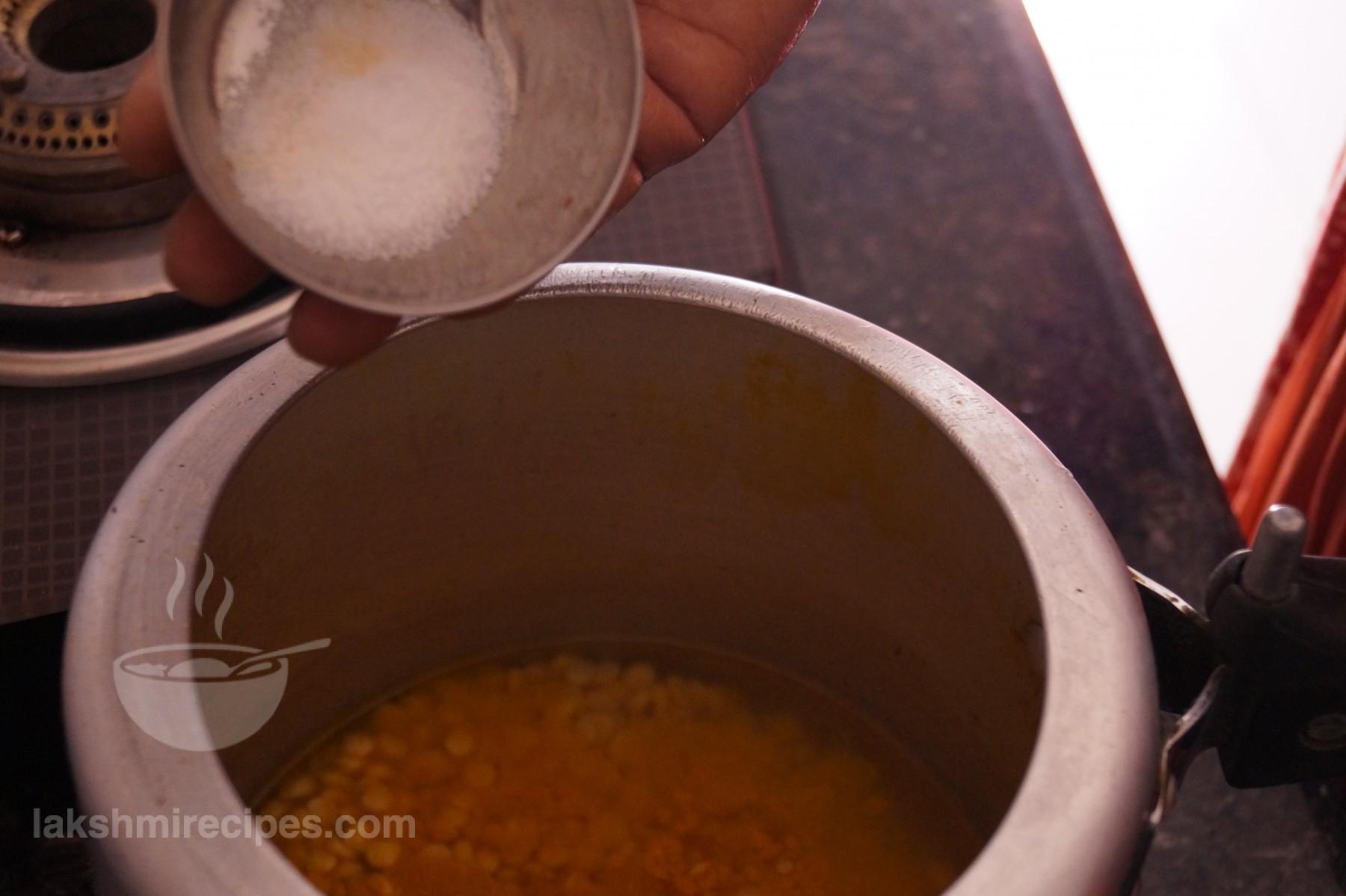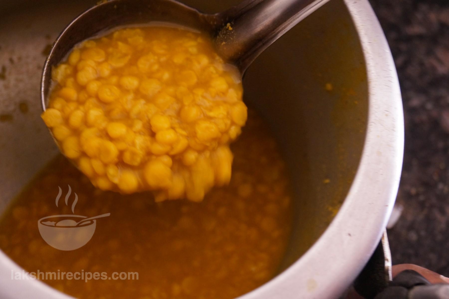 - In a pressure cooker put the bengal gram (chana dal) and 1 cup water. To it add the turmeric powder (haldi powder) and salt to taste. Pressure cook the dal for 1 whistle on high flame. Lower the flame and cook it for further 7 minutes. Then turn off the flame and allow it to cool.