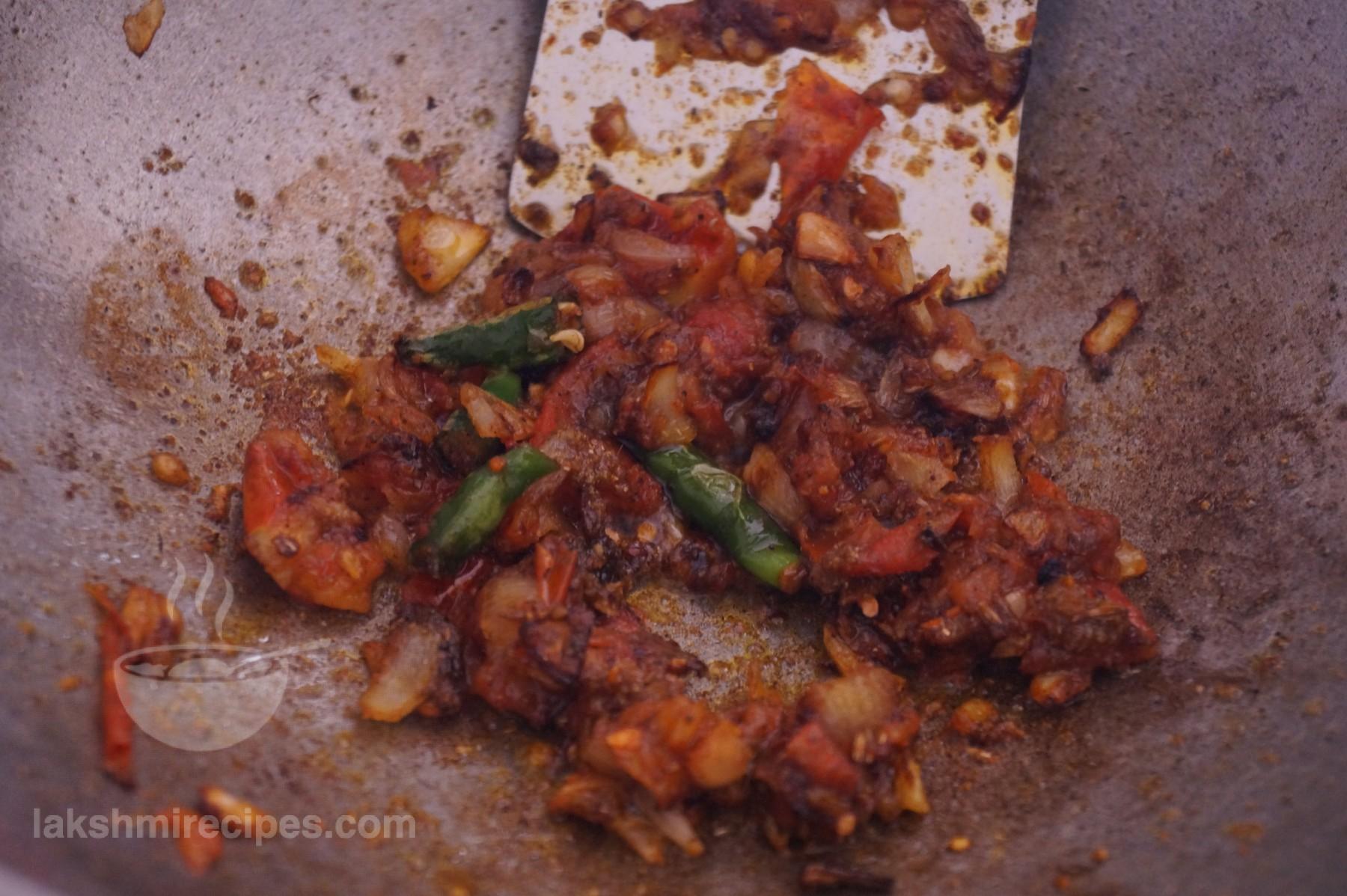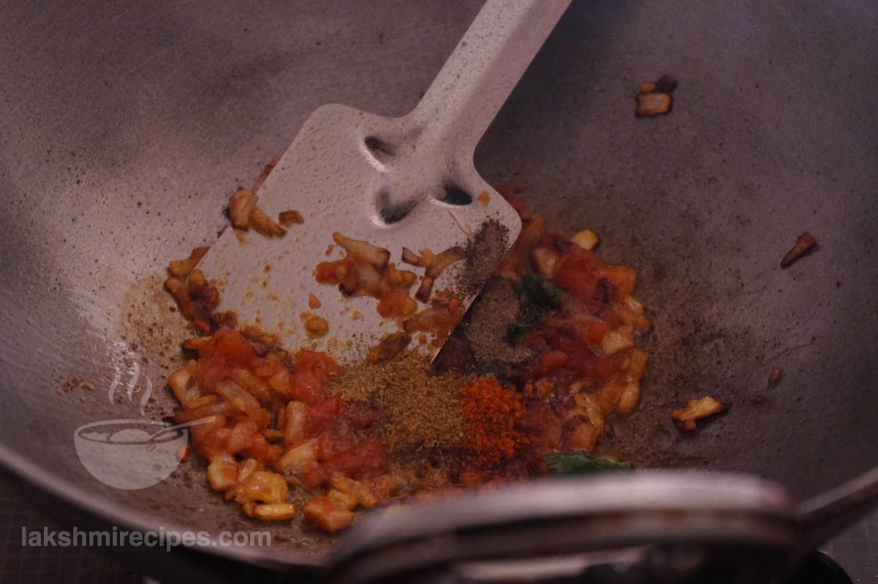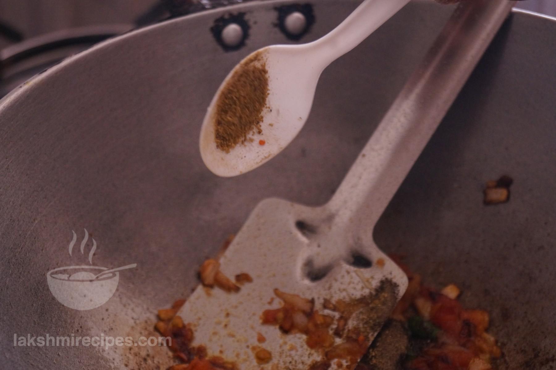 - When the above ingredients are completely cooked add the red chilli powder (lal mirch powder). Mix it well and mash the tomatoes a little to form a paste like masala. Add the garam masala powder and mix. The masala for the chana dal fry is now ready.