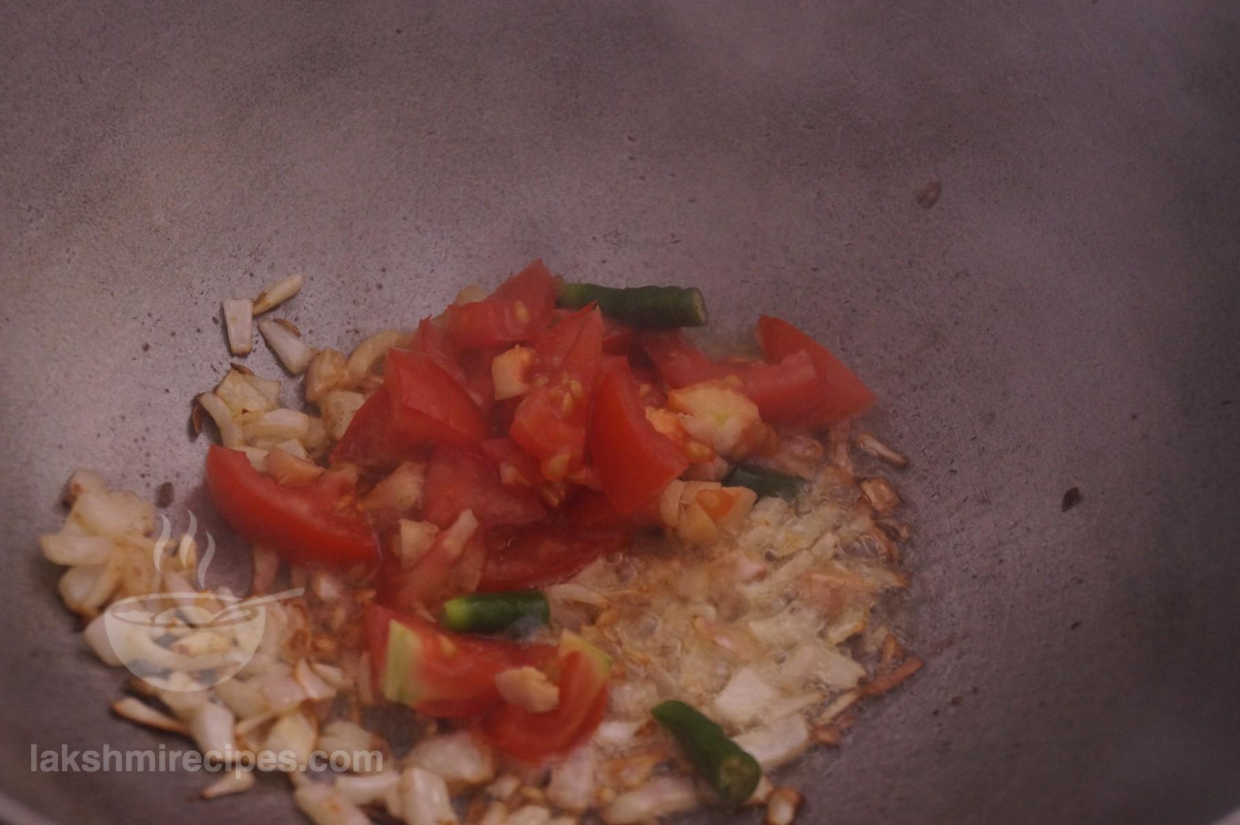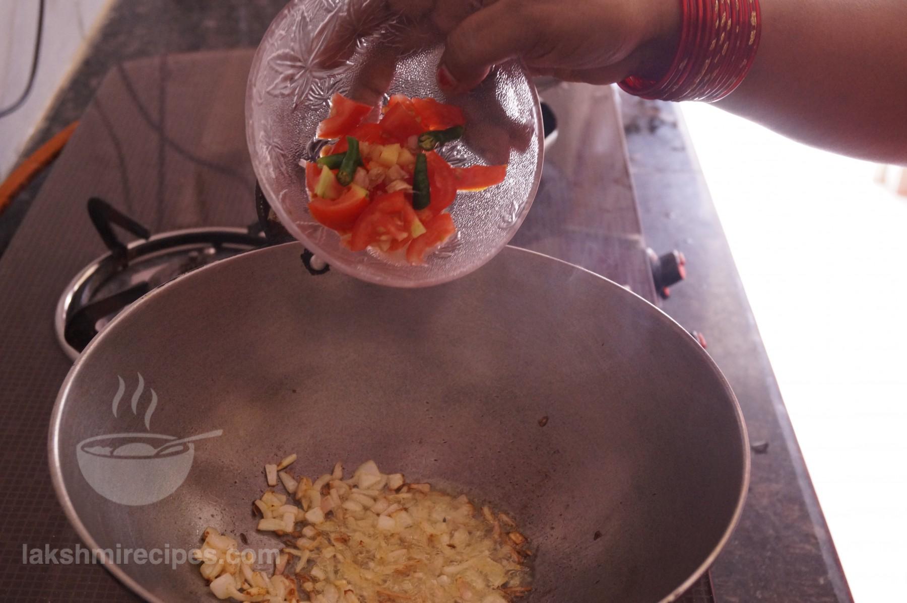 - Now add the chopped ginger (adrak), green chilli (hari mirch) and tomato. Sprinkle a little salt which will help to cook the tomato.