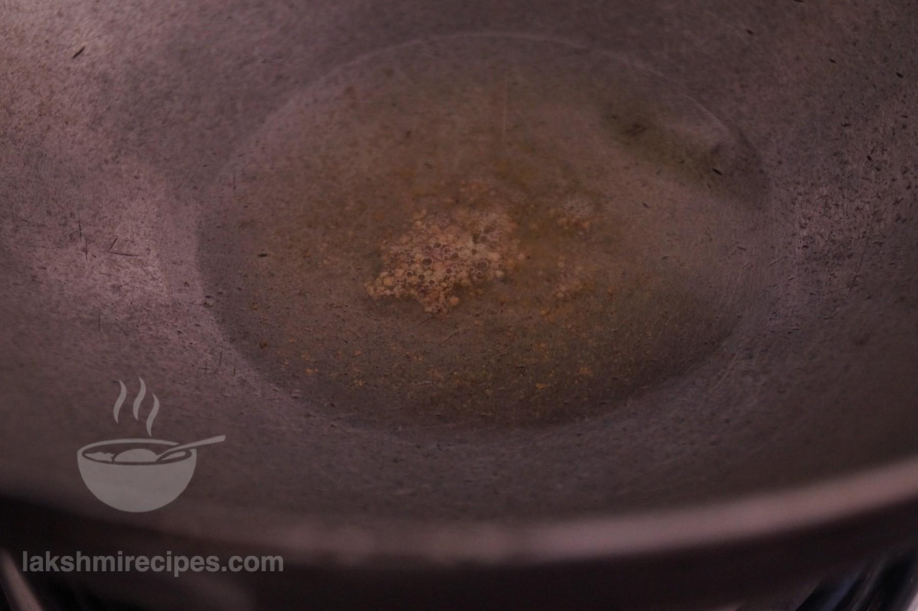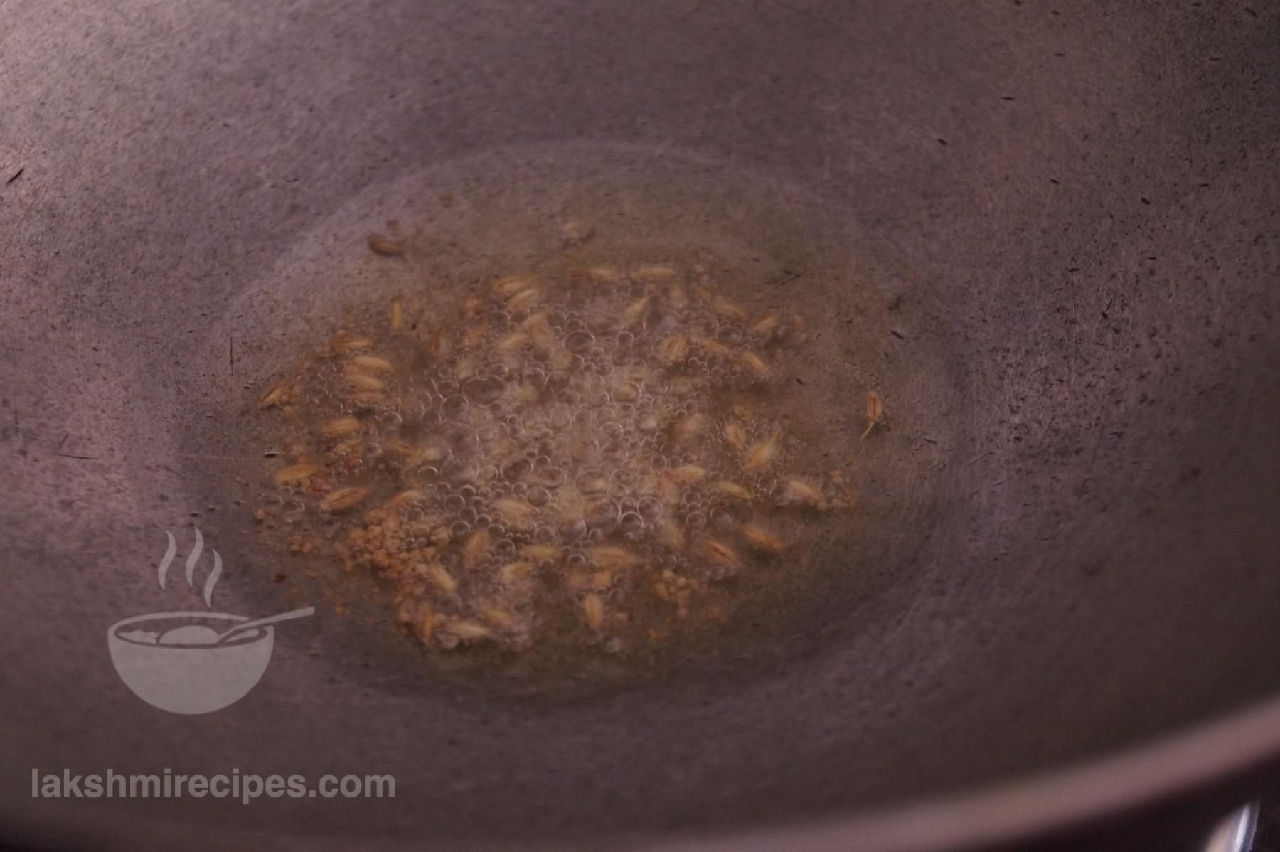 - Heat the desi ghee in deep kadhai and first add asafoetida (hing powder) to it, followed by the cumin seeds (jeera). Allow the cumin seeds (jeera) to crackle and turn red.