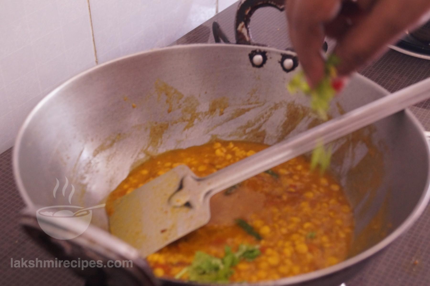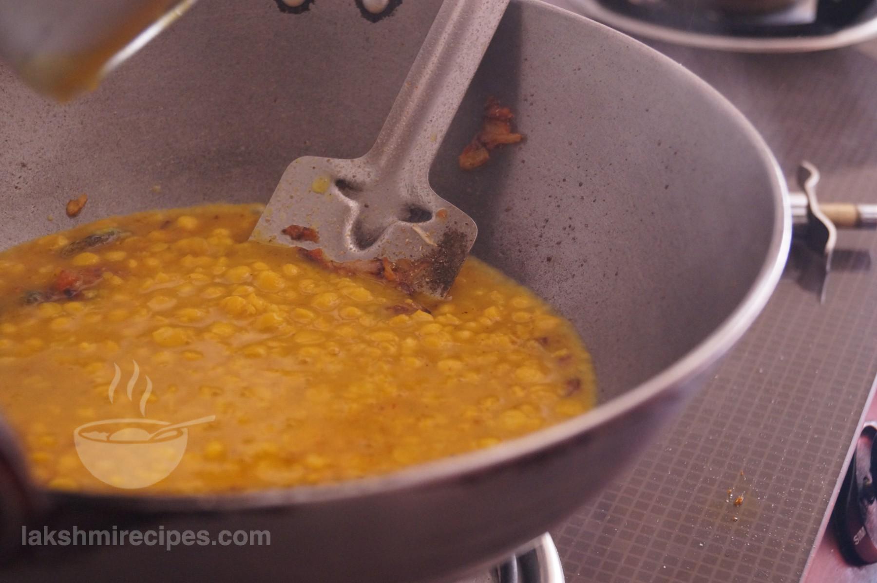 - Now transfer the contents of the cooker to the kadhai. Stir and allow it to boil for 2 minutes so that the masala prepared mixes uniformly with the dal.