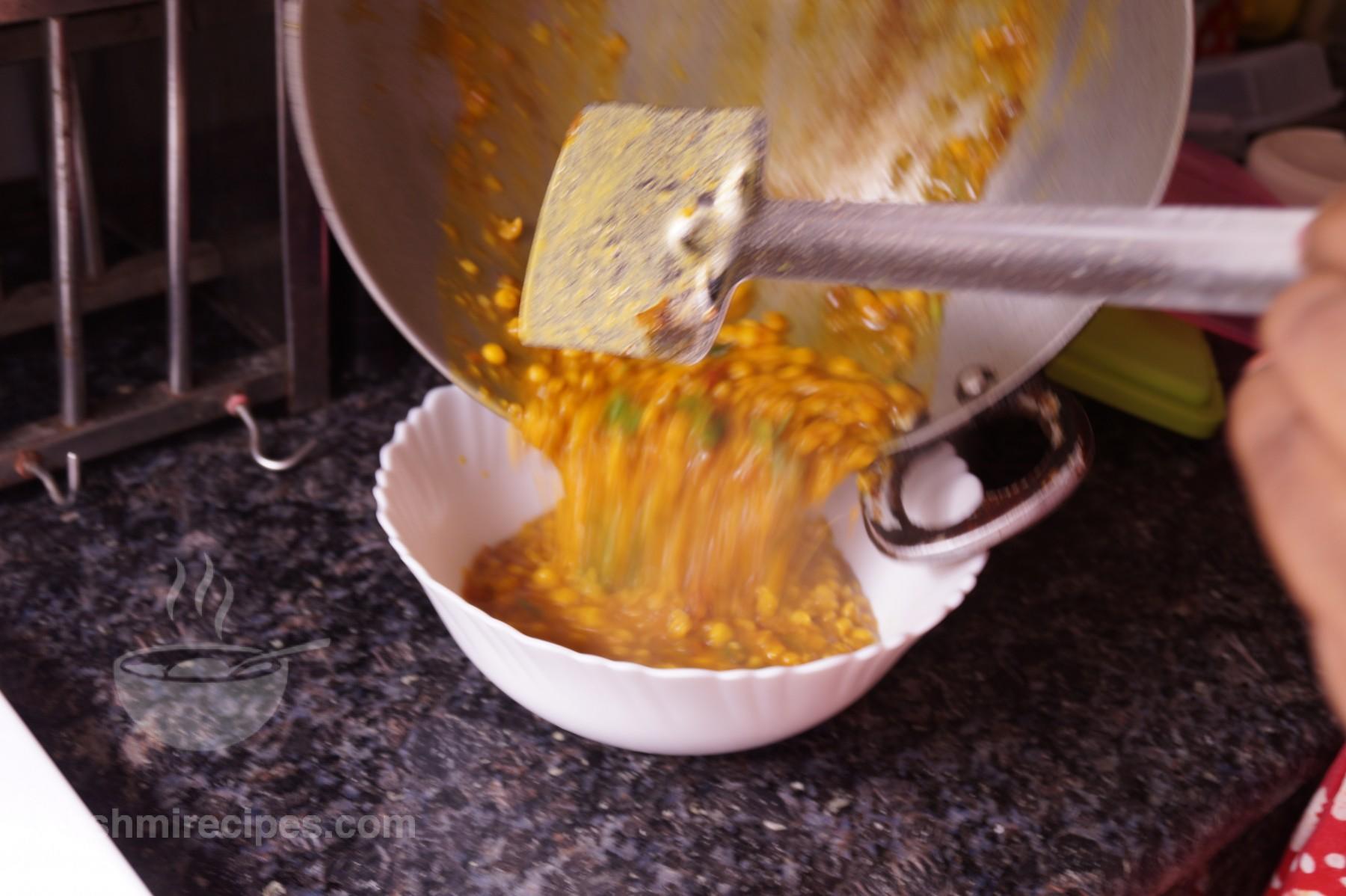 - Turn off the flame, and transfer the chana dal fry to beautiful serving bowl. Garnish with chopped coriander leaves (hara dhaniya patti) and 1 tea spoon desi ghee. Serve hot with steamed rice or chapati.
