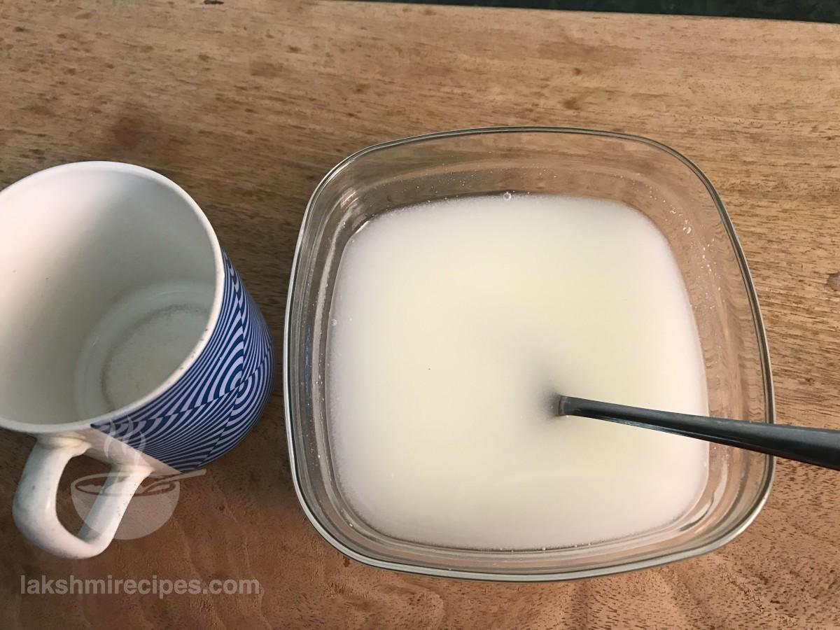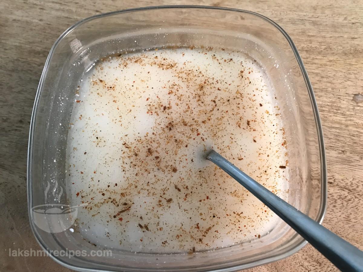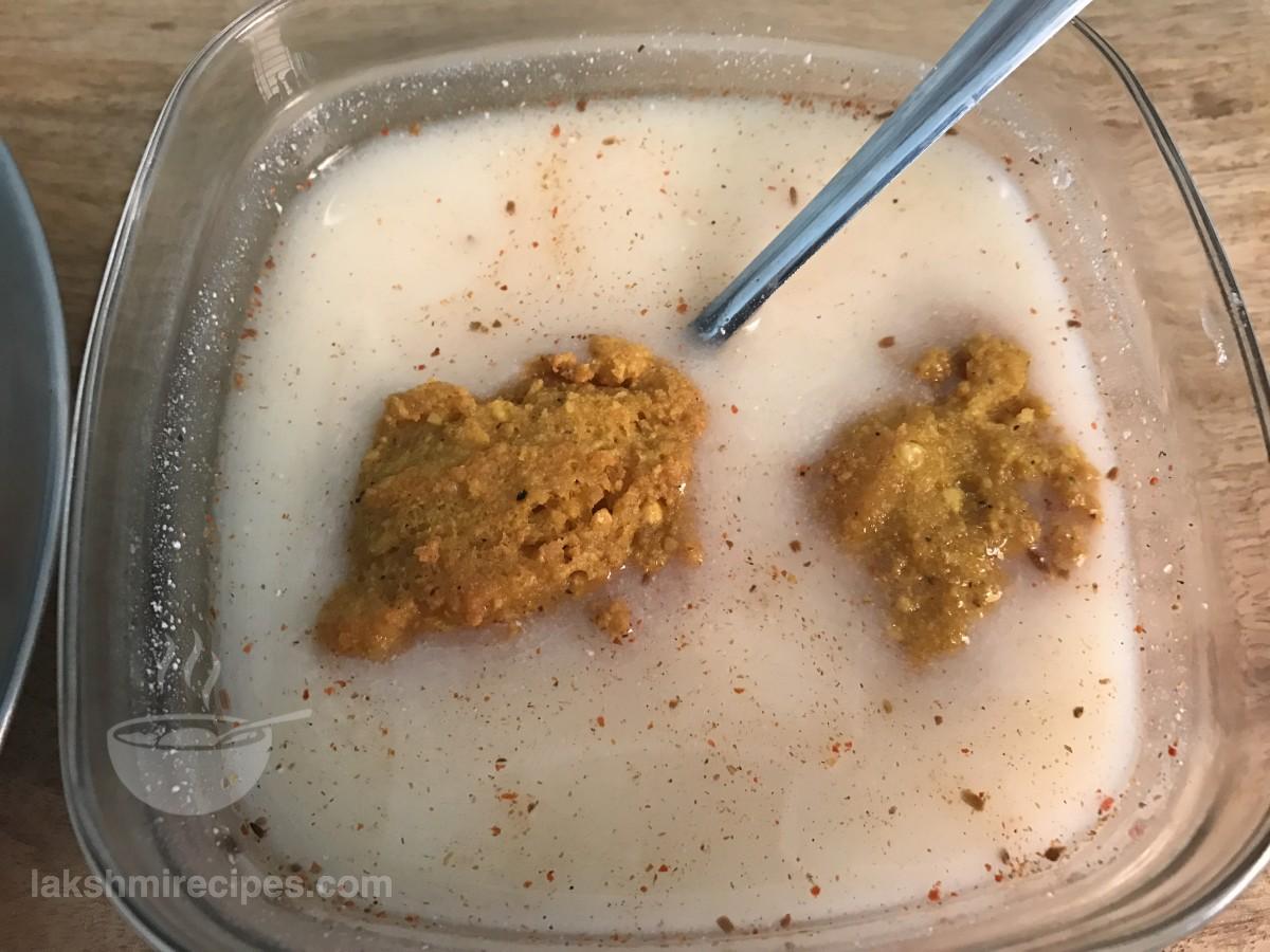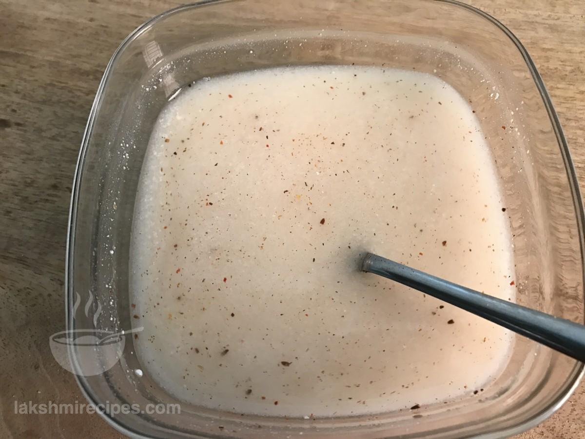 - अब एक अलग कटोरे में दही लें और उसमें नमक, भुना हुआ जीरा और सूखे लाल मिर्च का पाउडर डालें और अच्छी तरह से सभी सामग्री मिक्स करें। इसमें 1 कप पानी डालें और फिर से मिलाएं ताकि एक पतला घोल बनजाए।