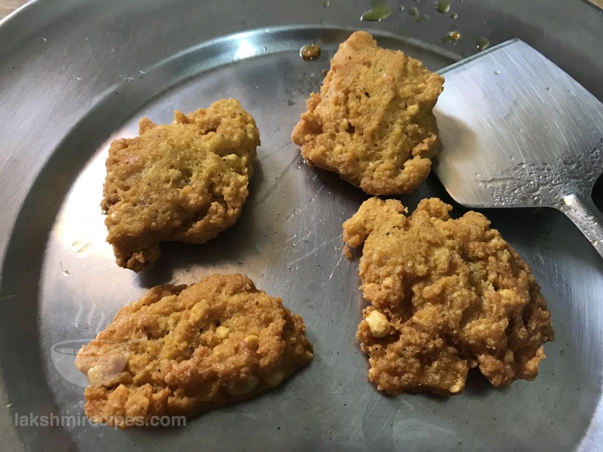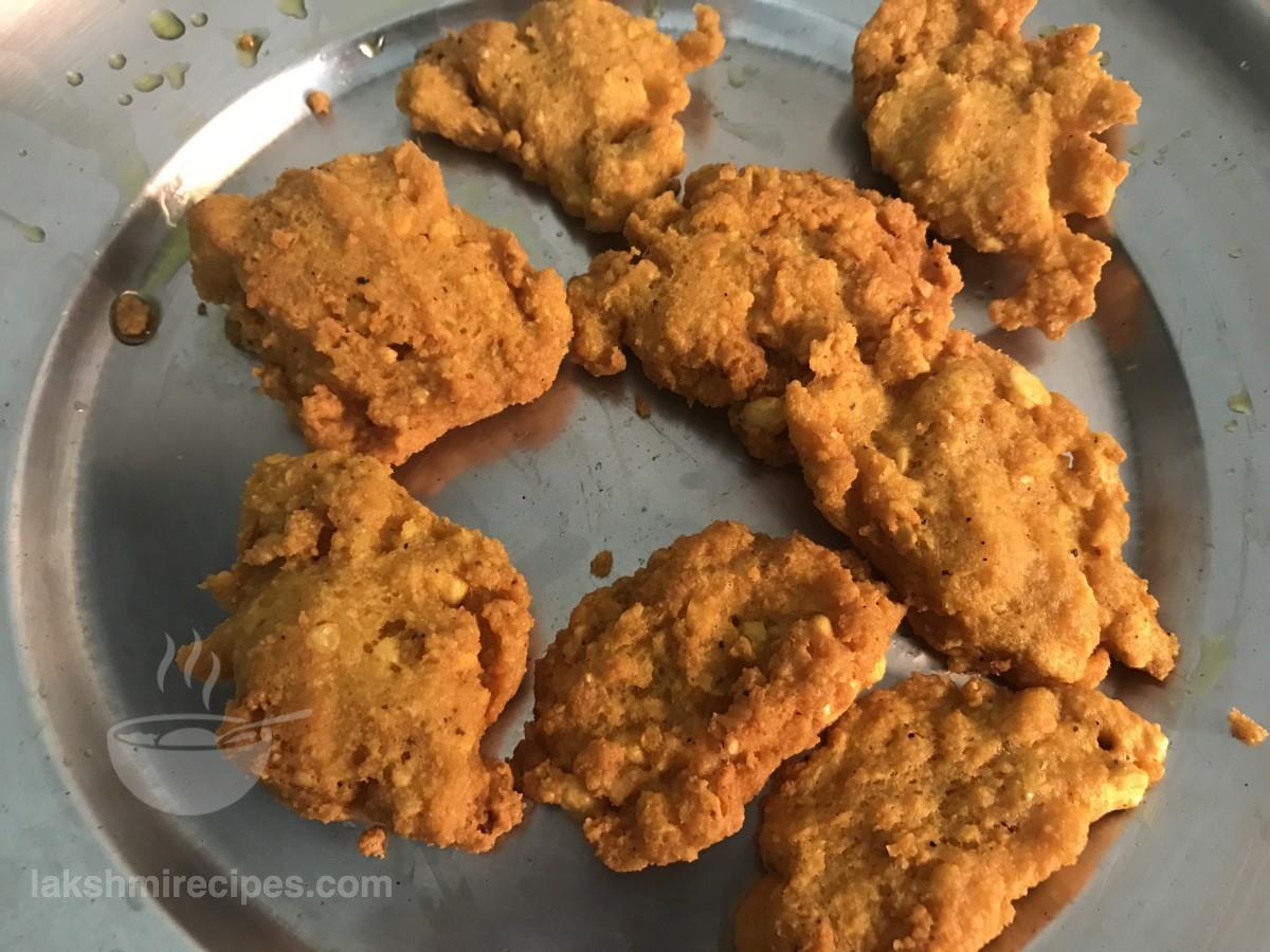 - फिर चना दाल के पेस्ट (जैसा कि नीचे की छवि में दिखाया गया है) के छोटे पकौड़ी बनाएं और उन्हें गर्म तेल में तलने केलिए डालें। तली हुई पकौड़ी को एक प्लेट में निकाल लें और इसी तरीके से शेष पेस्ट की पकौड़ी तैयार करें।