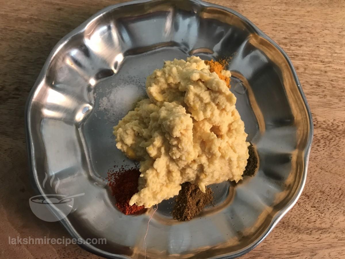 - Transfer the paste of Bengal gram to a plate and add salt, turmeric powder, red chilli powder, cumin seeds powder and black pepper powder to it. Mix all the ingredients well.