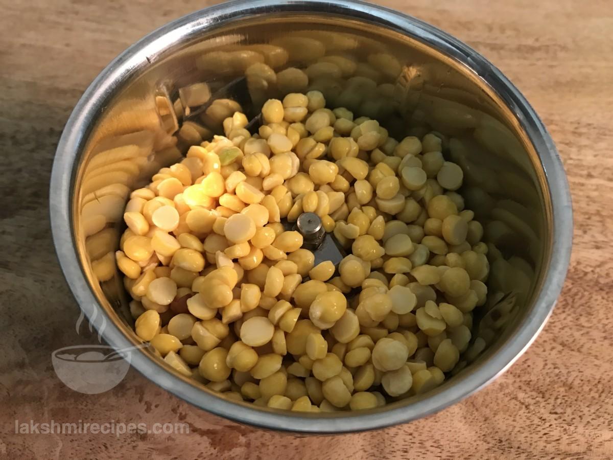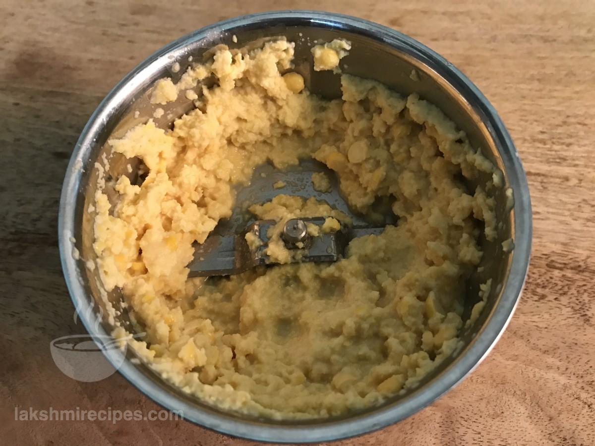 - चना दाल को 4 घंटे के लिए सादे पानी में भिगोने के बाद साफ पानी के साथ अच्छी तरह से धो लें। फिर चना दाल को मिक्सर जार में डालें और 2-3 बड़ा चम्मच पानी डालकर पीसलें और एक मध्यम मोटा पेस्ट बना लें।