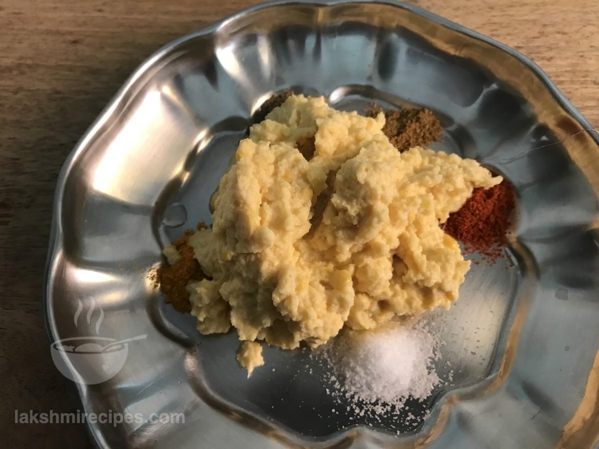 - एक प्लेट में चना दाल का पेस्ट को निकालें और इसमें नमक, हल्दी पाउडर, लाल मिर्च पाउडर, जीरा पाउडर और काली मिर्च पाउडर डालें। फिर सभी सामग्री को अच्छी तरह से मिक्स करें।