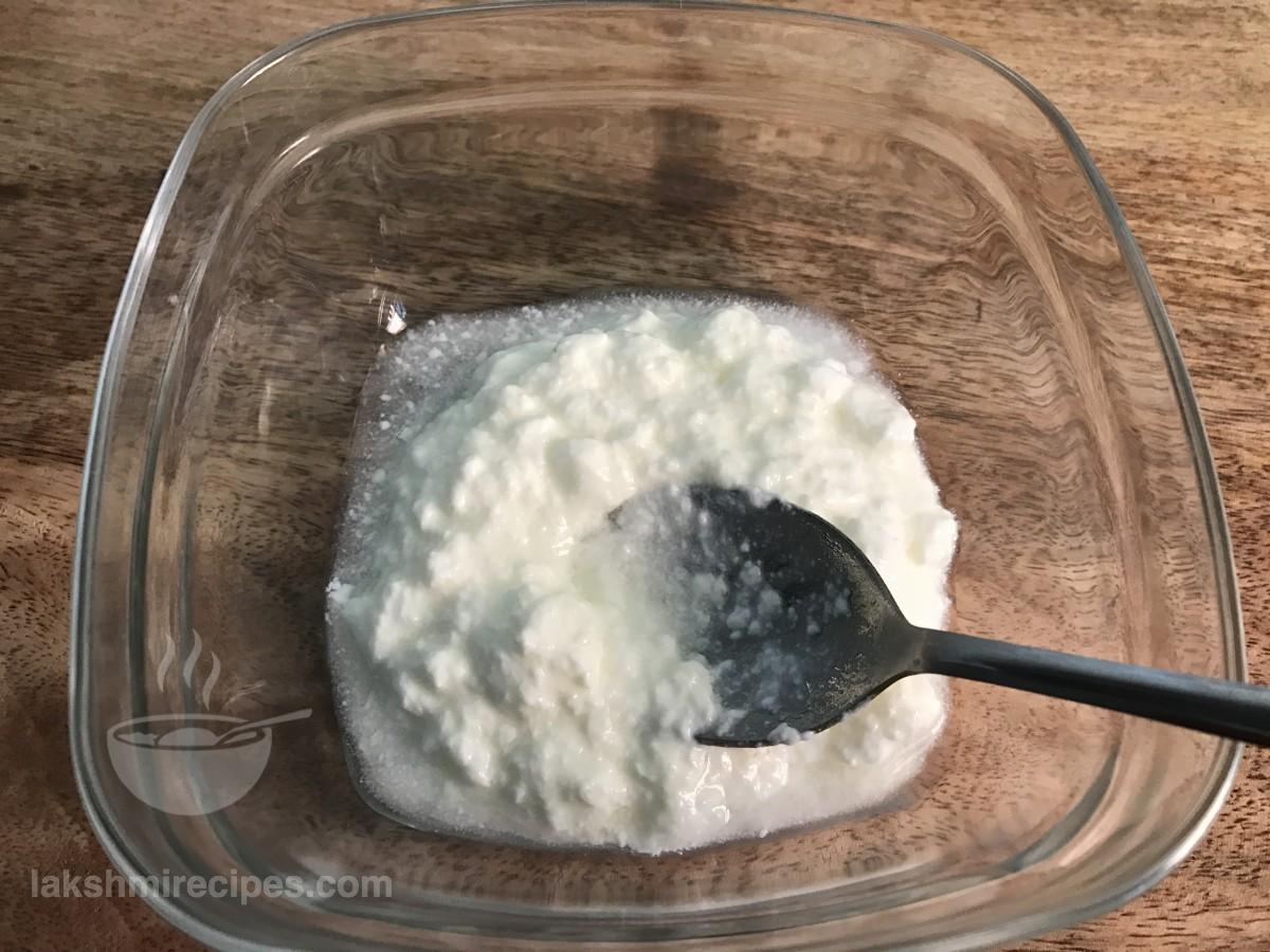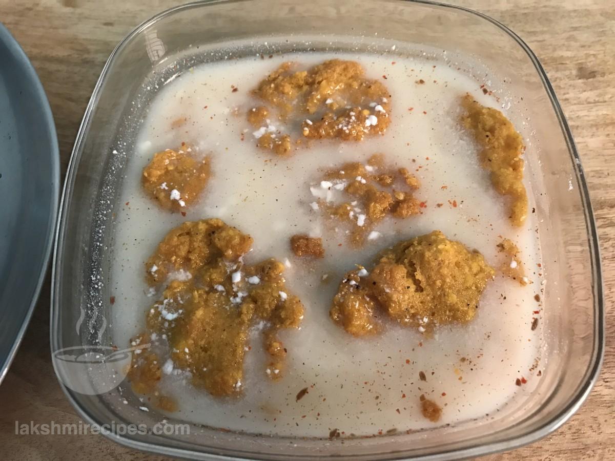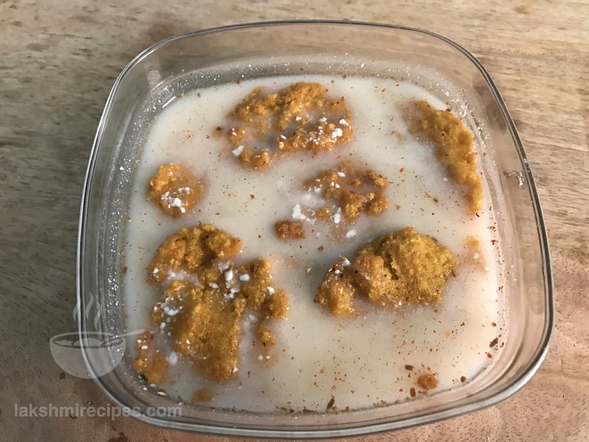 (Tips: The amount of salt should be slightly less than required in the Bengal gram paste while preparing the dumplings, because the fried dumplings are transfered to the curd mixture. The curd mixture has enough salt in it and it is absorbed by the fried dumplings.)