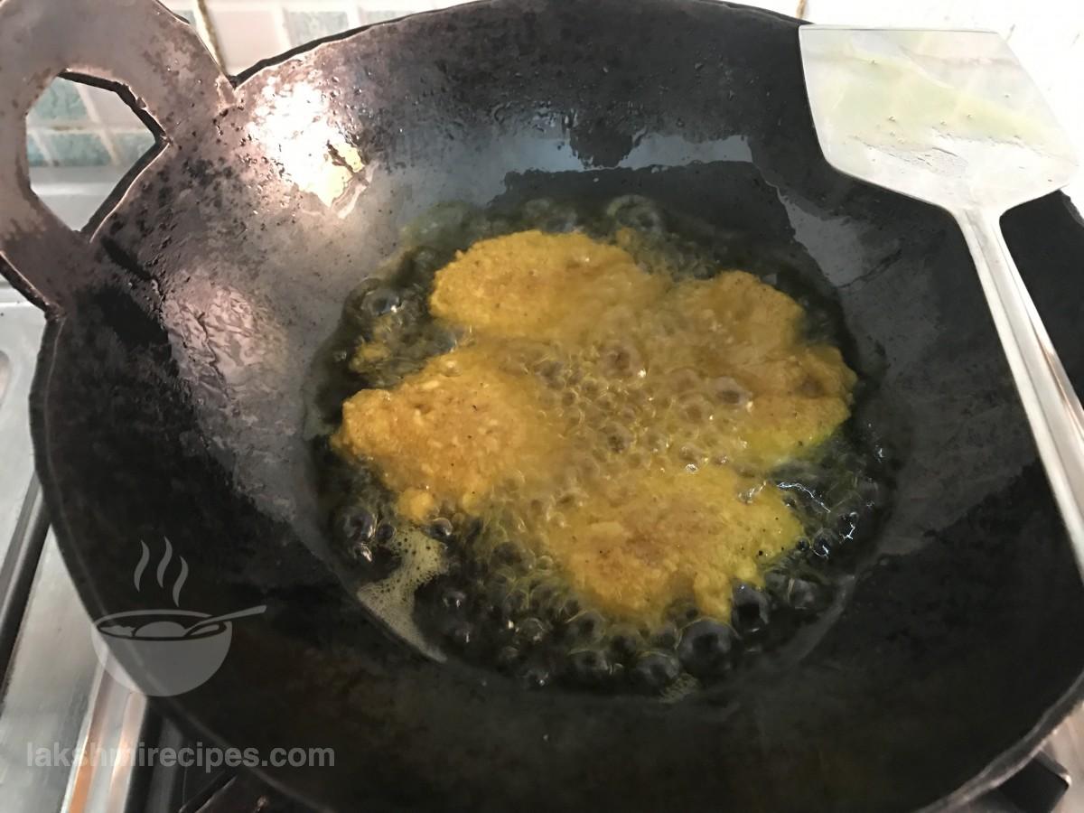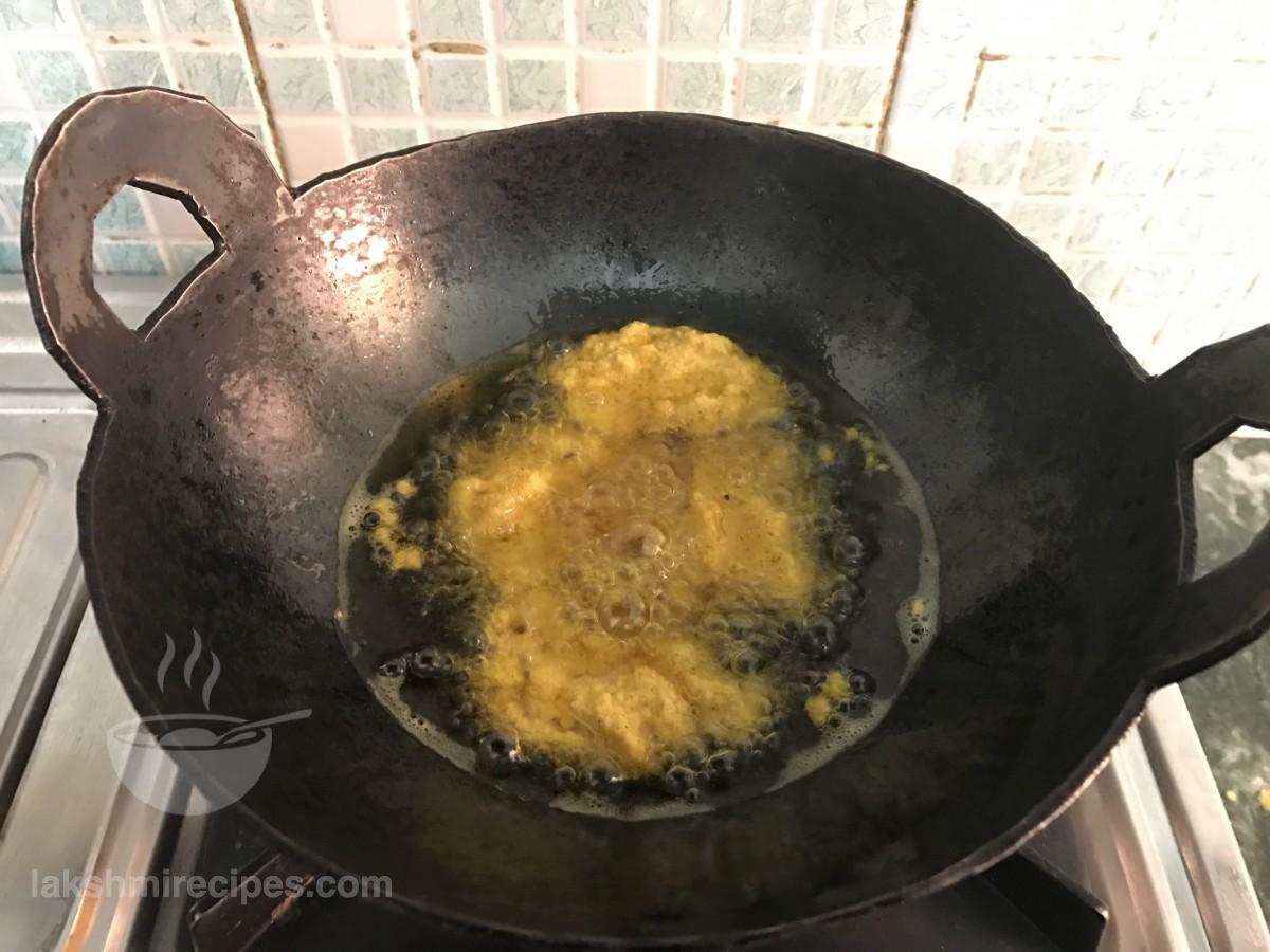 - Then form small dumplings of the Bengal gram paste (as shown in the image below) and set them to deep fry in the hot oil. Transfer the fried dumplings to a plate. Prepare dumplings of the remaining paste in the same manner.