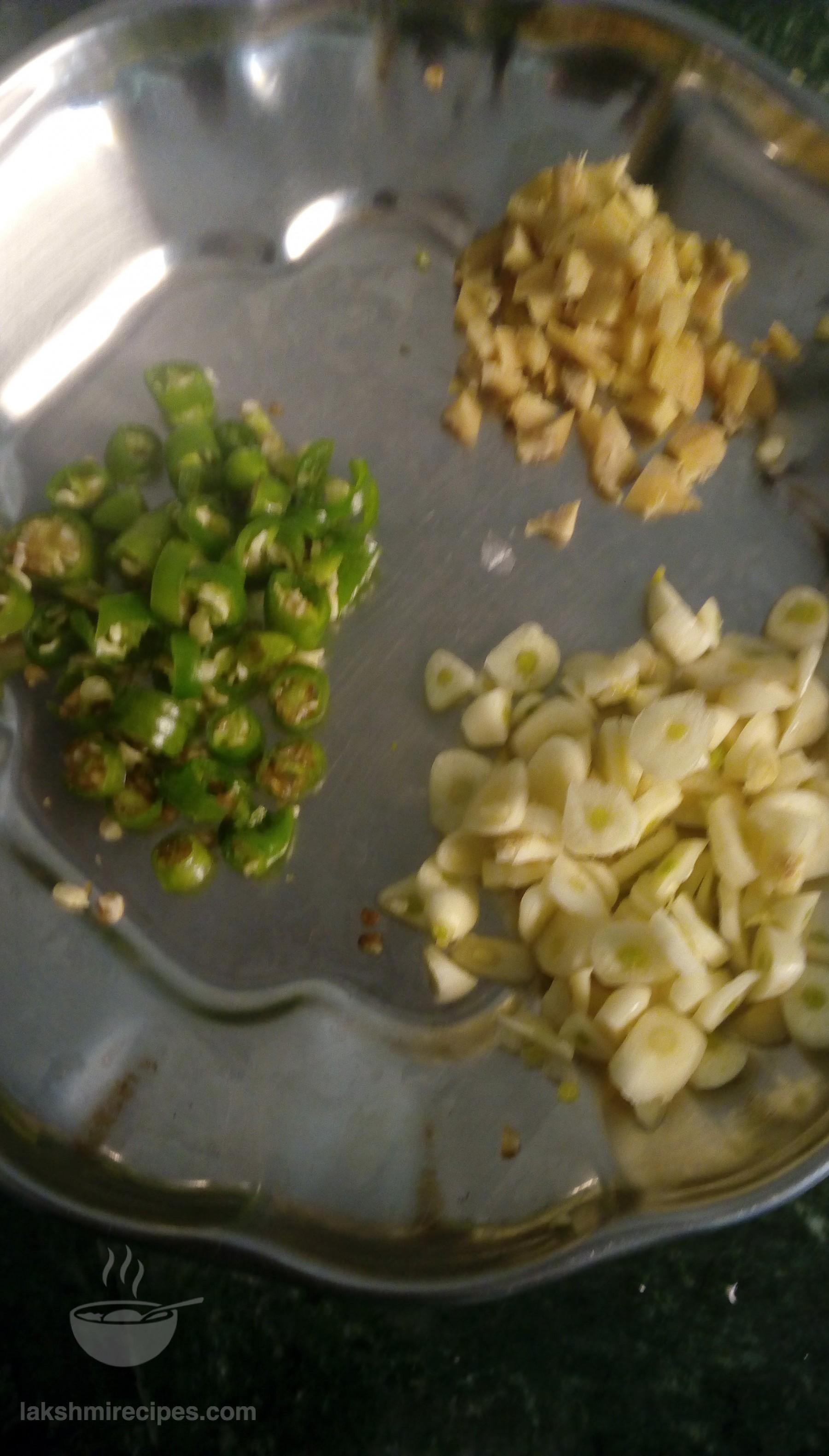- Chop the garlic petals (lehsun ki kali), ginger (adrak) and green chillis (hari mirch) into small pieces.