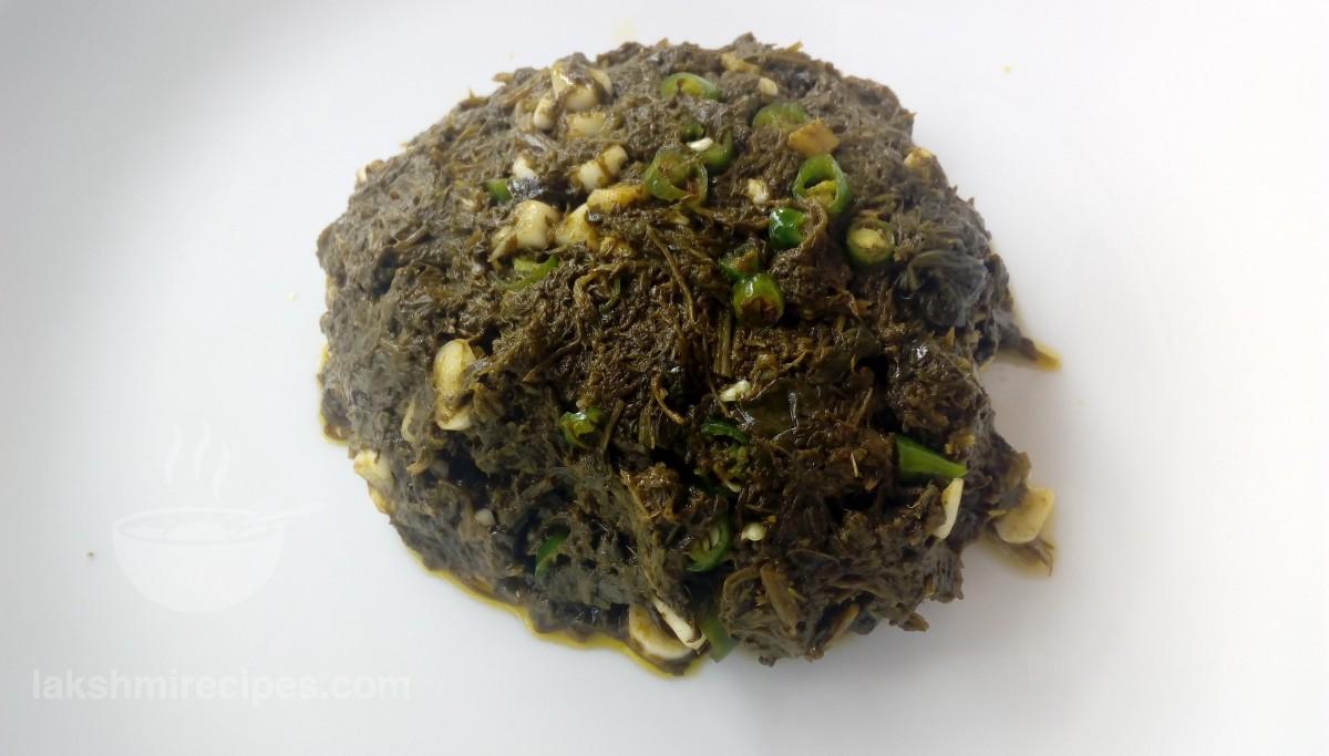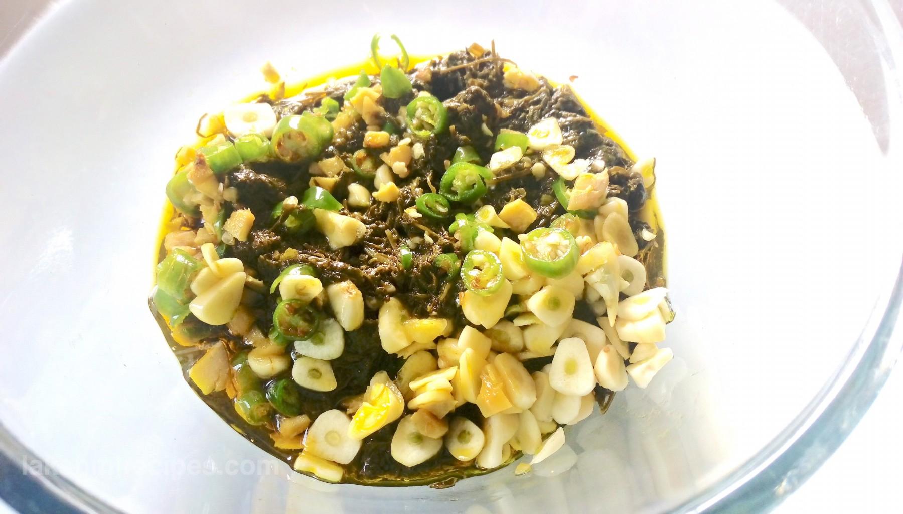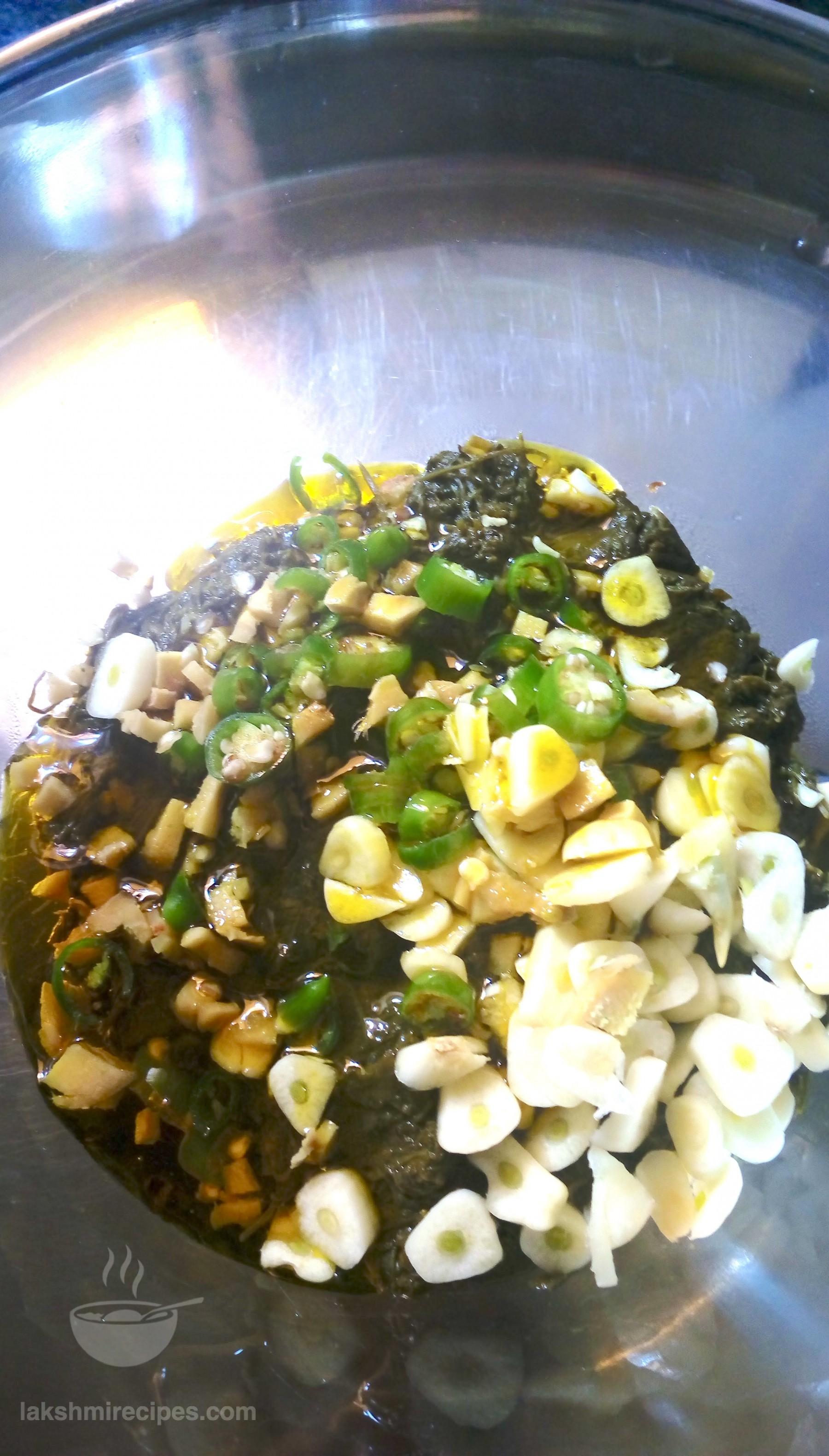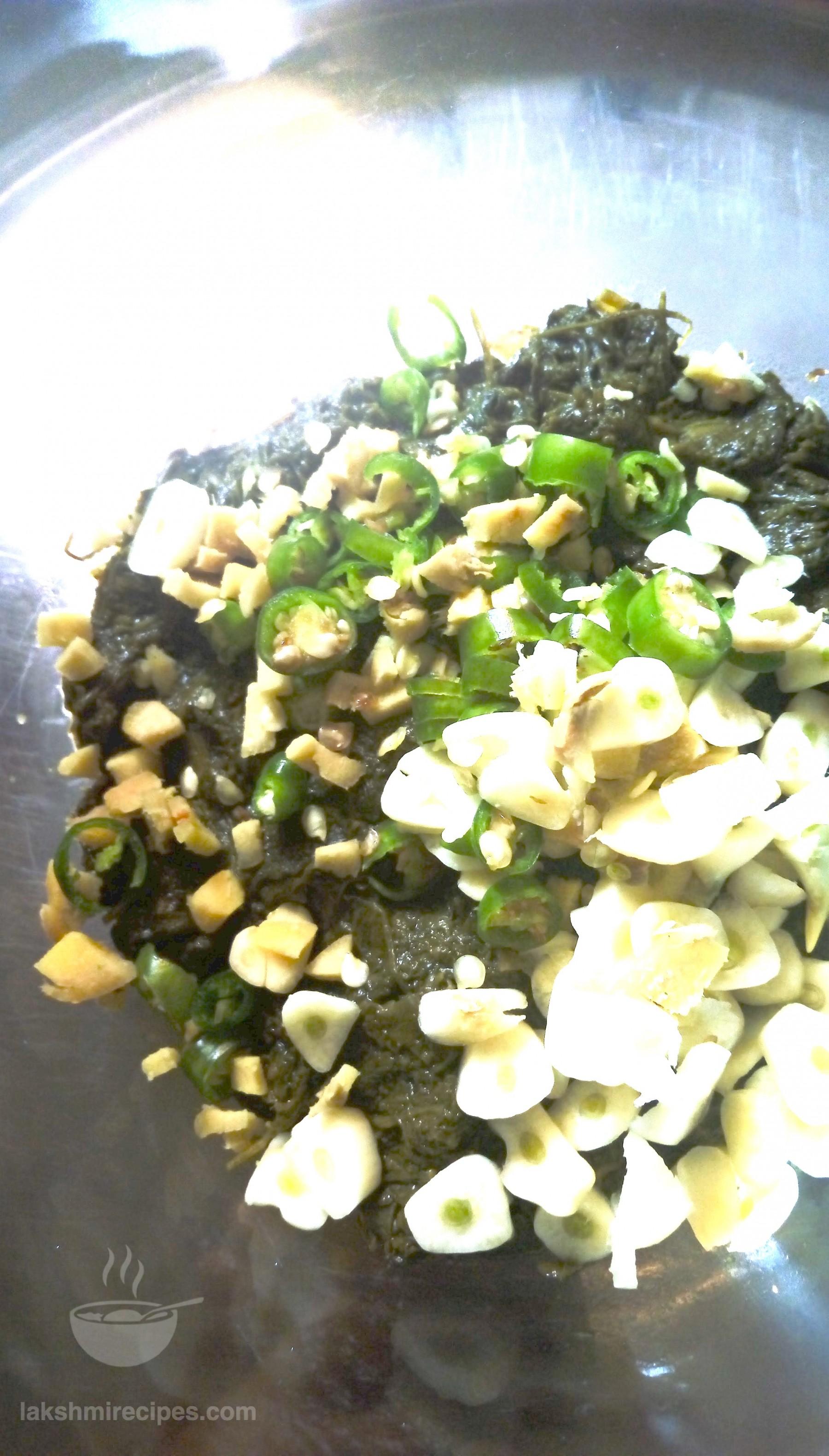 - Add chopped garlic petals (lehsun ki kali), ginger (adrak) and green chilli (hari mirch) to the mashed saag.