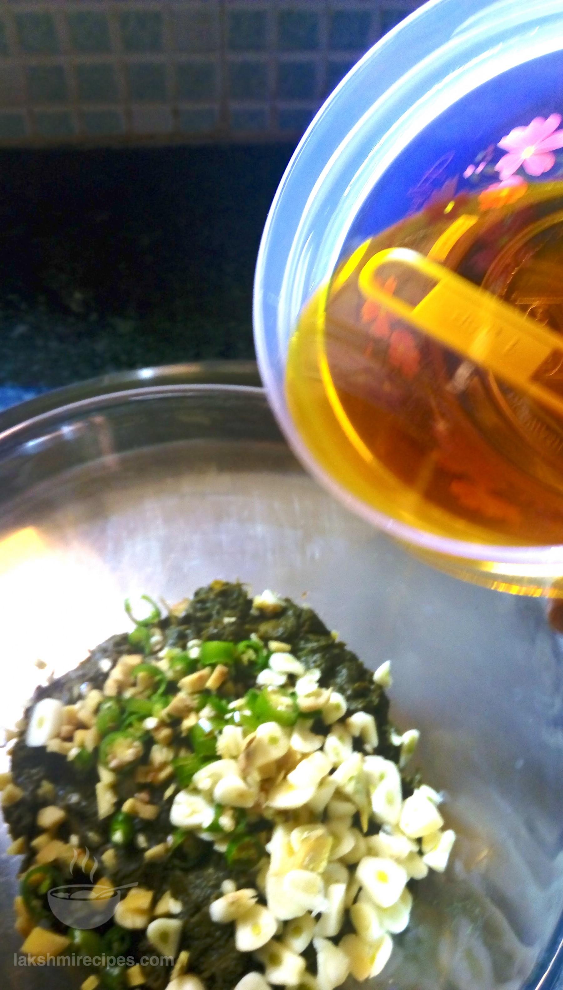 - Now add 2 table spoon mustard oil (sarson ka tel) to the saag and mix all the ingredients well with hands.