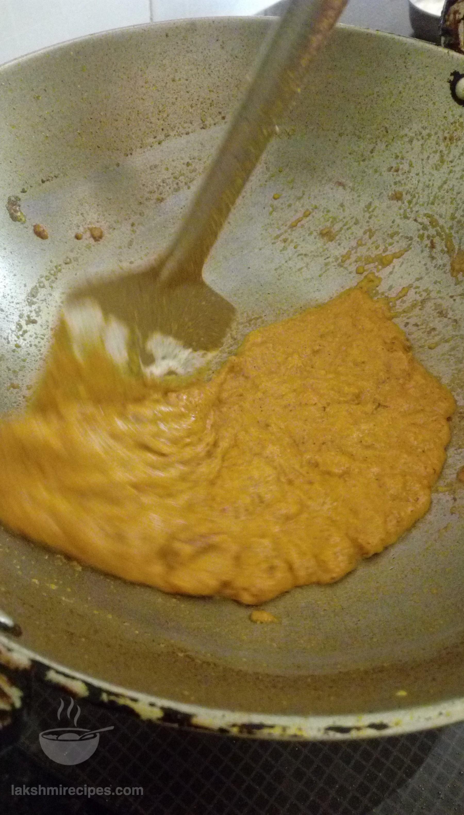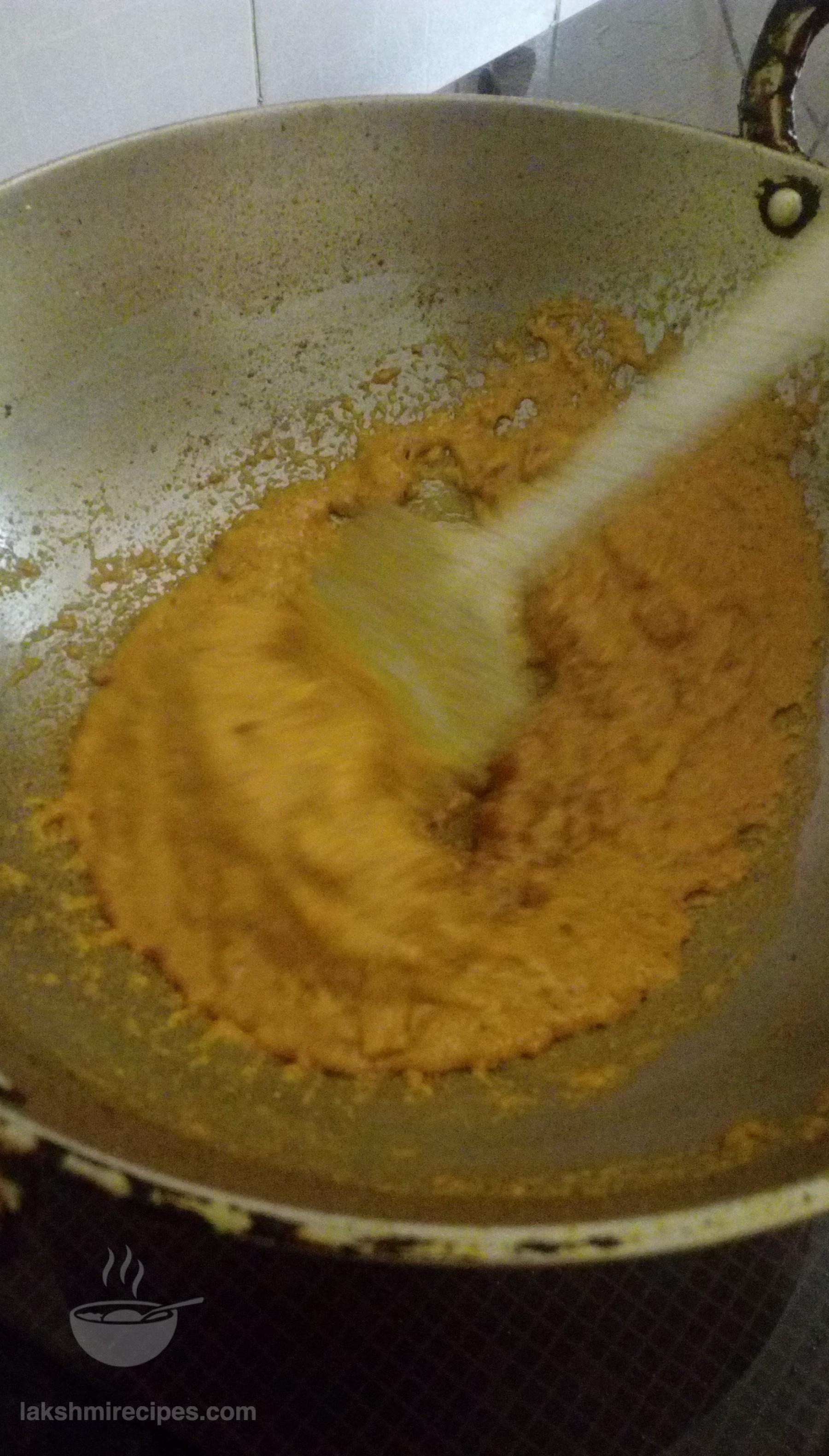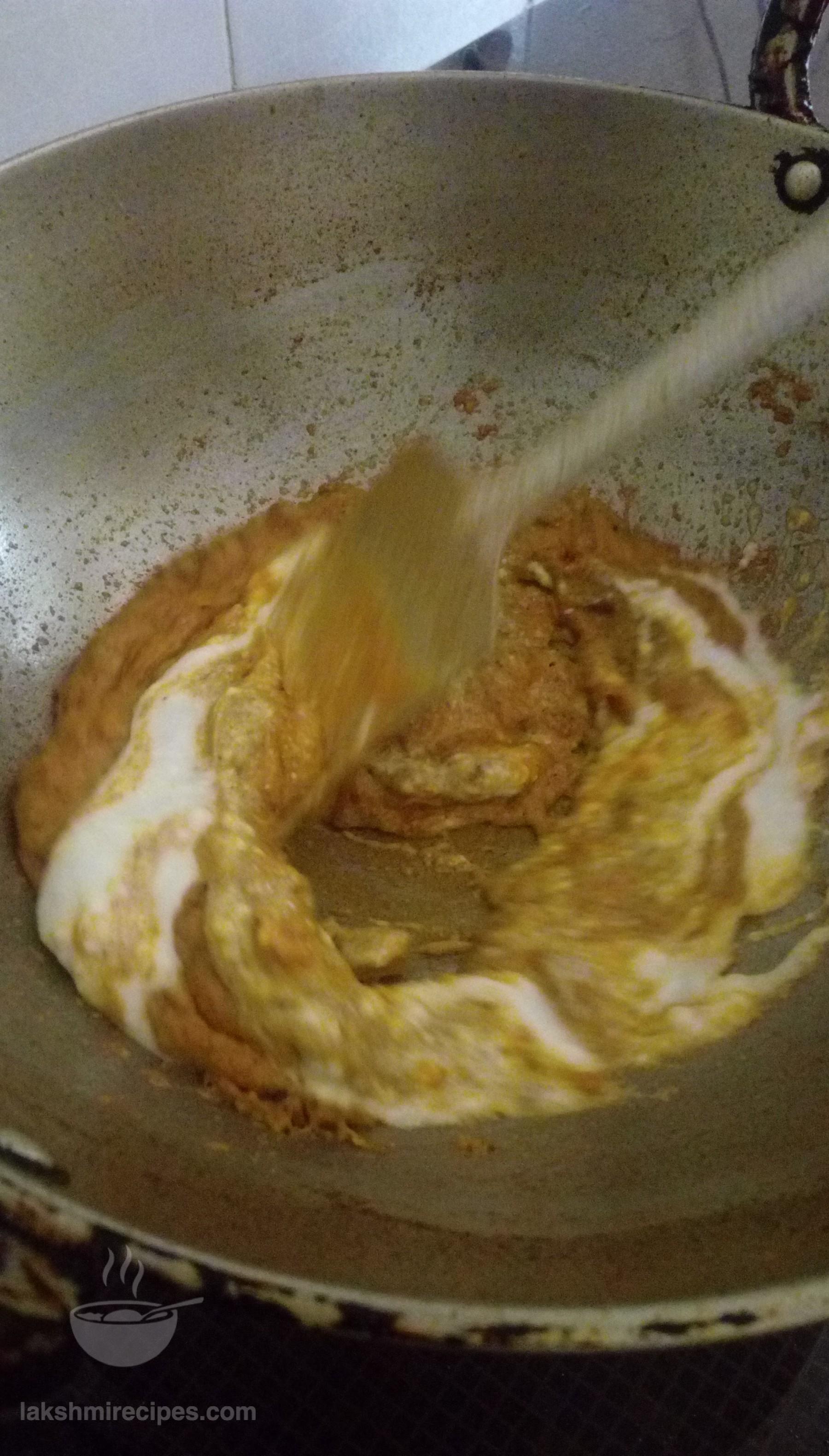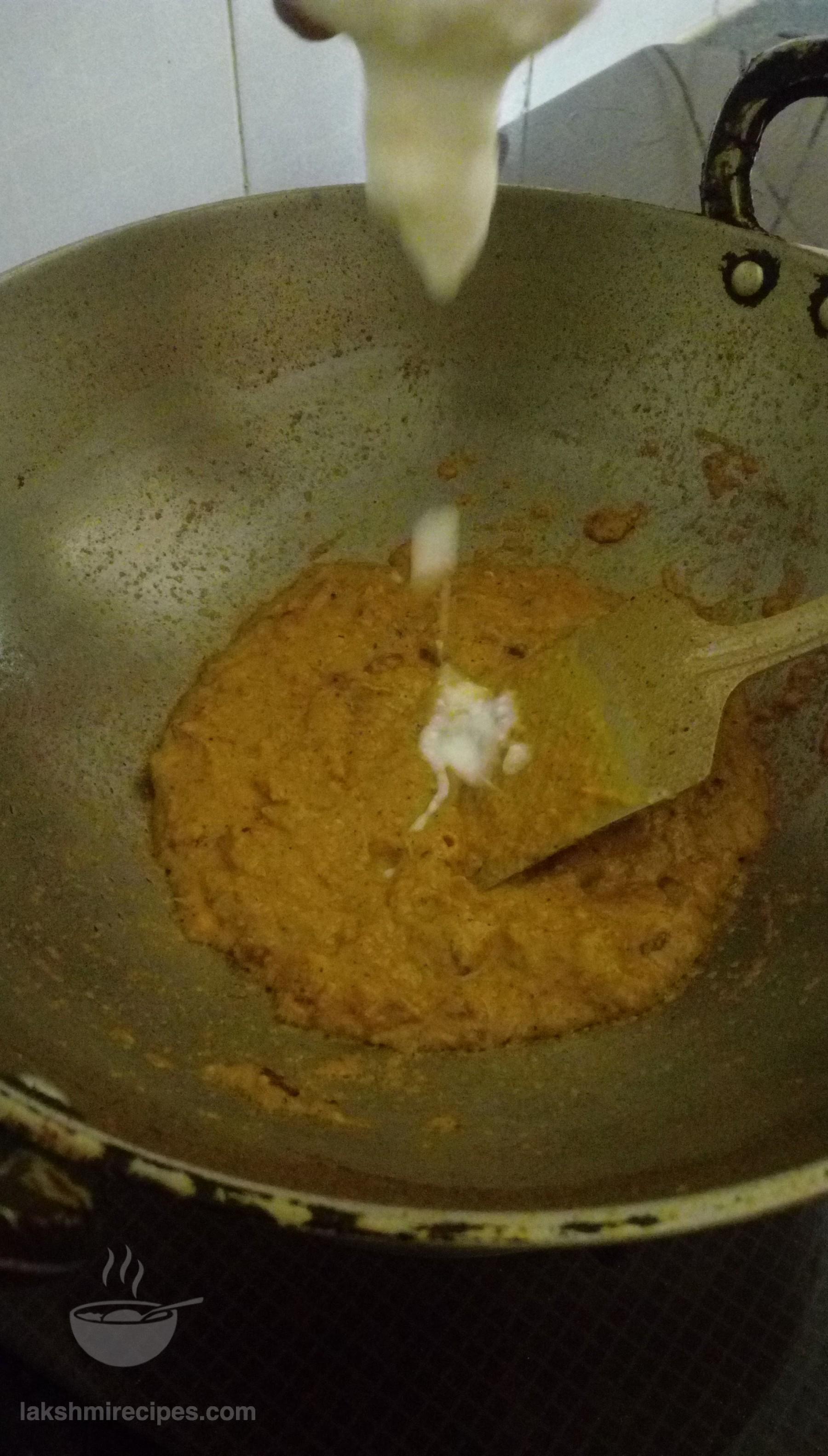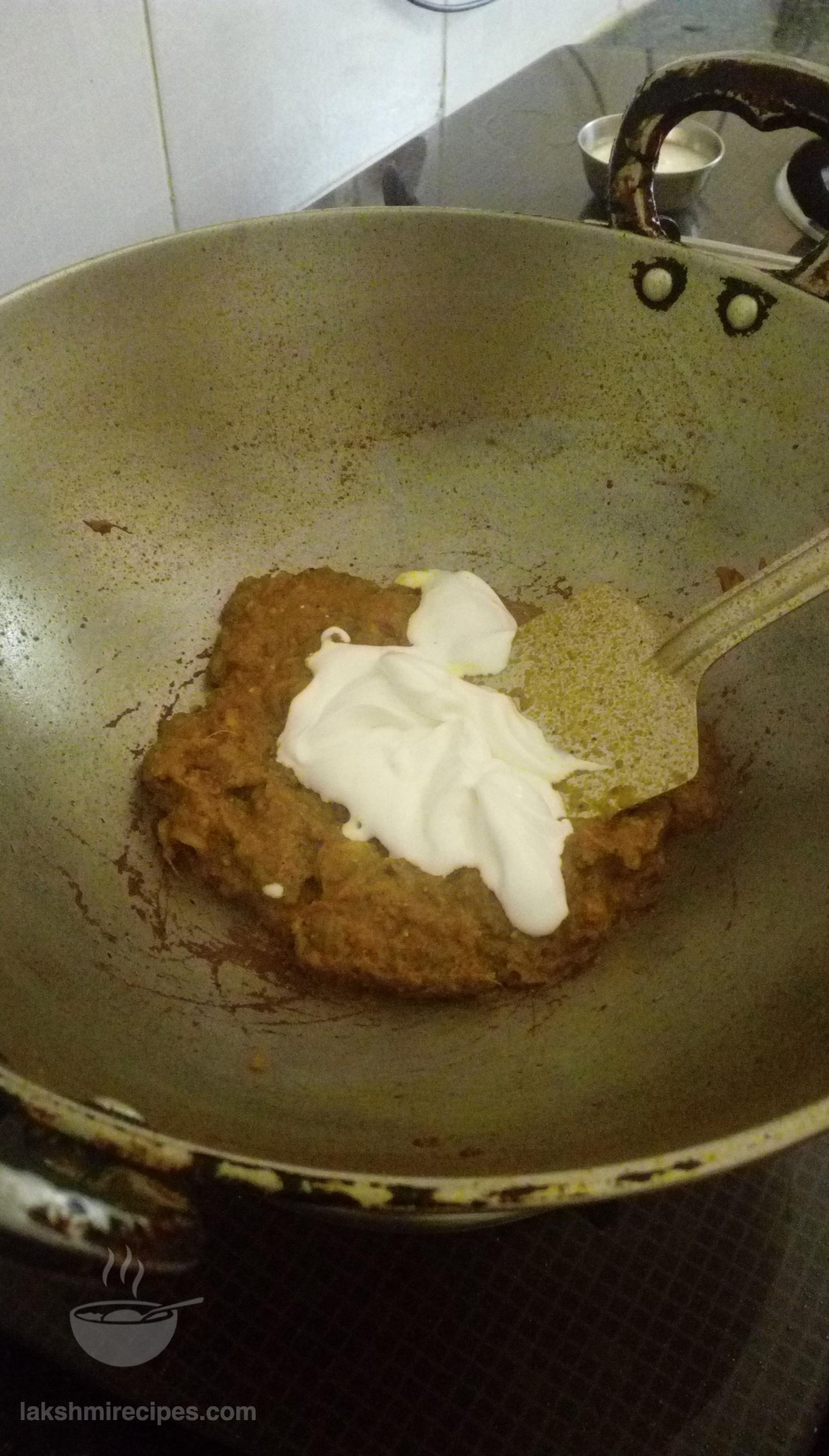 - When the oil begins to seperate from the masala paste, add curd (dahi) to the kadhai and stir rigorously to avoid any lump formation.