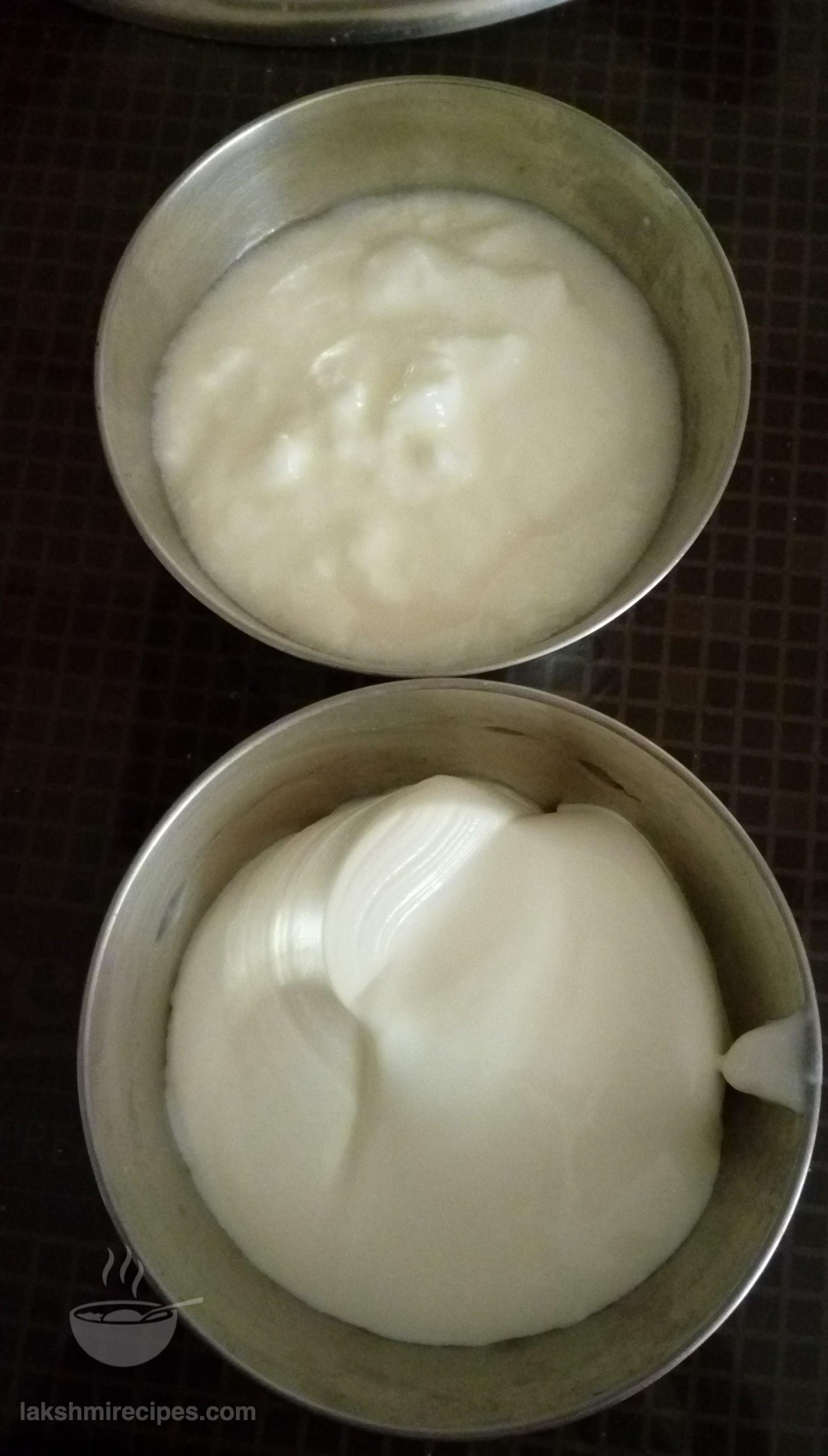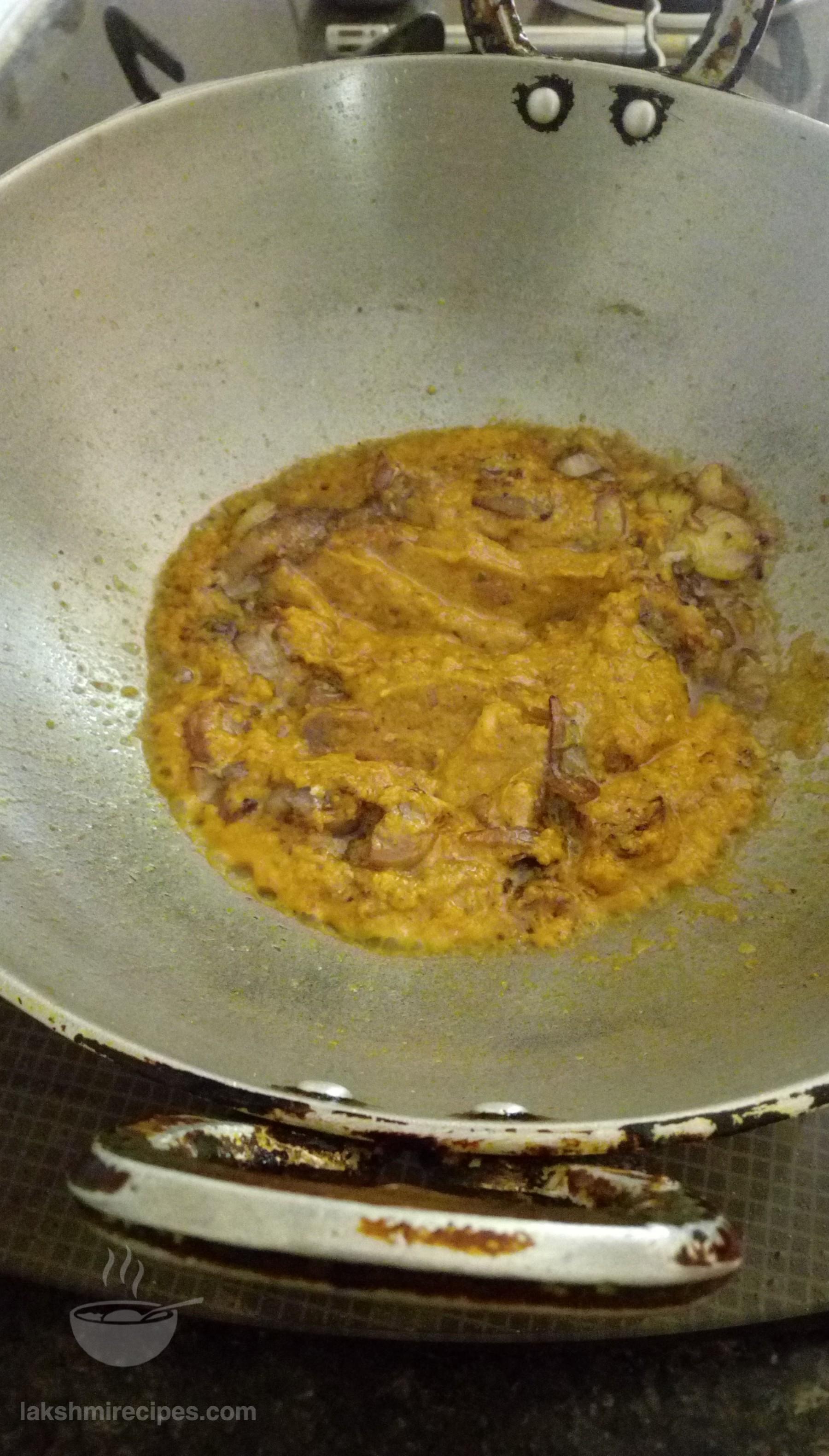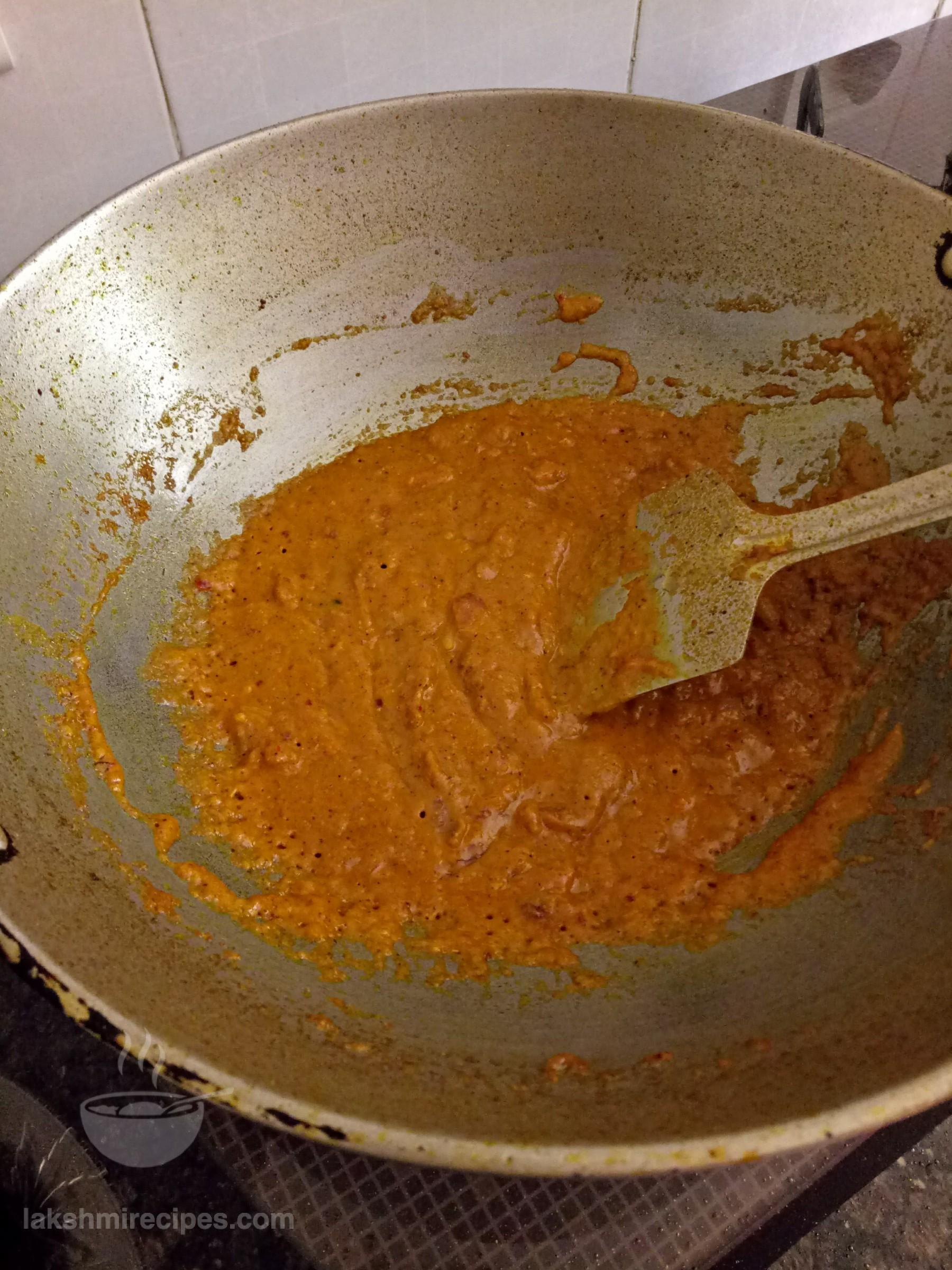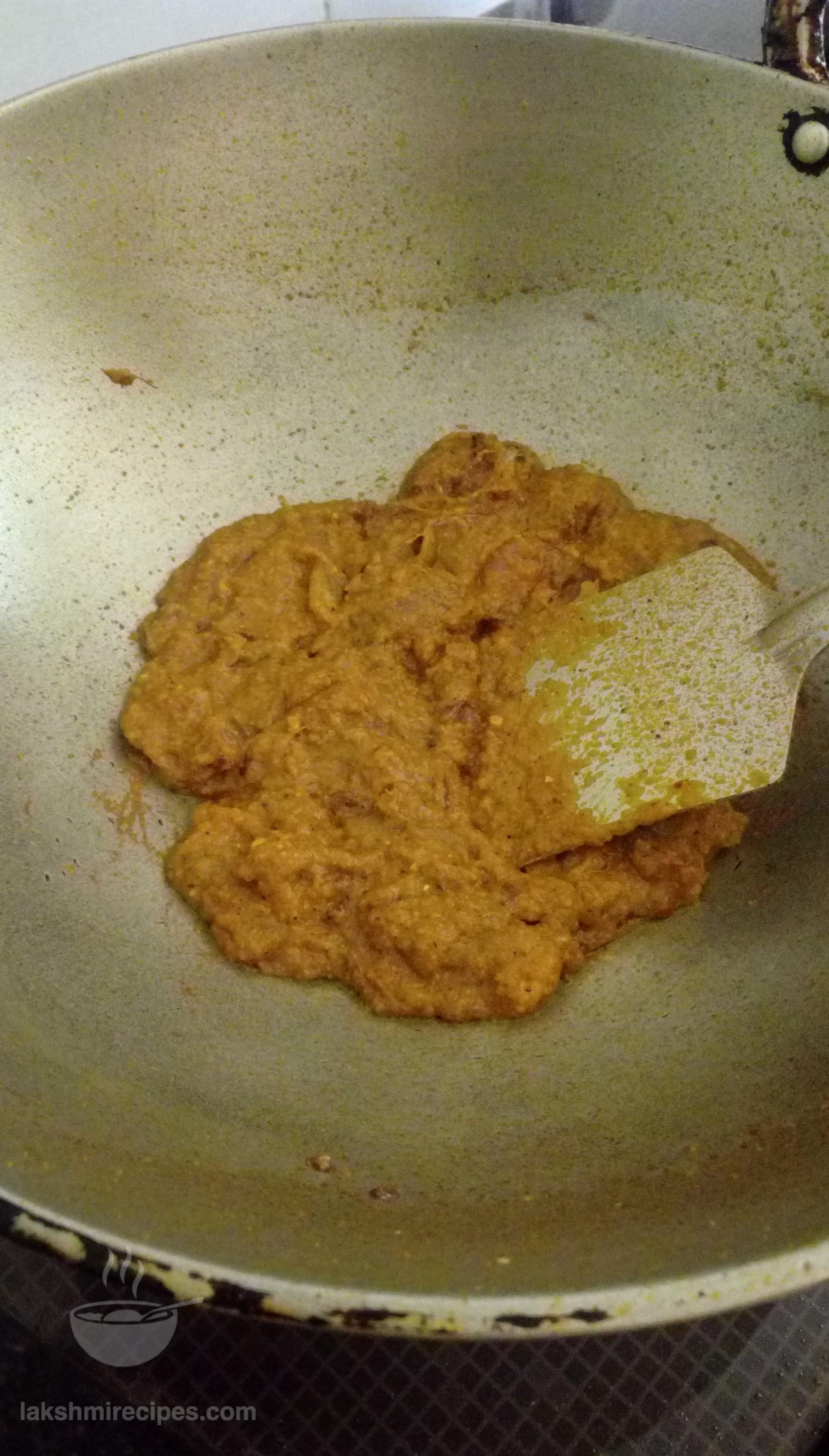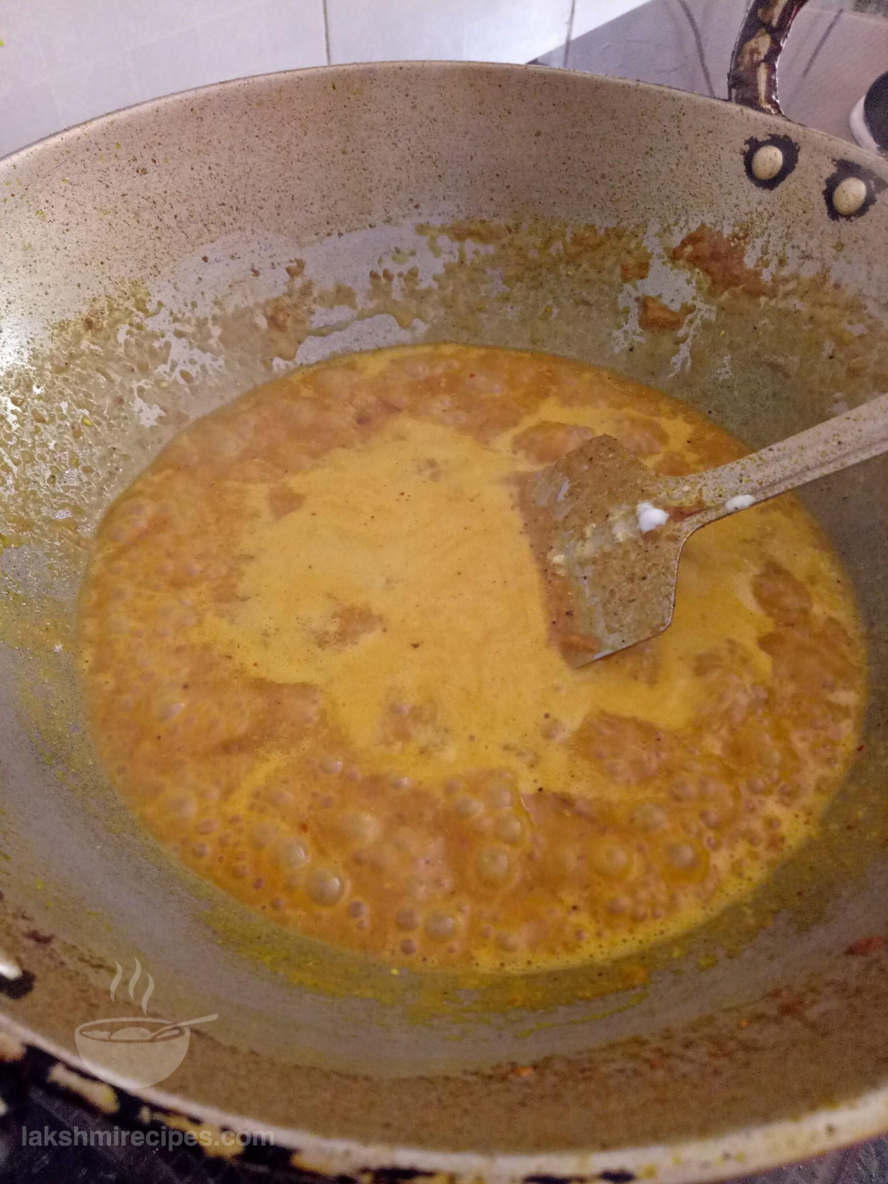 - When the oil begins to seperate from the masala paste, add curd (dahi) to the kadhai and stir rigorously to avoid any lump formation.
