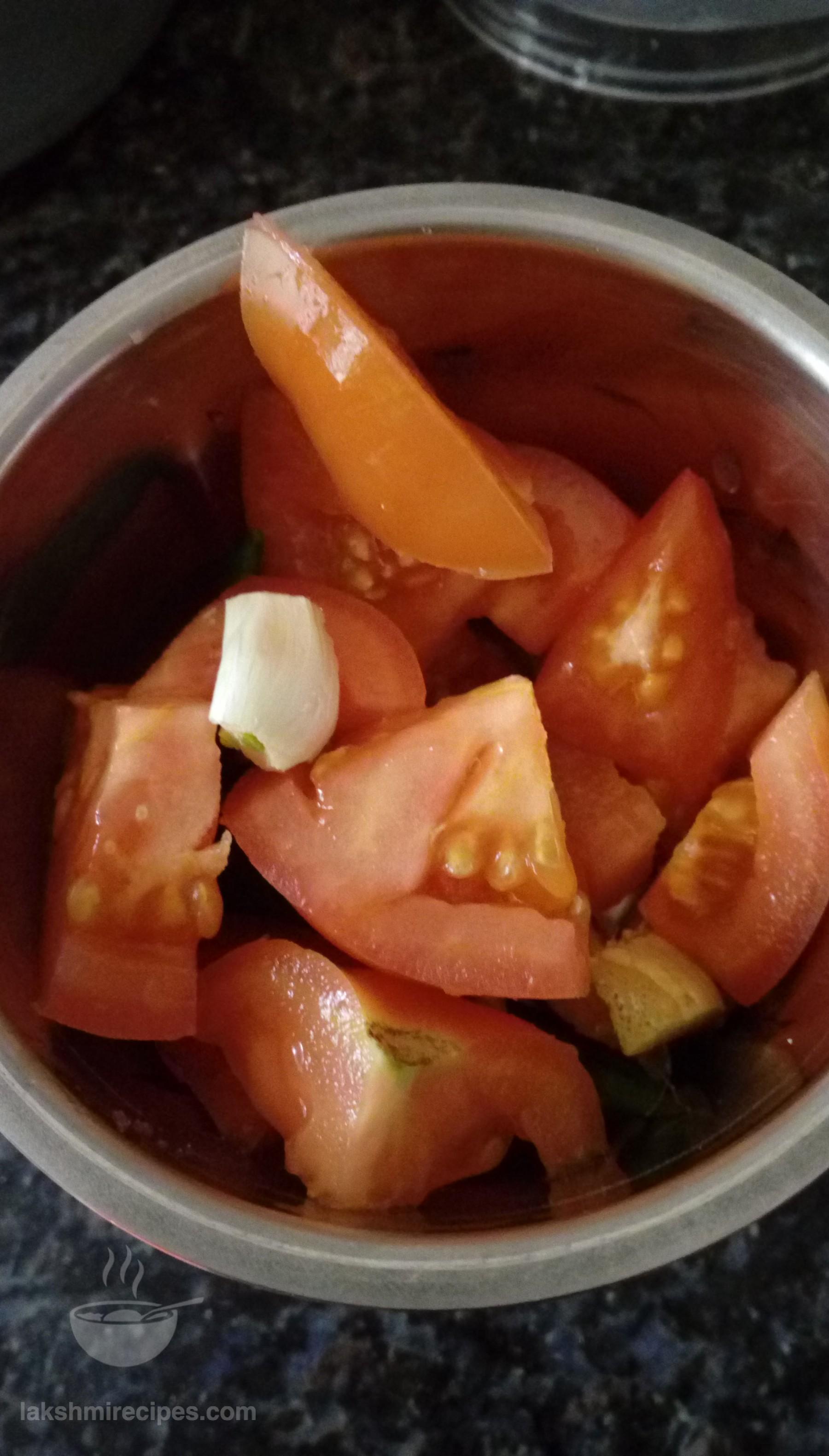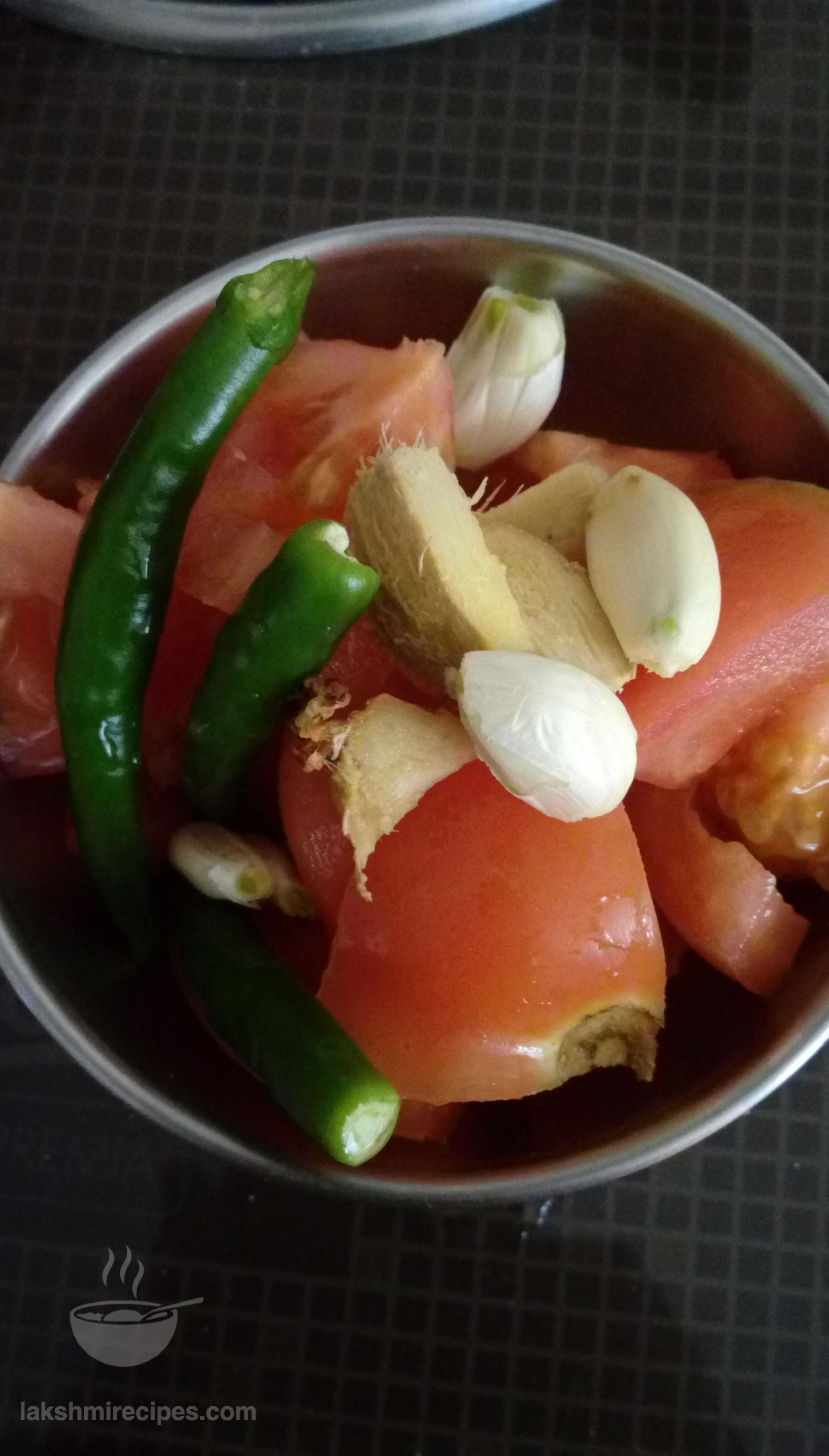 - In a mixer jar take the tomato (tamatar), garlic petals (lehsun ki kali), ginger (adrak) and green chillis (hari mirch) and then grind them together to form a fine paste. Now transfer this paste to a plate.