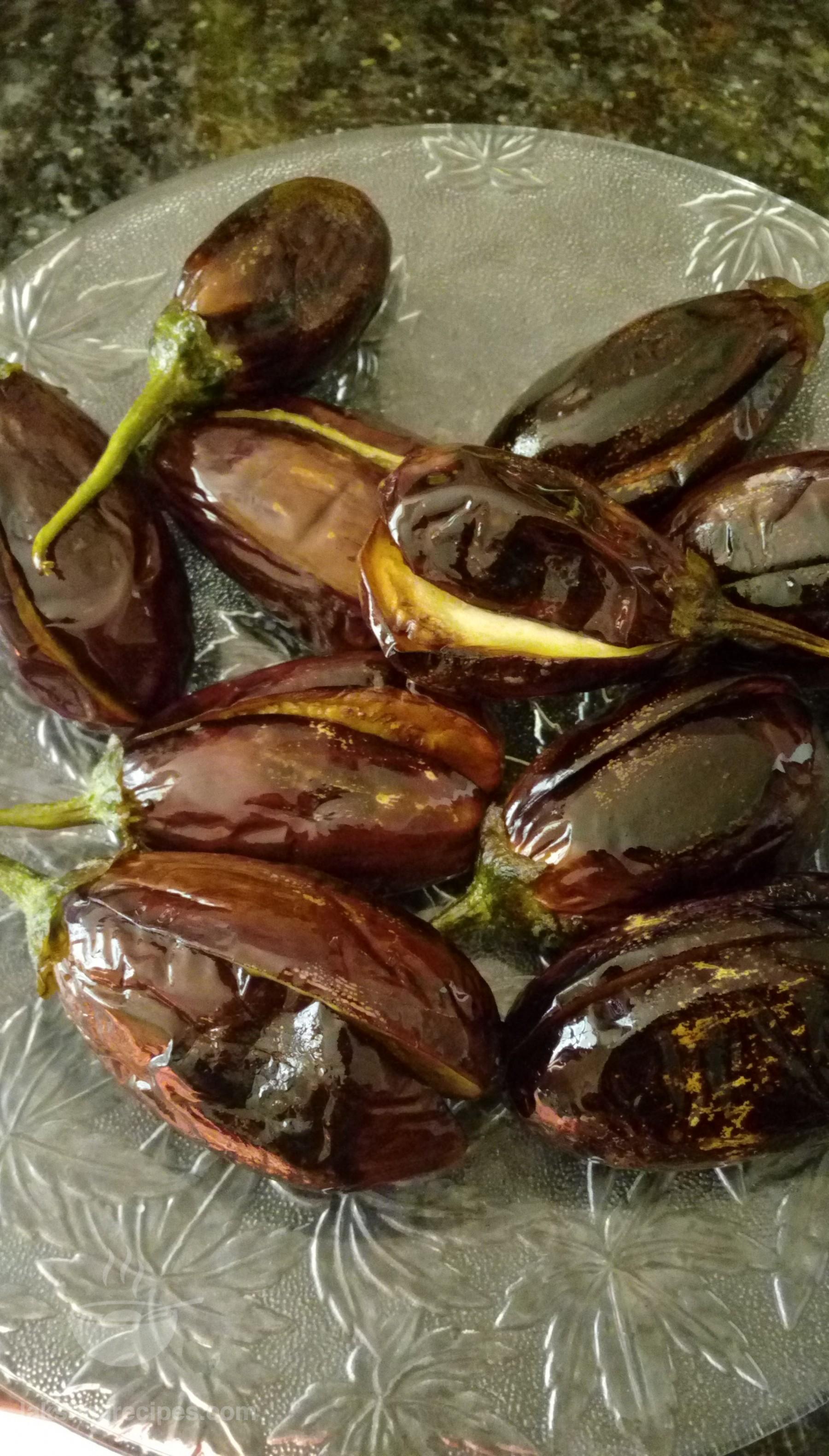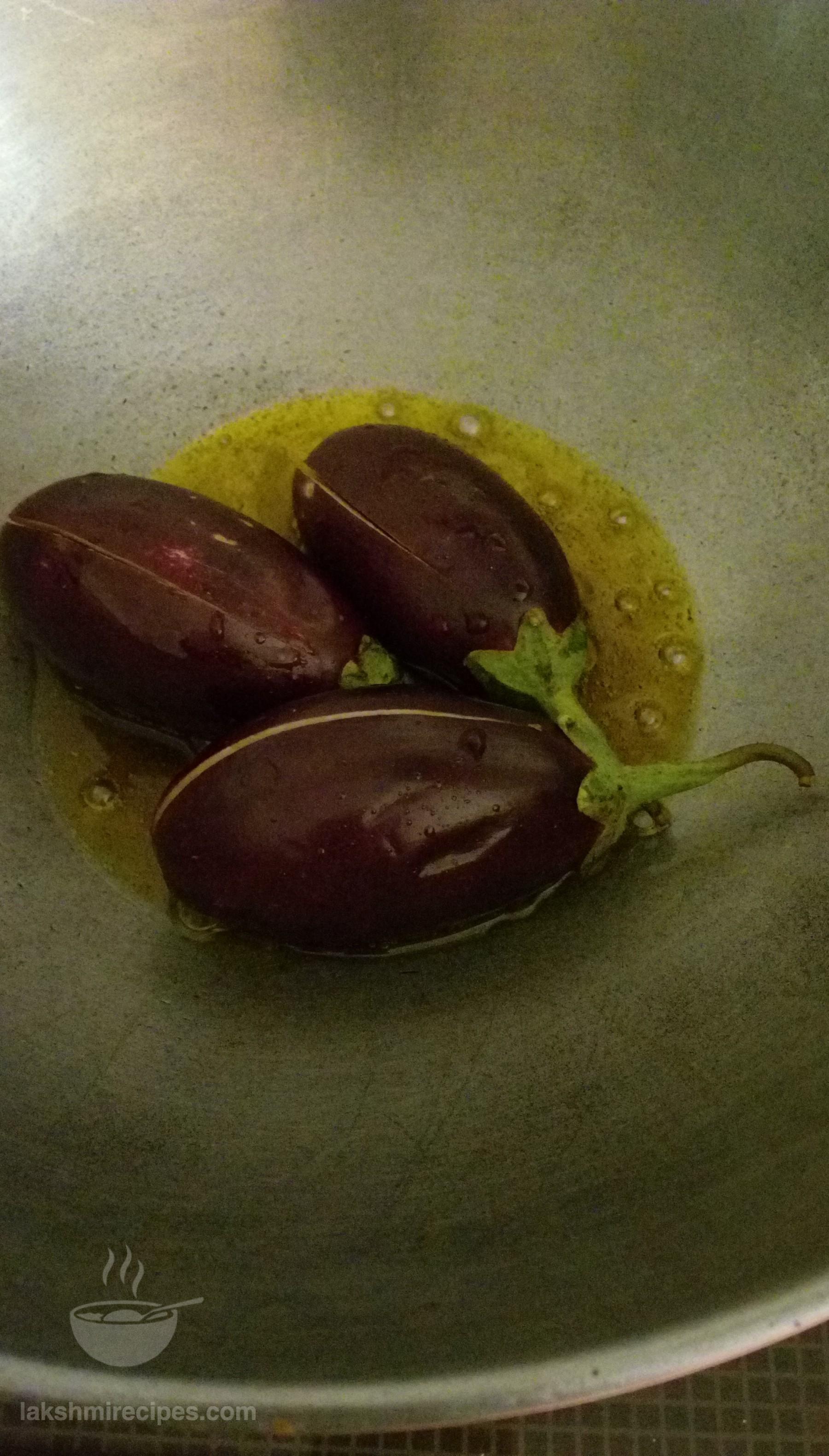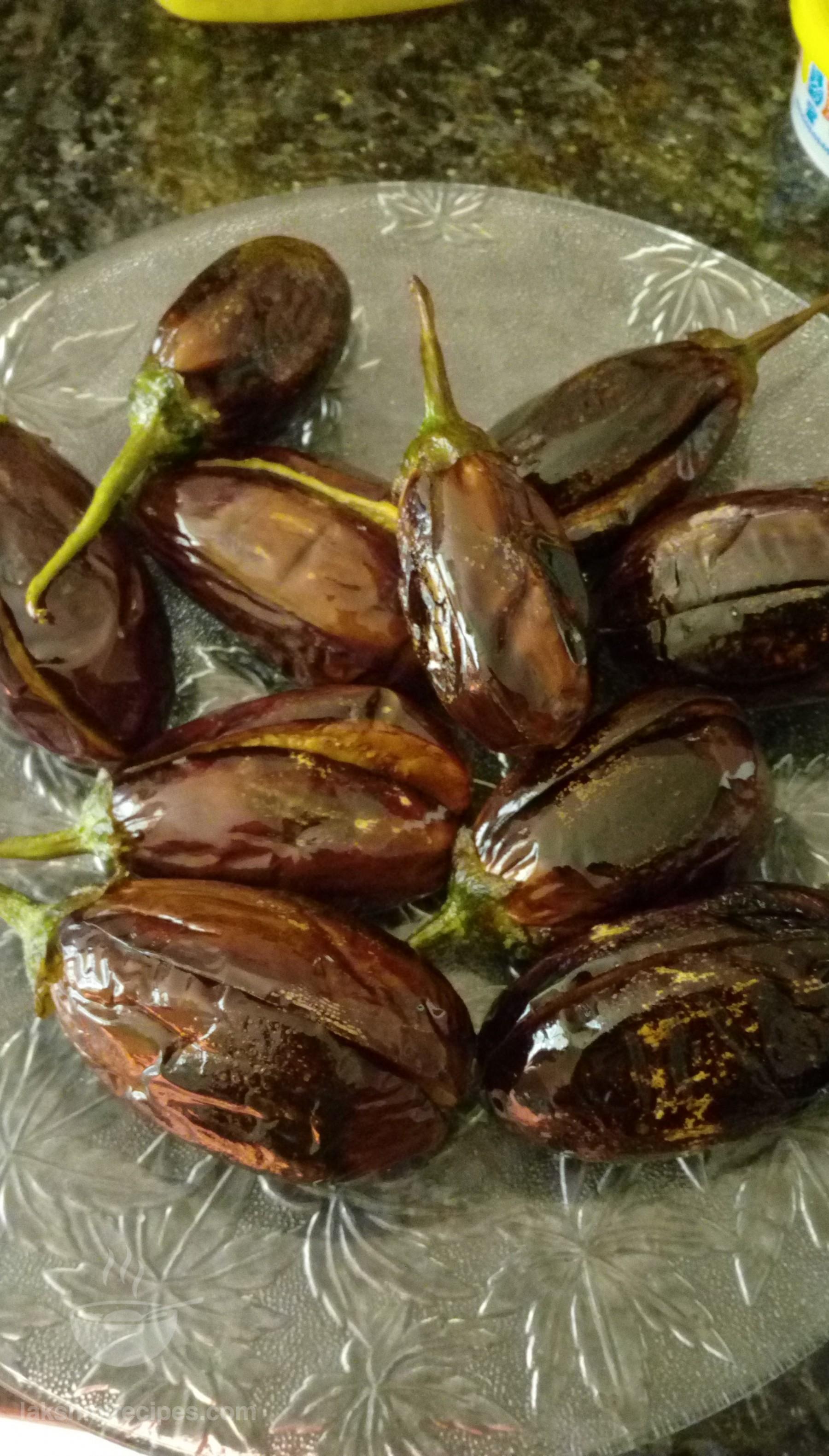 - Slit open the brinjals (baingan) from the center to check if they are ripe and not rotten from the inside. Then wash them well with plain water and then pat them dry with a clean cotton cloth. The oil may clatter and even splash out if there's any moisture remaining on the brinjals (baingan).