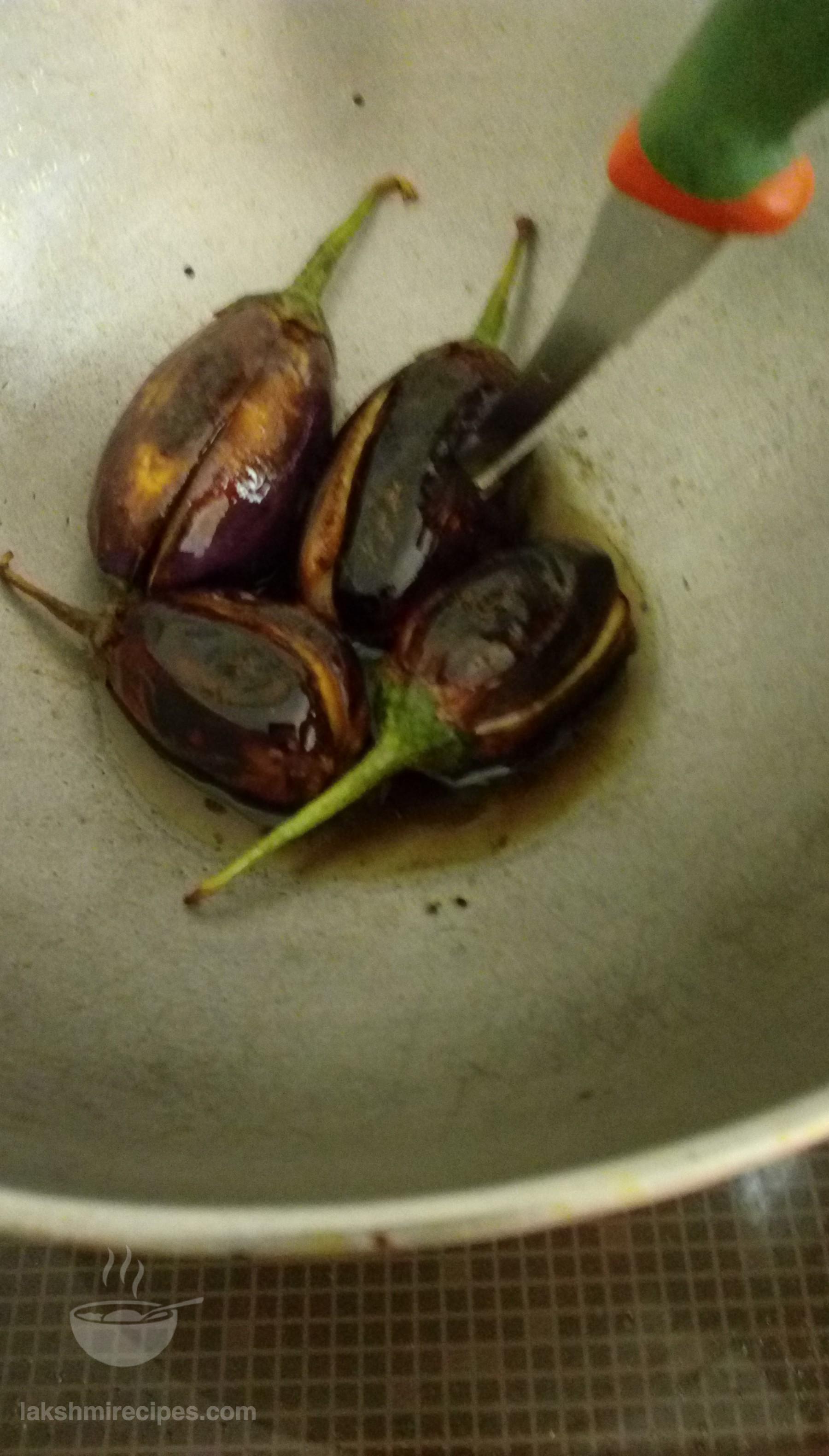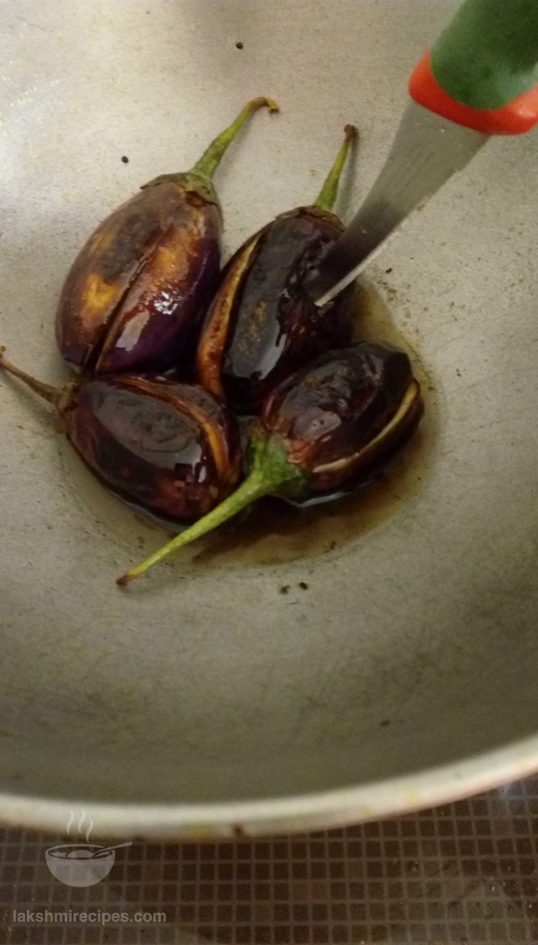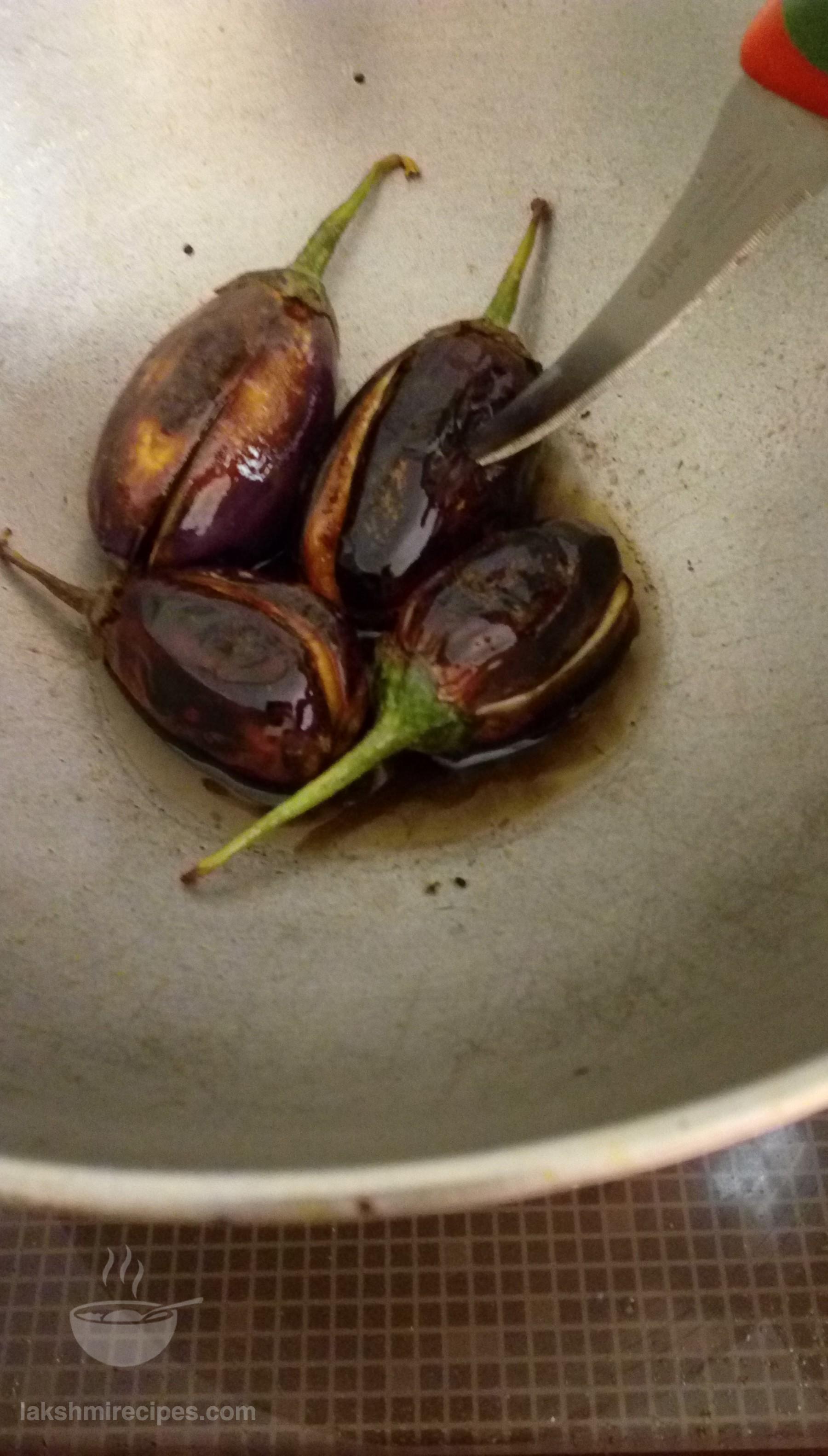 - Then add the small brinjals (baingan) (2 at a time) to deep fry them. Fry the brinjals (baingan) till they turn red and poke them to see if they have become soft inside. Then remove them from the kadhai to a plate. Fry other brinjals (baingan) in the same manner.