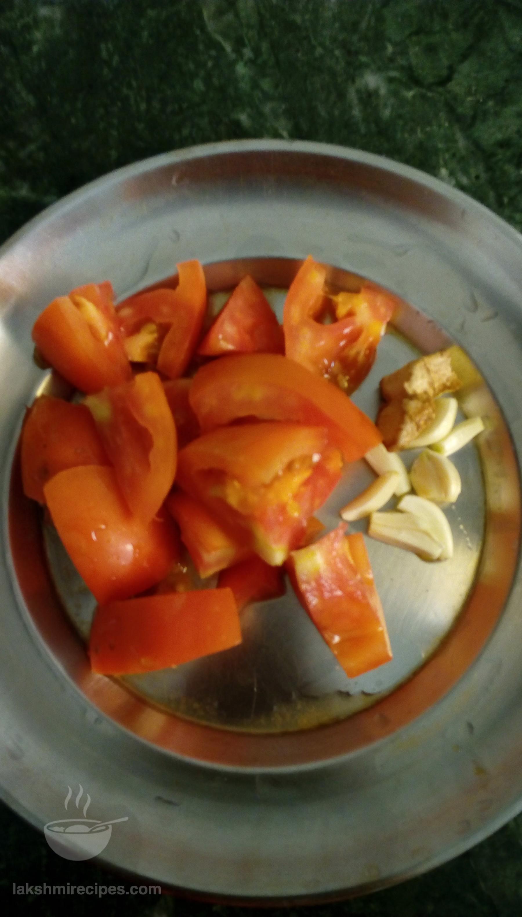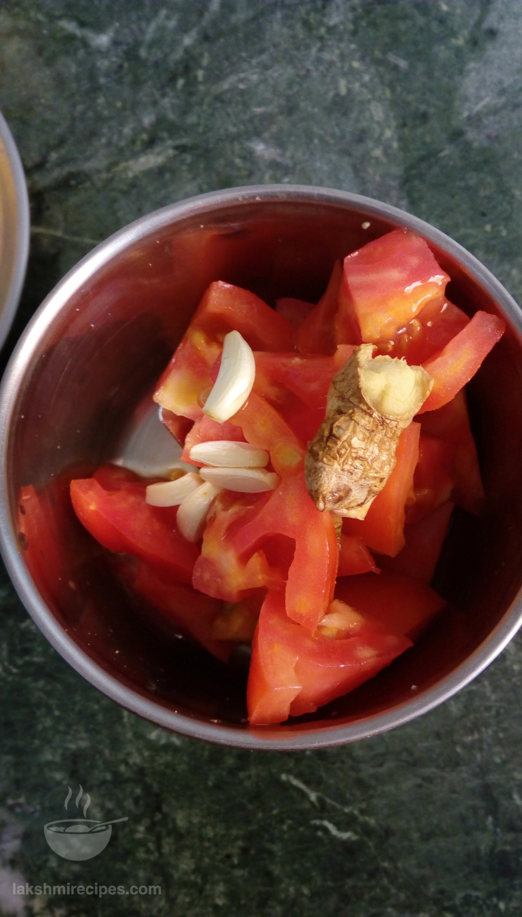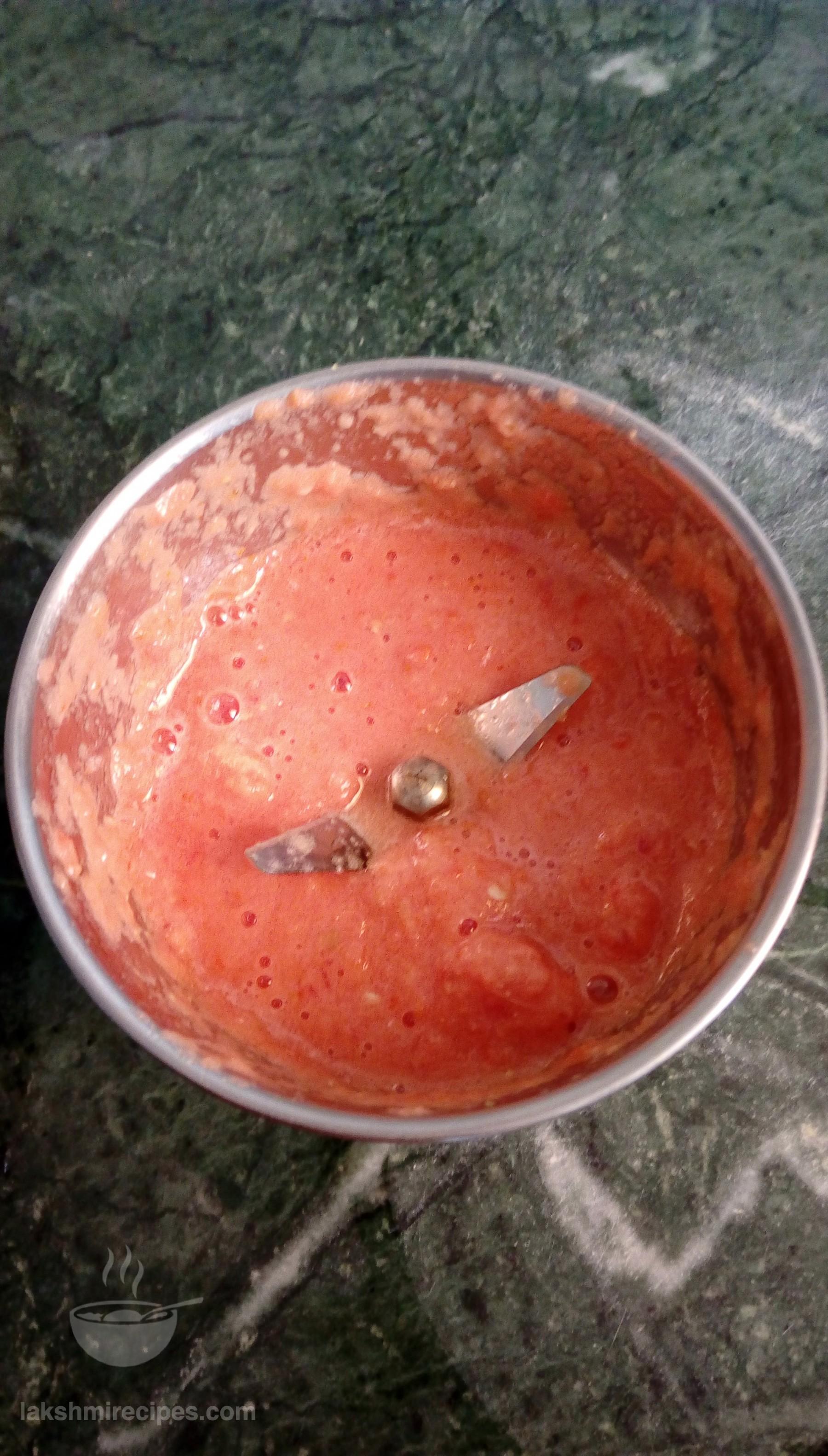 - Take the chopped tomato, garlic petals (lehsun ki kali) and ginger (adrak) in mixer jar and grind the ingredients to form a fine paste.