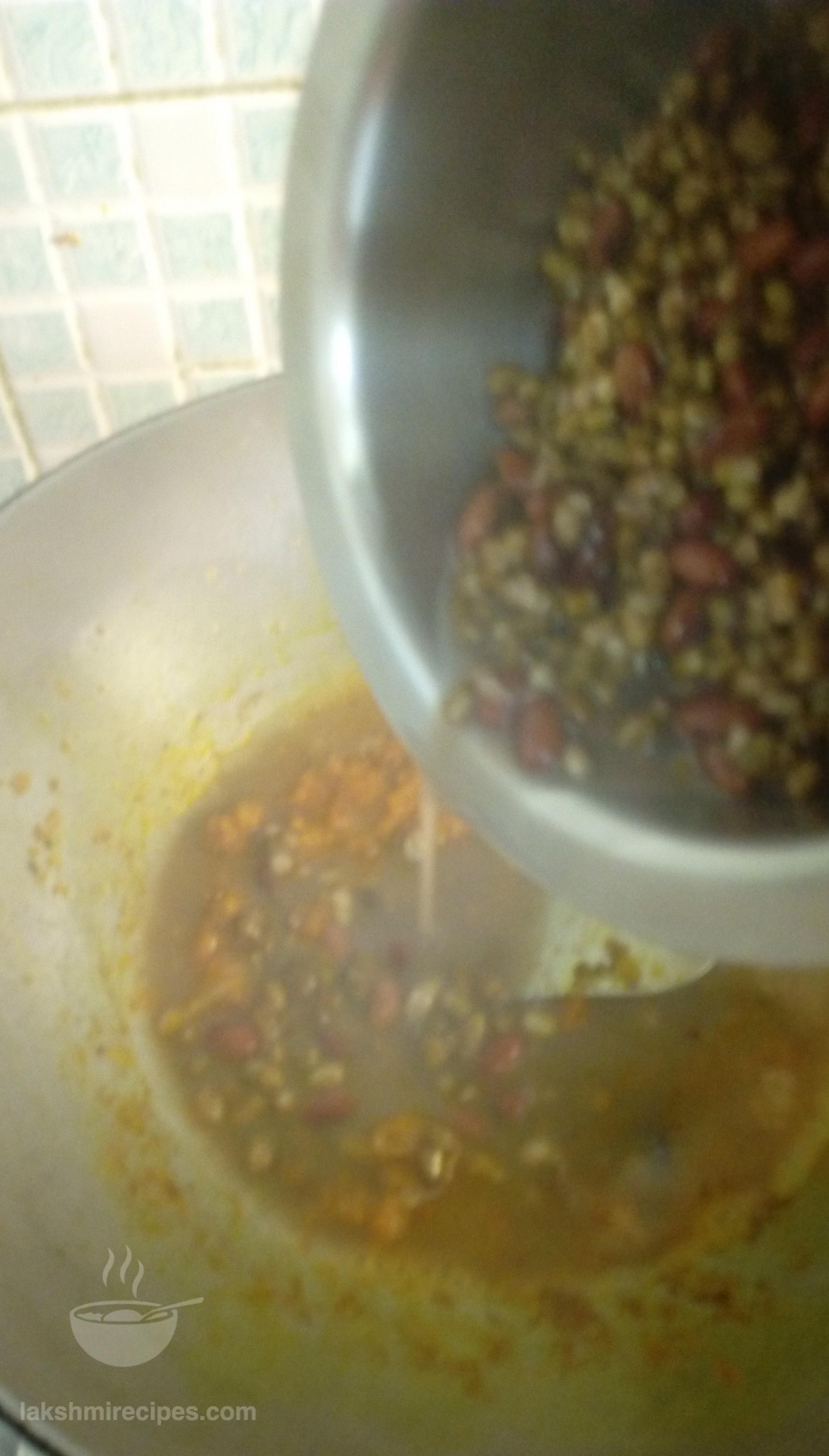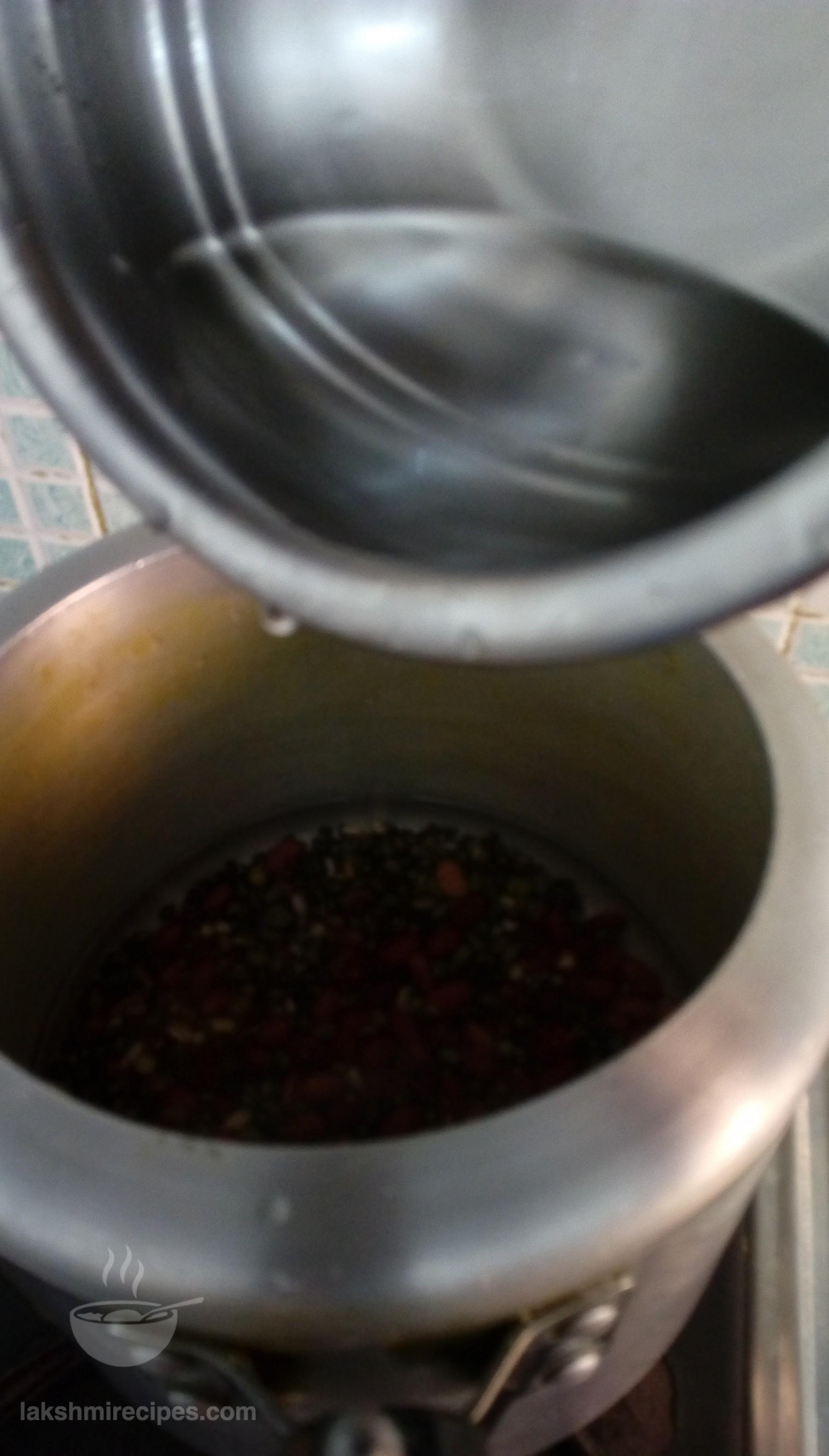 - Wash and soak the whole black lentils (sabut urad dal) and the small red kidney beans (chhota lal rajma) in seperate vessels for 6 hours.