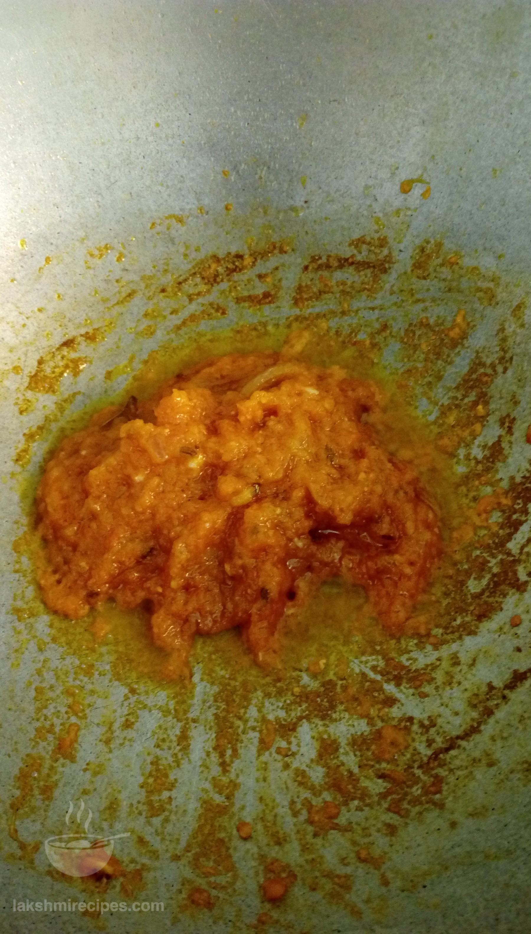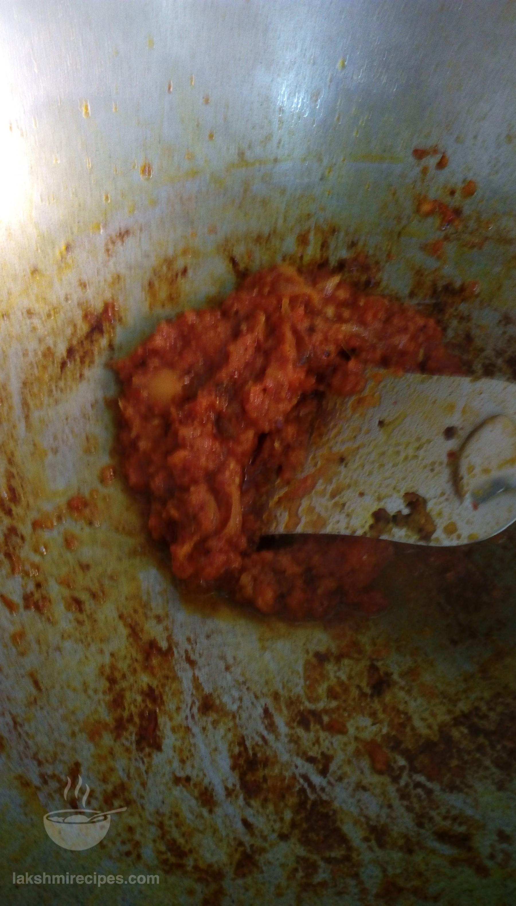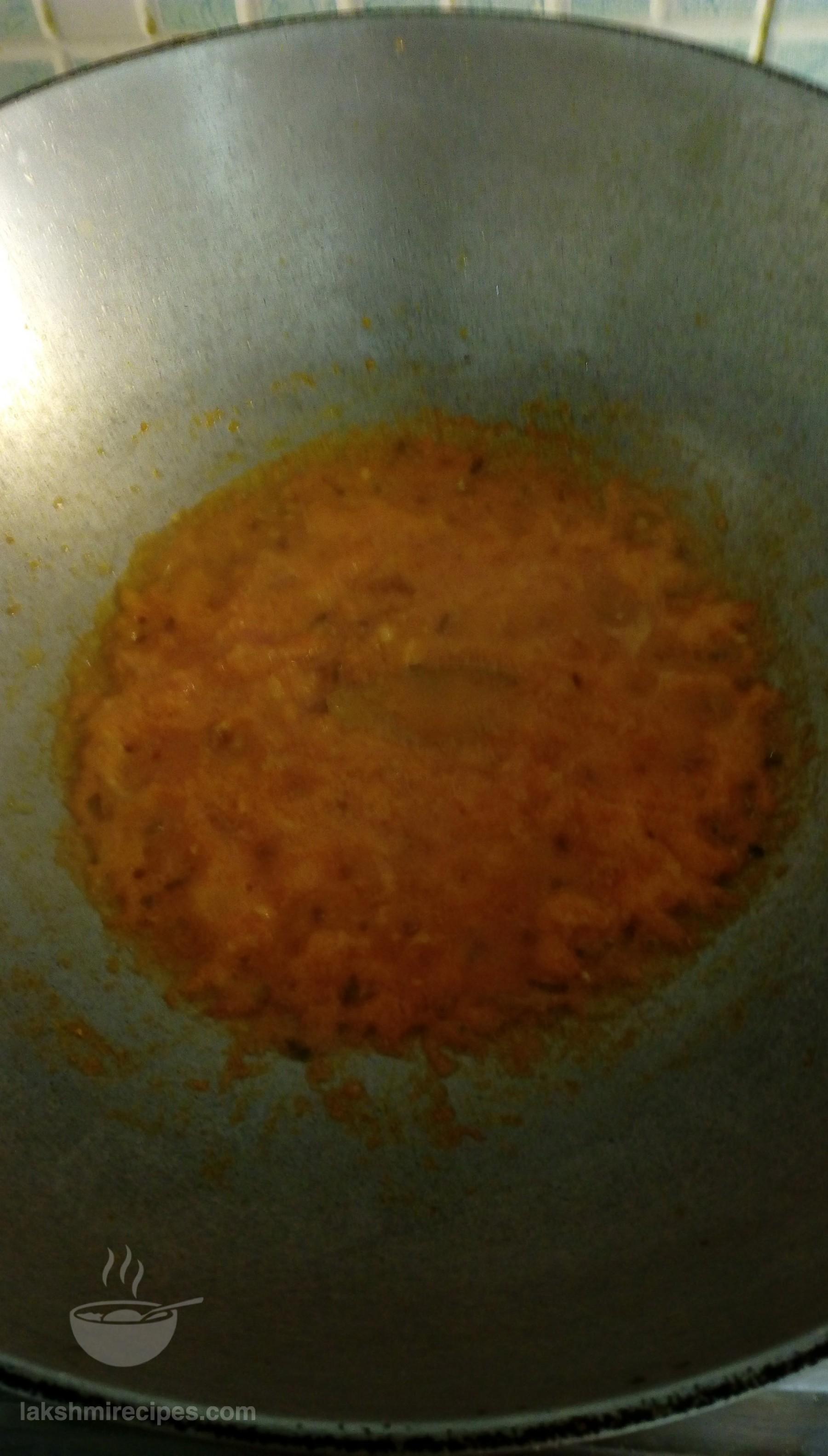 - Saute the onion till they turn light red in color and then add the tomato & garlic-ginger paste (prepared in the previous step) to the kadhai. Stir and saute the paste a little.