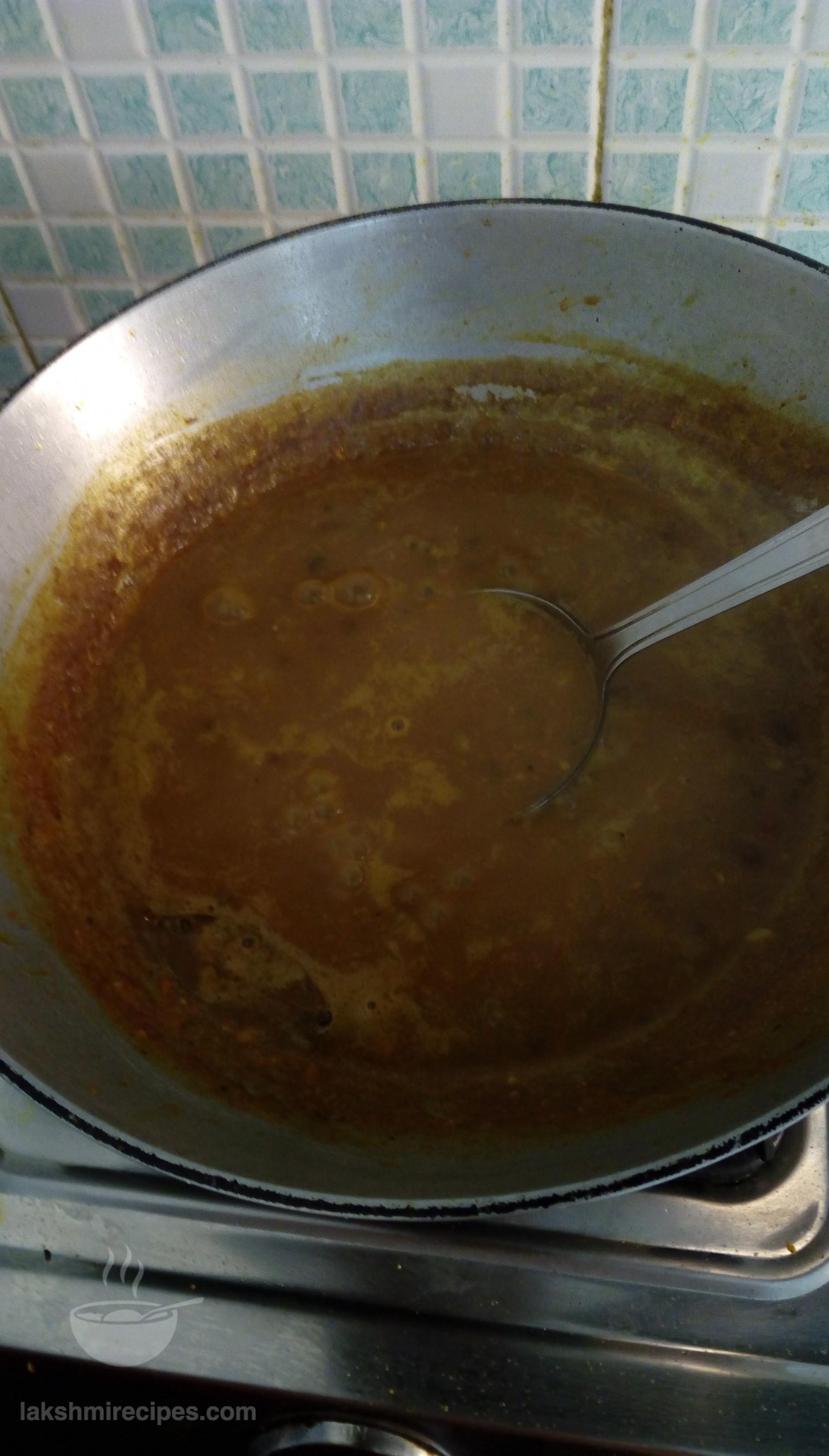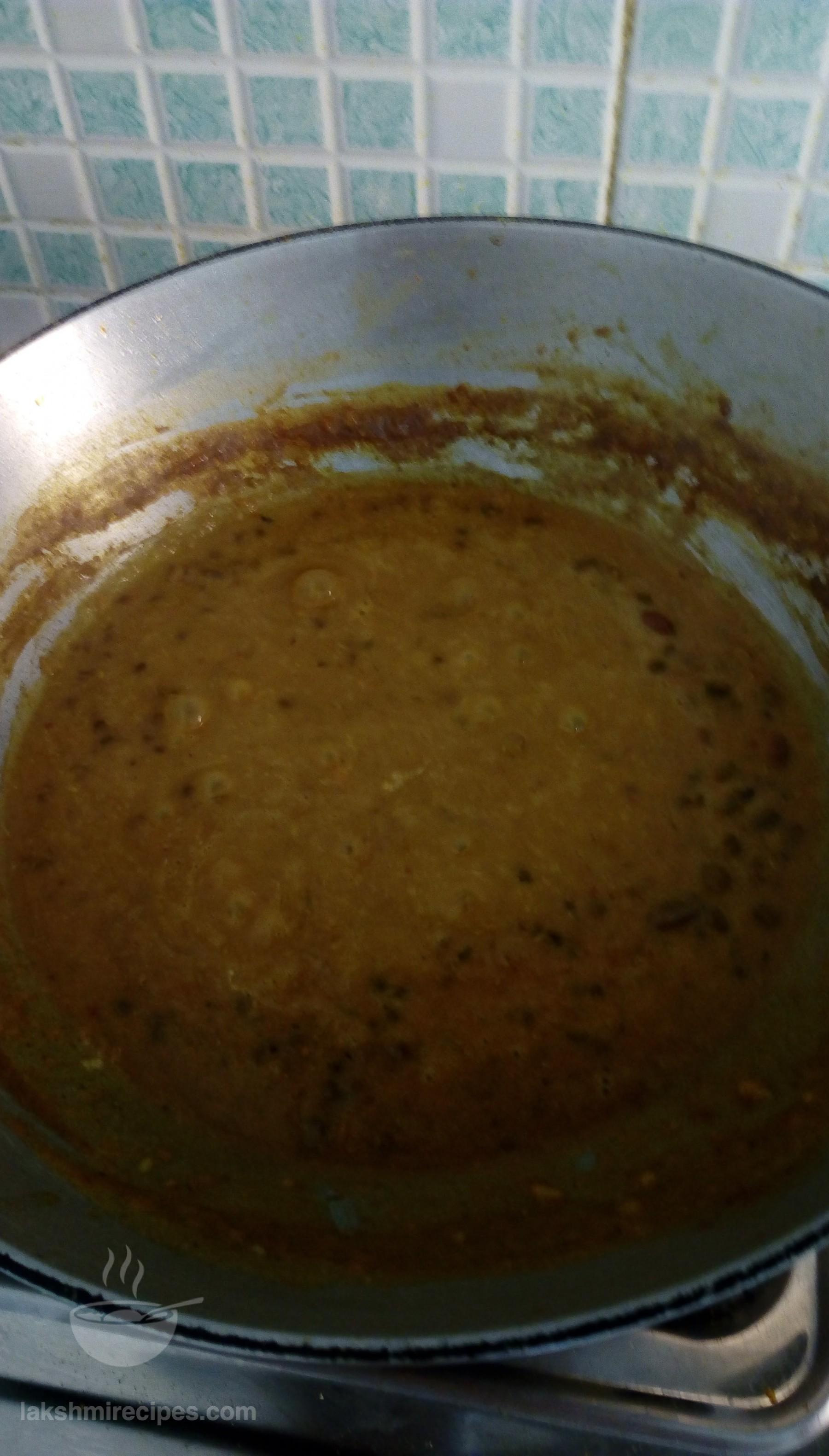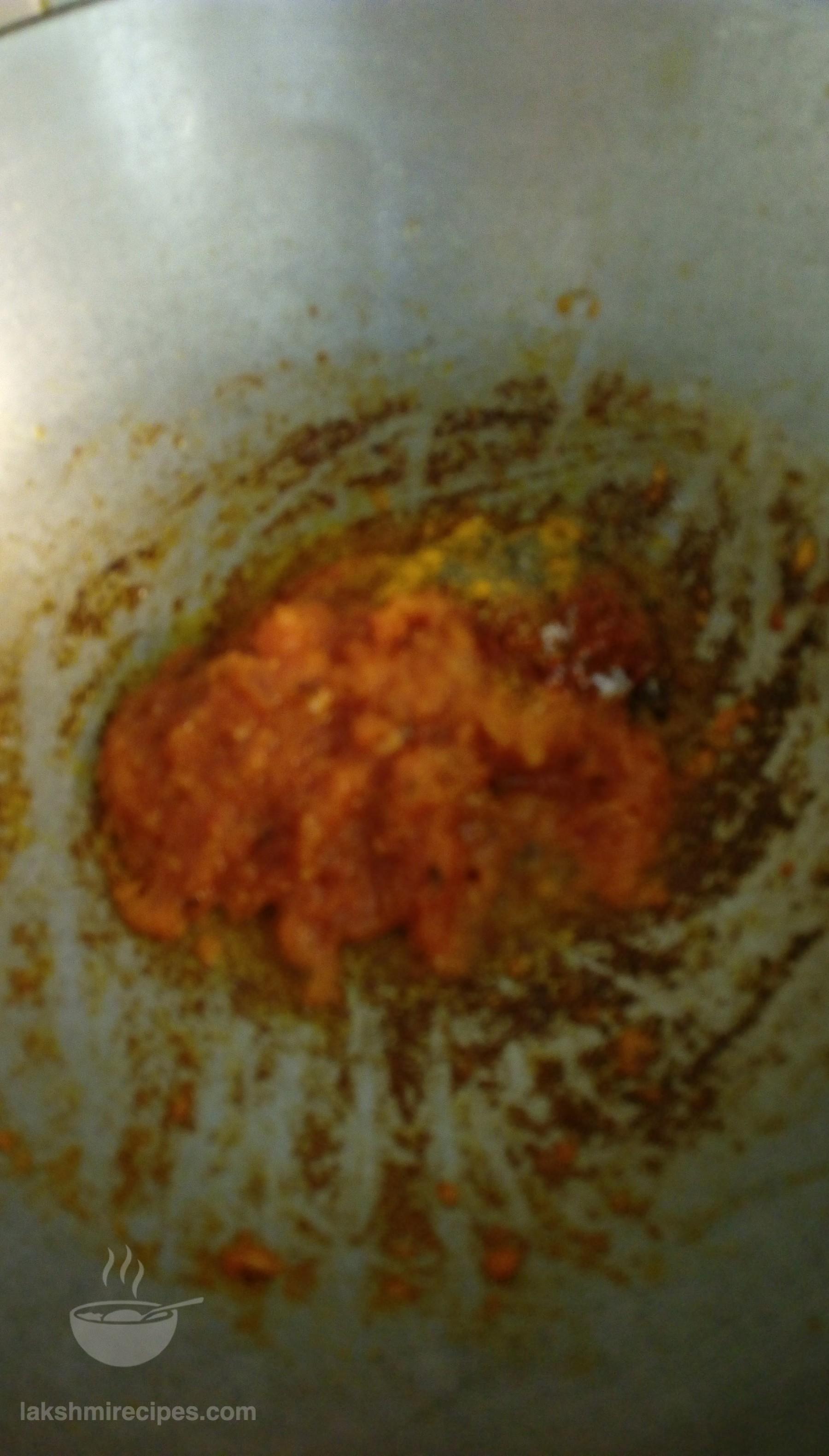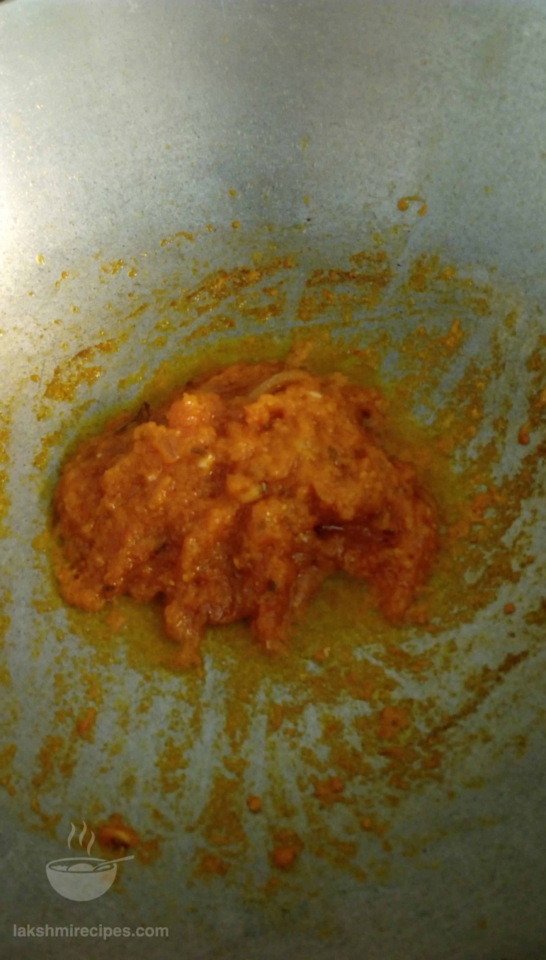 - Saute the onion till they turn light red in color and then add the tomato & garlic-ginger paste (prepared in the previous step) to the kadhai. Stir and saute the paste a little.