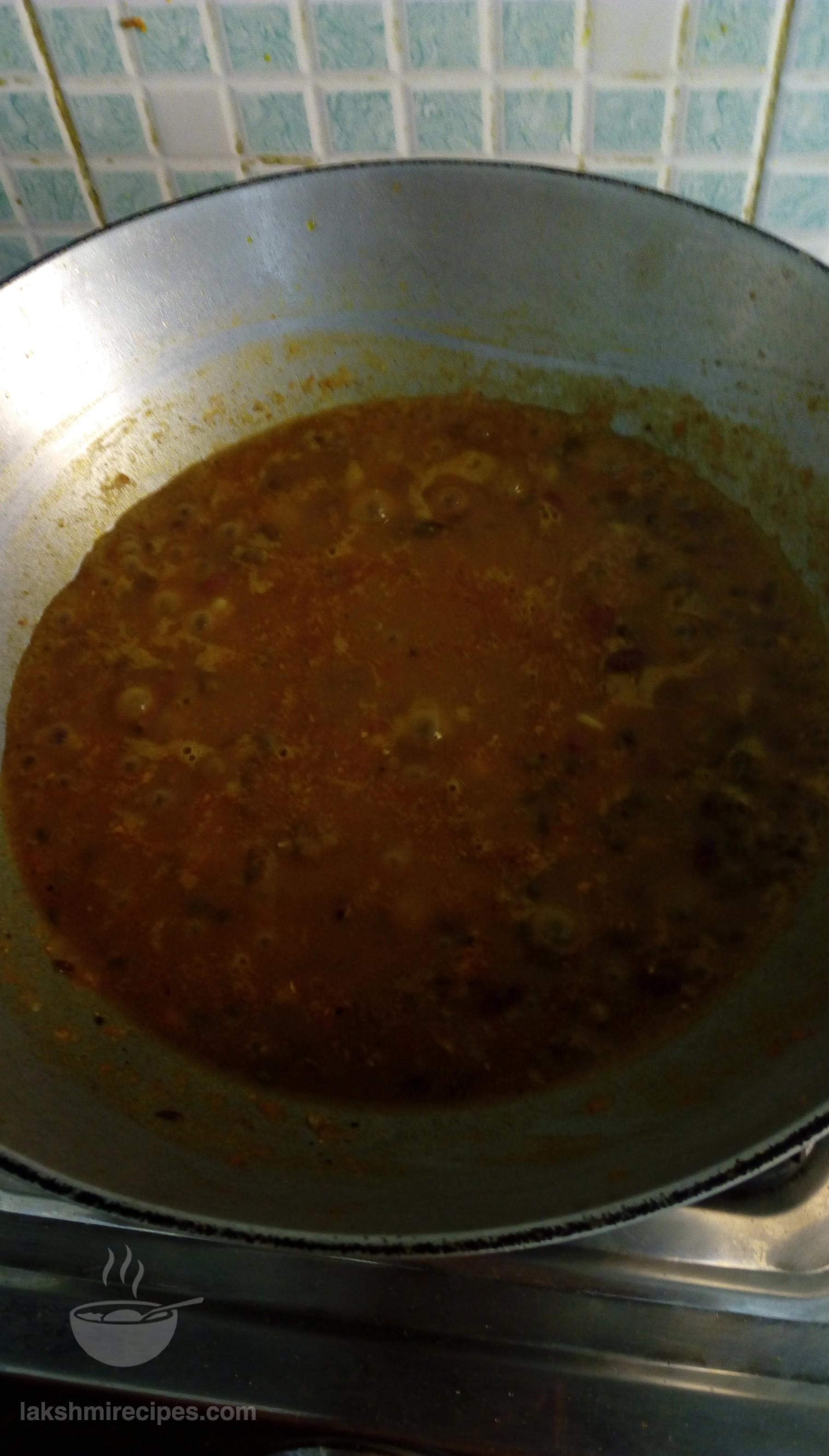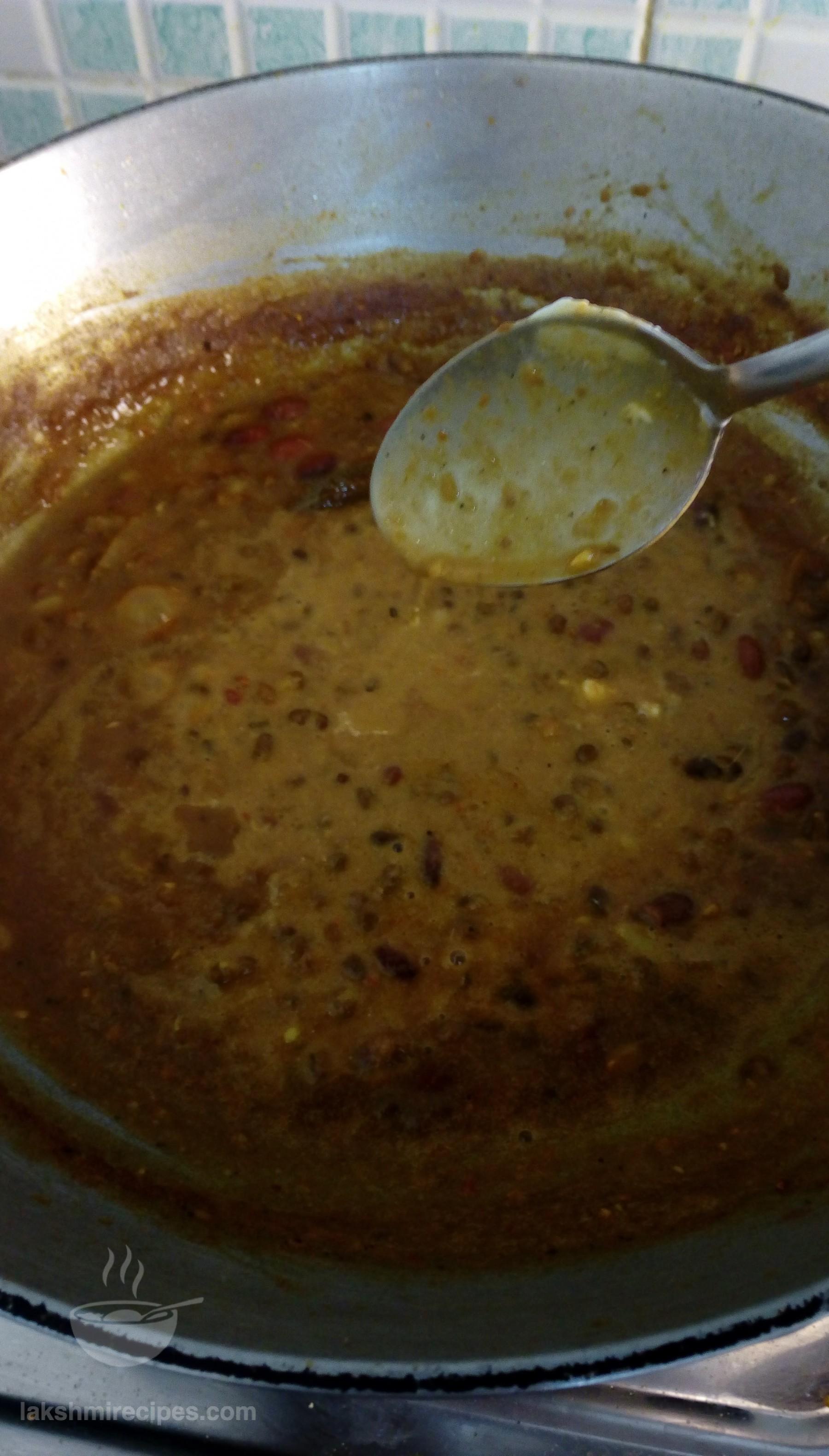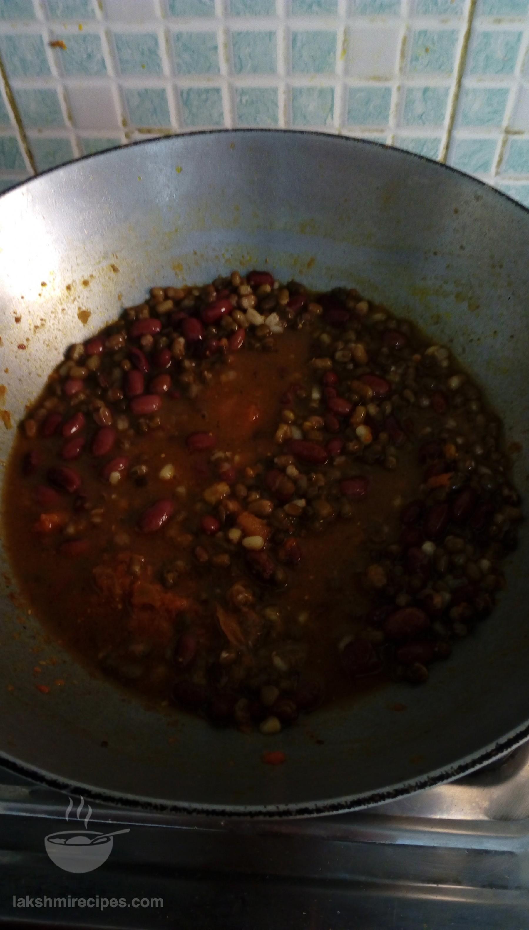 - Add the cooked whole black lentils (sabut urad dal) and the small red kidney beans (chhota lal rajma) along with the water from the cooker to the kadhai. Allow the dal to boil for some time and add garam masala powder to it and mix well.