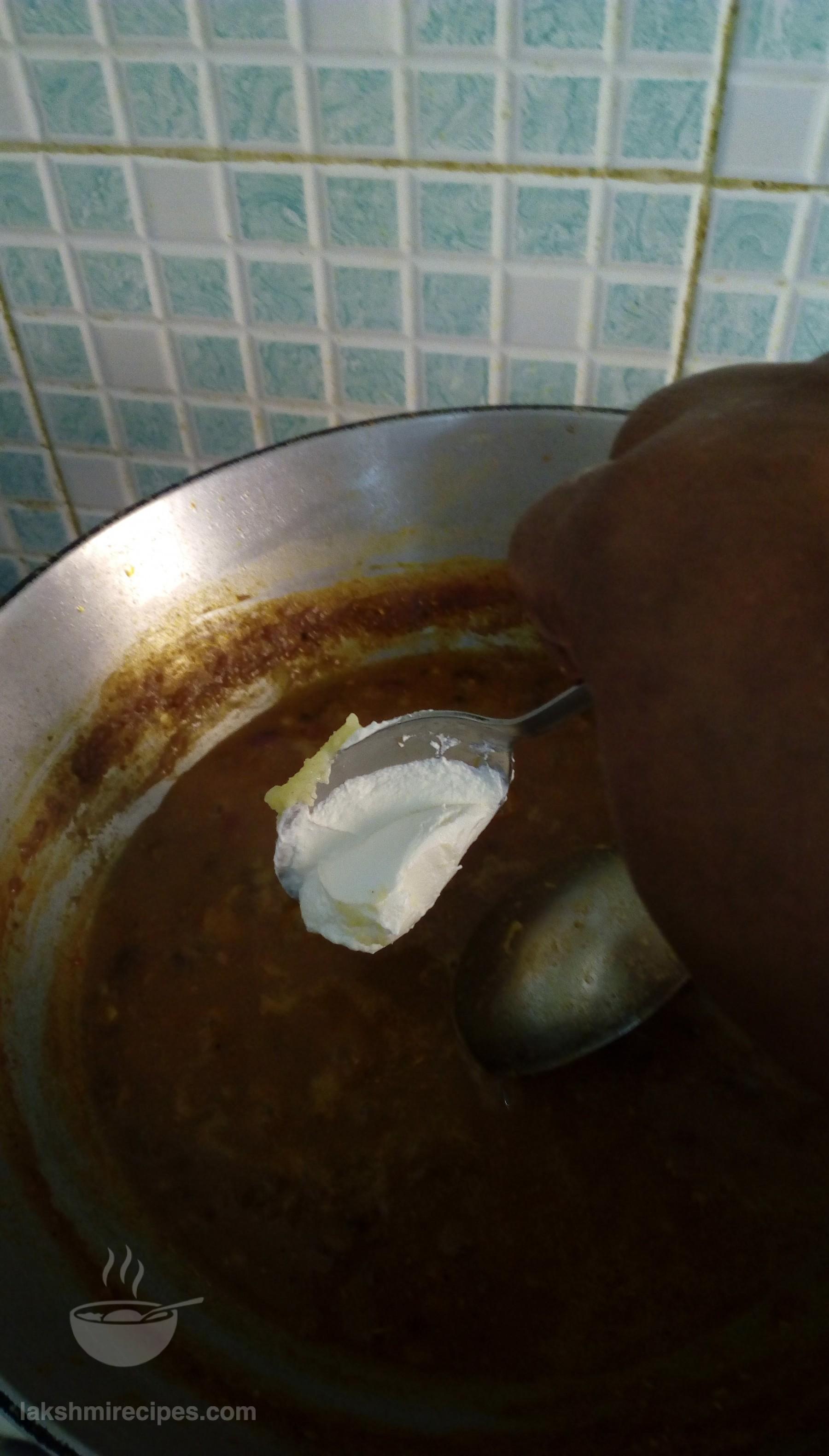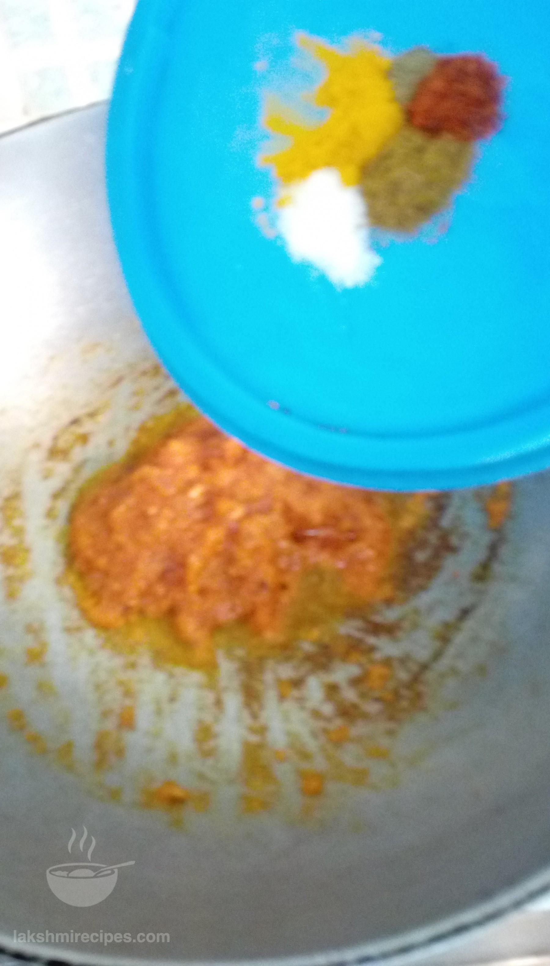 - Now add turmeric powder (haldi powder), salt as per taste, red chilli powder (lal mirch powder) and cumin seeds powder (jeera powder) to kadhai. Mix well and cook the masala being prepared well till the ghee begins to seperate from the masala.
