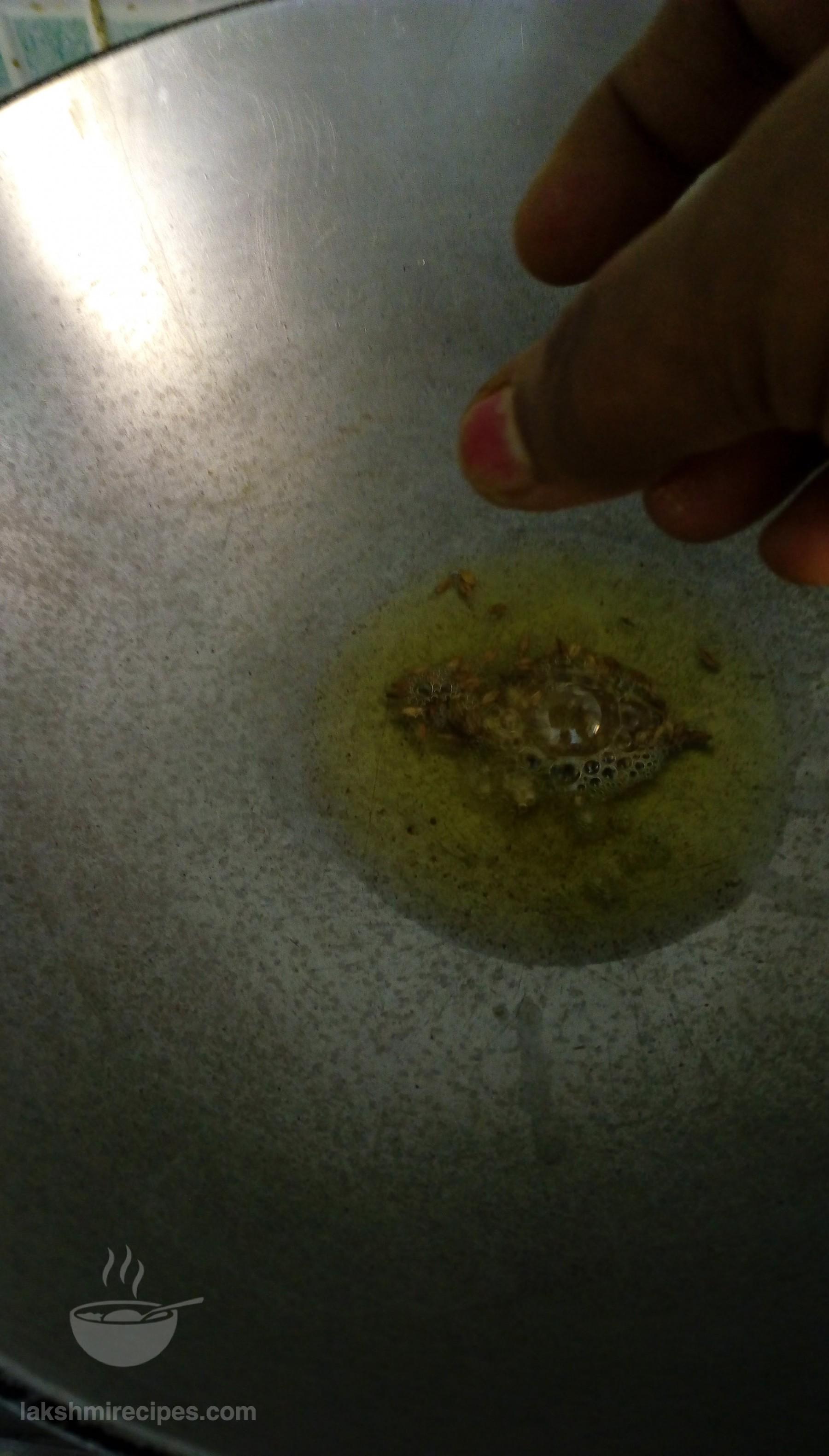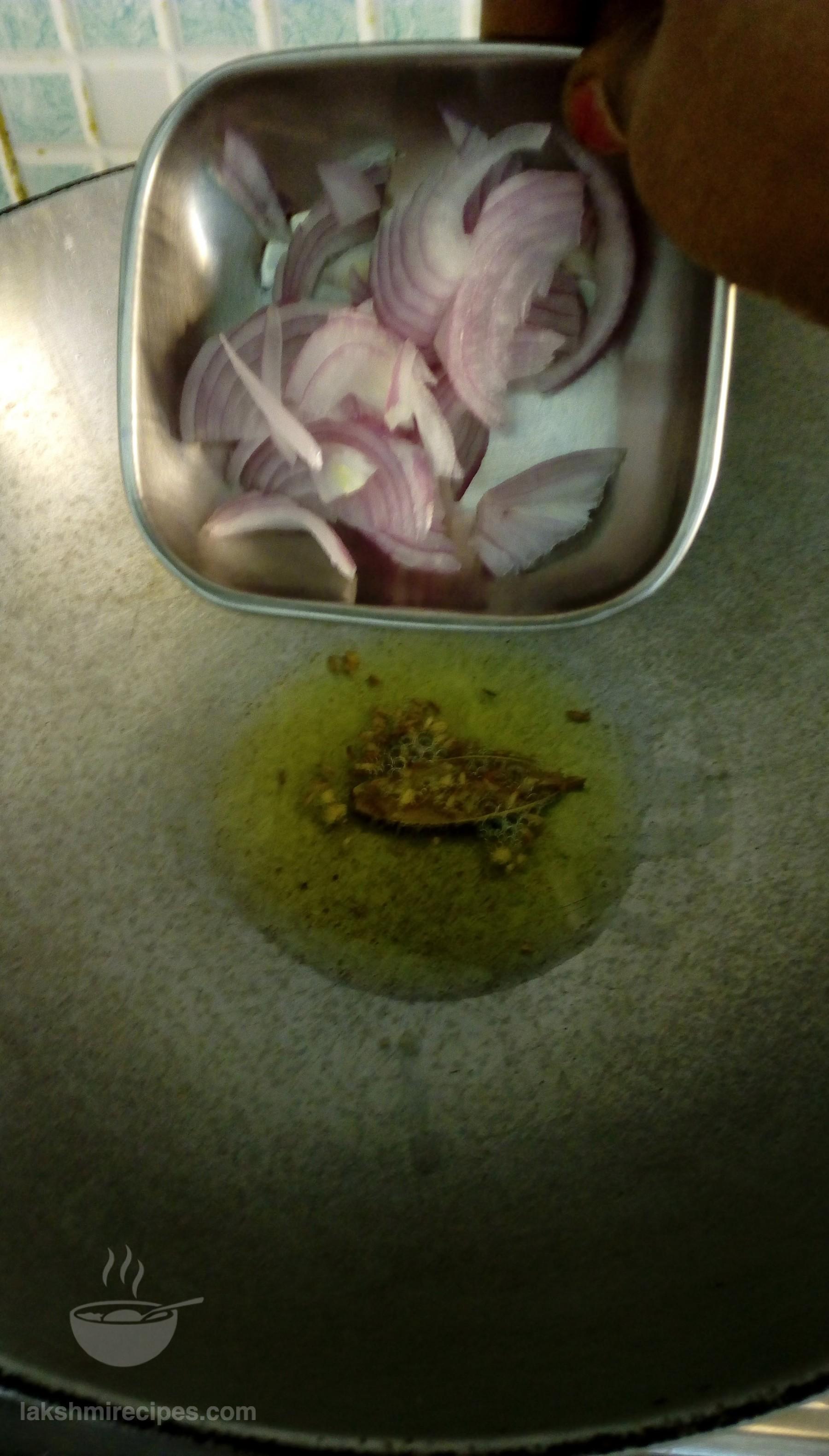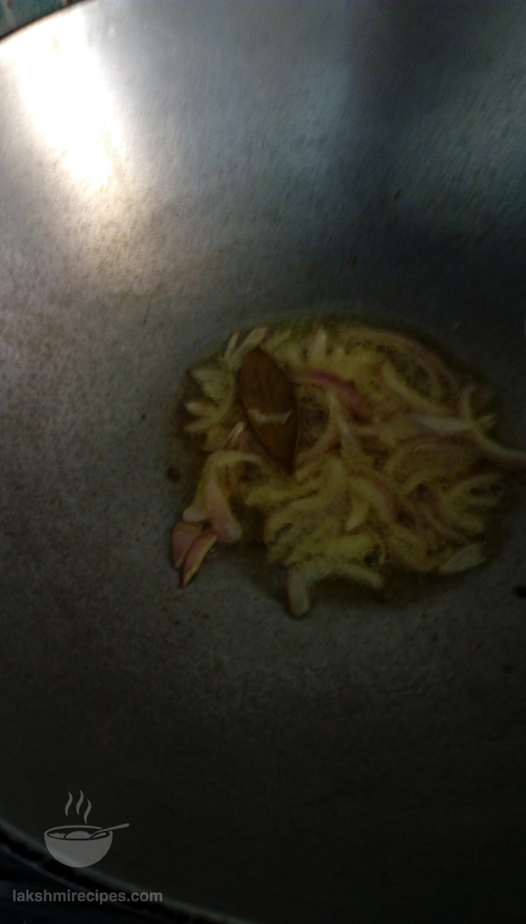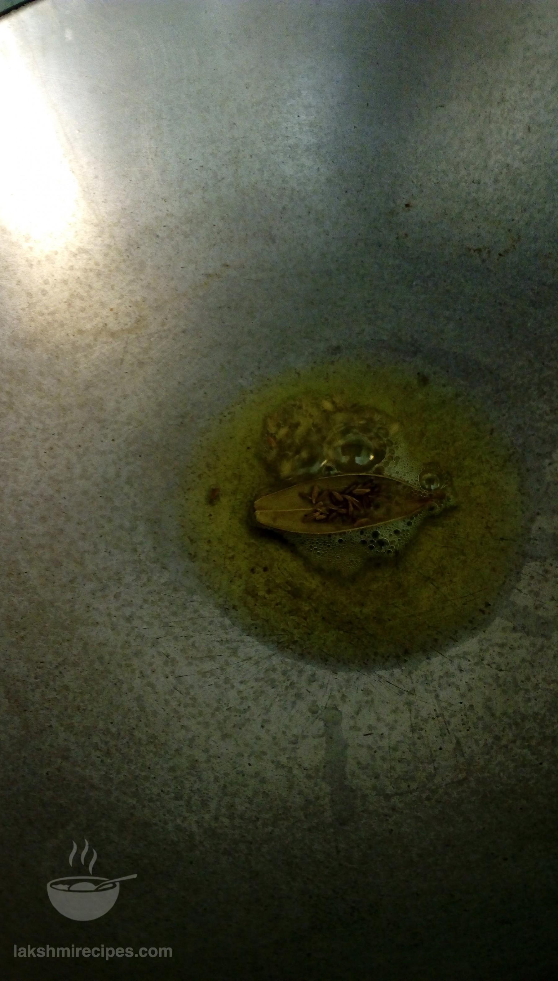 - Heat a kadhai and add shudh ghee to it. When the ghee is hot add the cumin seeds (sabut jeera) and bay leaf (tej patta) to it. Allow the cumin seeds (sabut jeera) to crackle and then add the finely chopped onion to it.