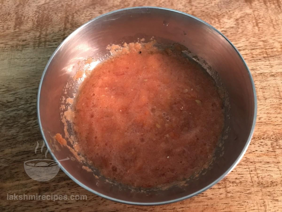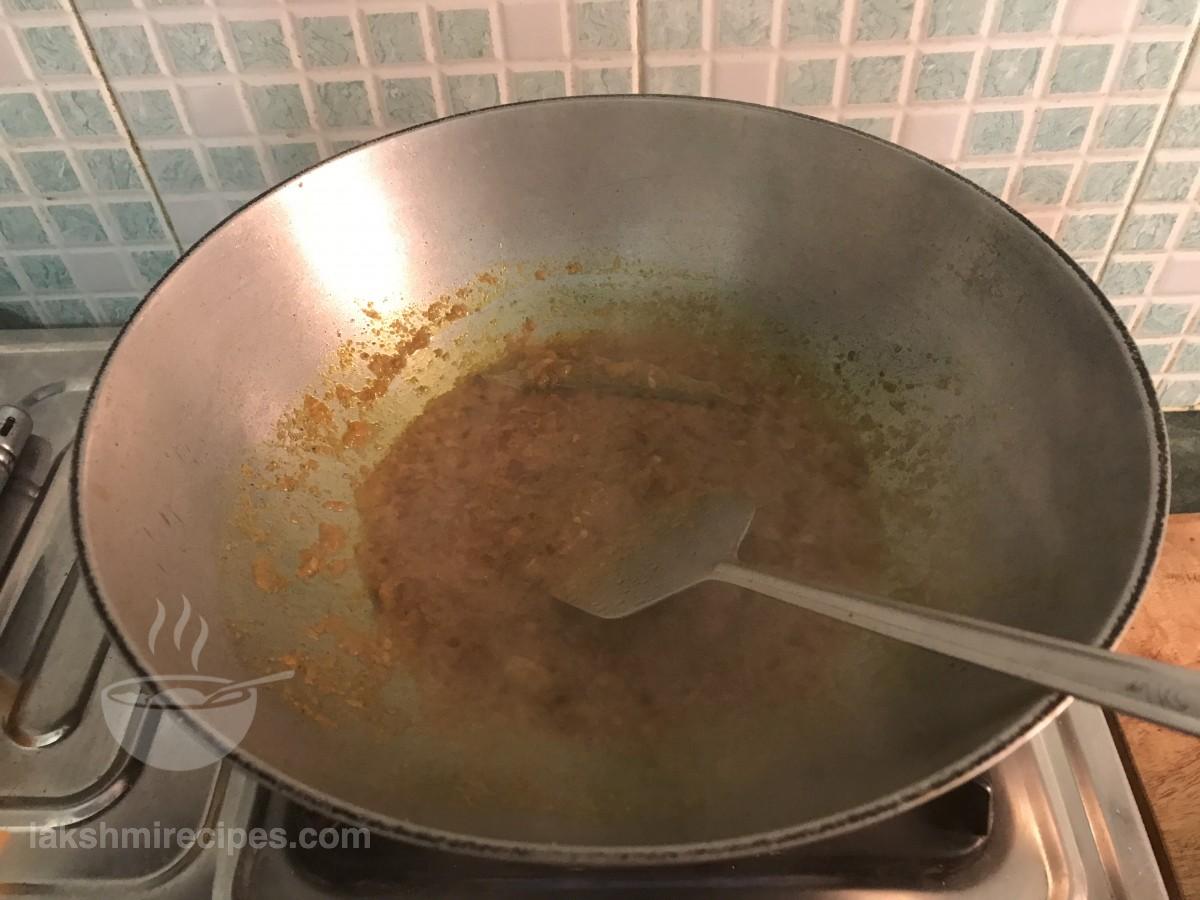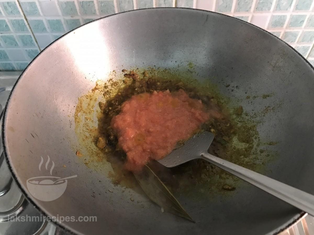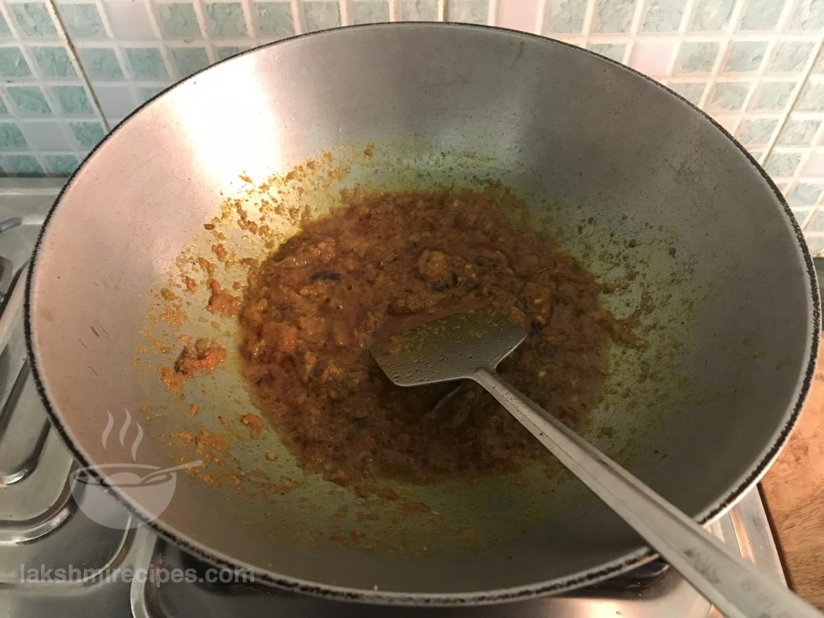 - When the tomato paste is nicely cooked then added the coarsely ground paste of almonds and mix well. Saute for a few seconds.