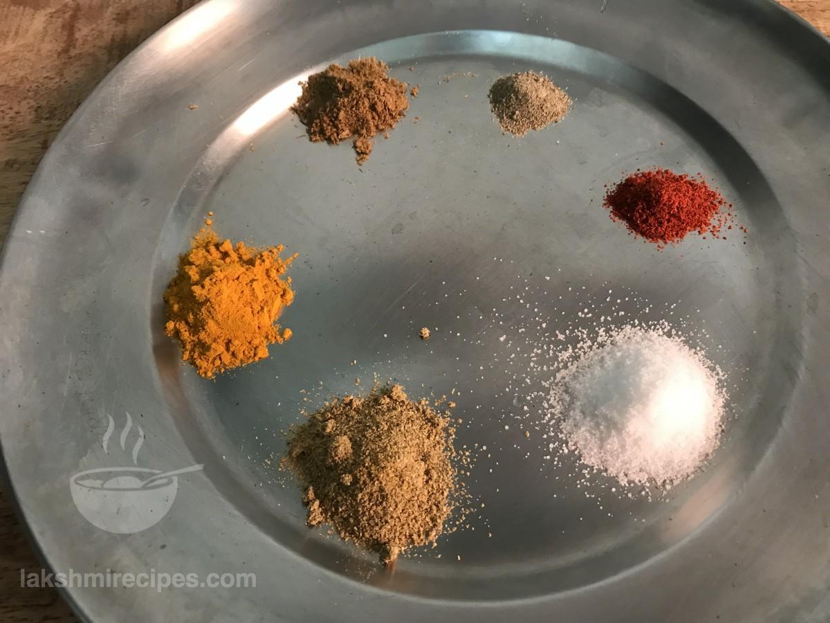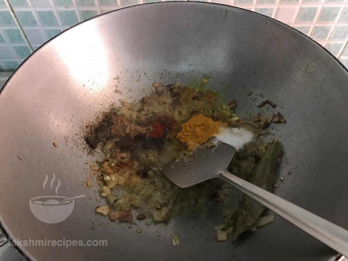 - Add the powdered spices (turmeric powder, red chilli powder, coriander powder, cumin powder and black pepper powder) to the kadhai and again mix and saute for 1 minute.
