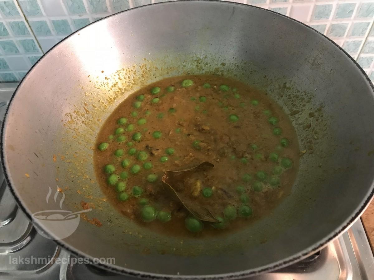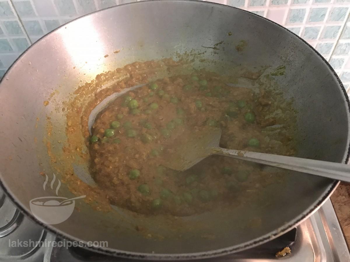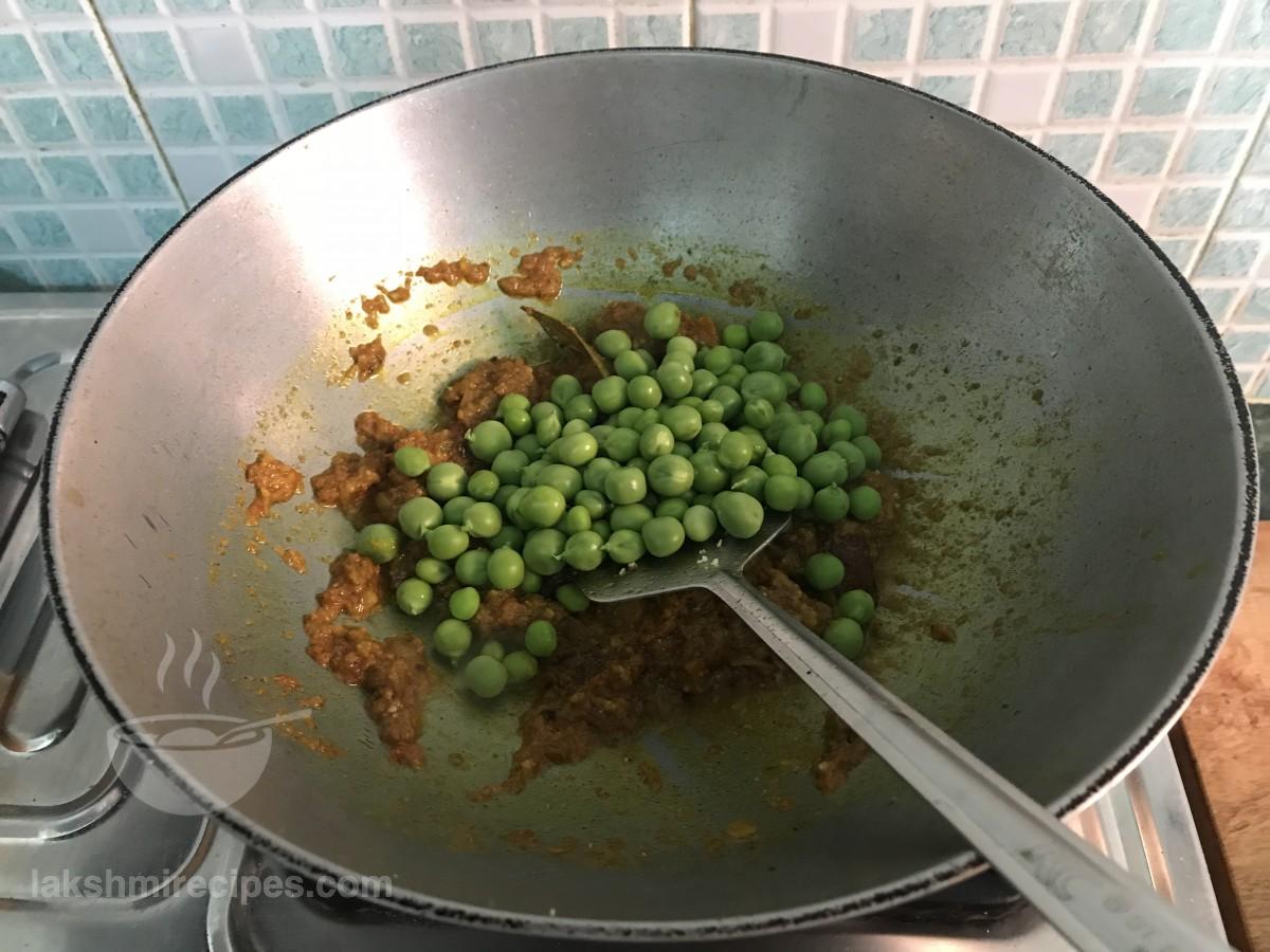 - Now remove the lid from the kadhai and take a green peas. Mash it with your finger to check if it is nicely cooked.