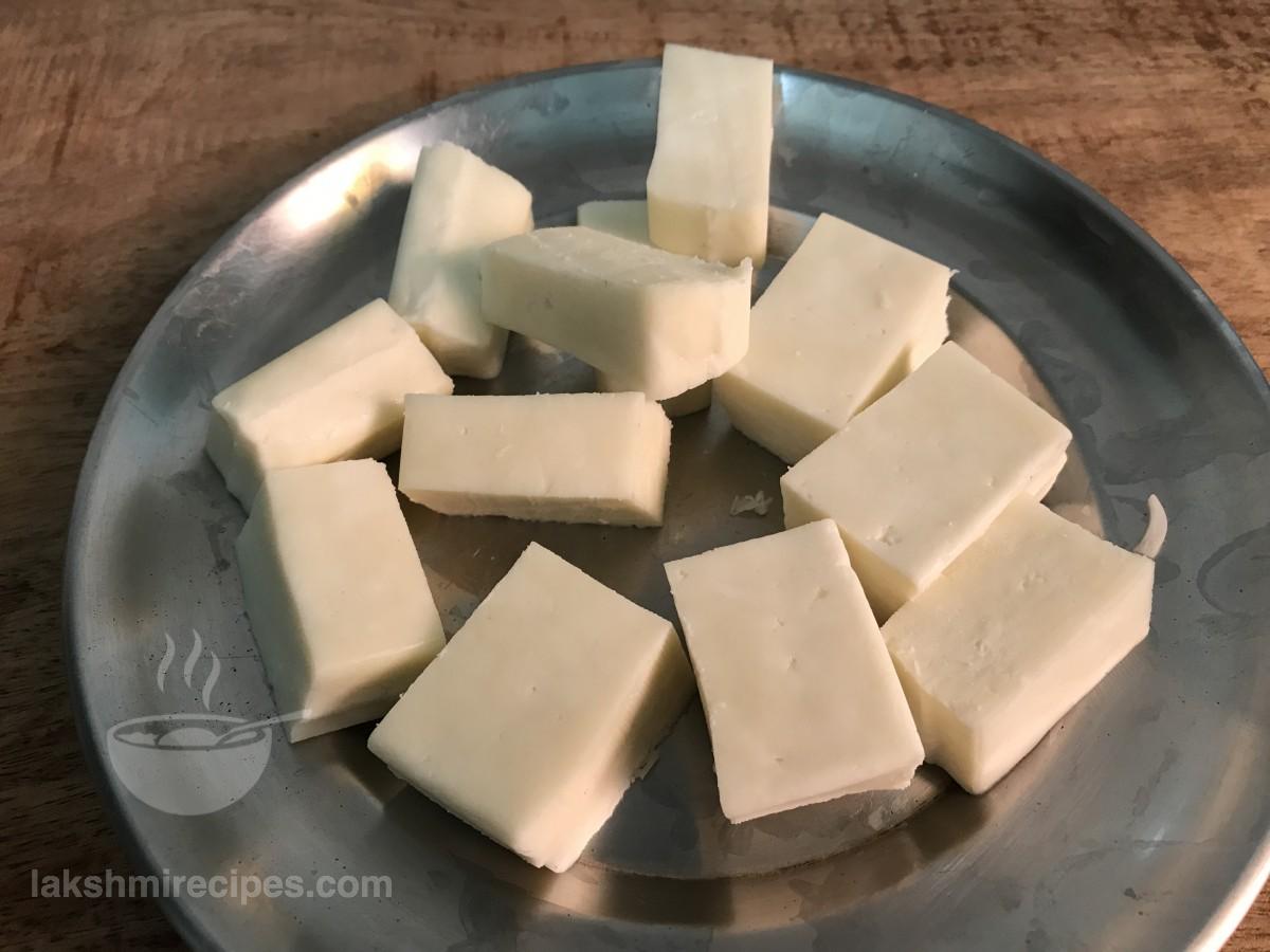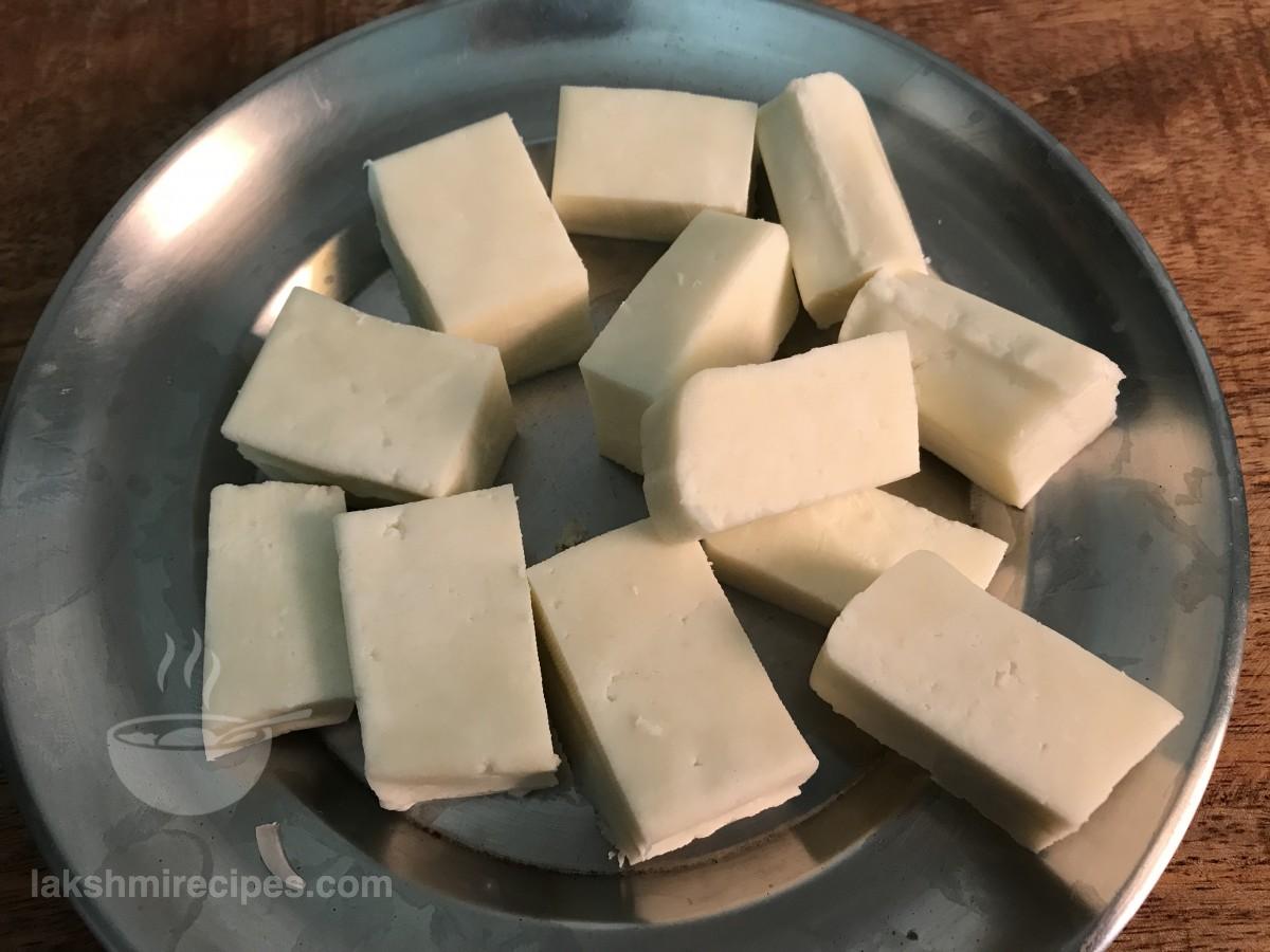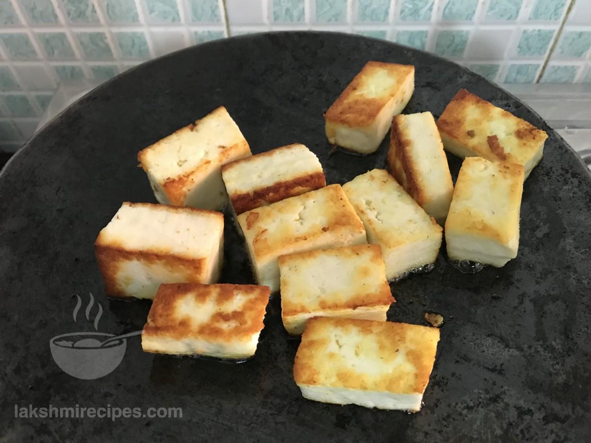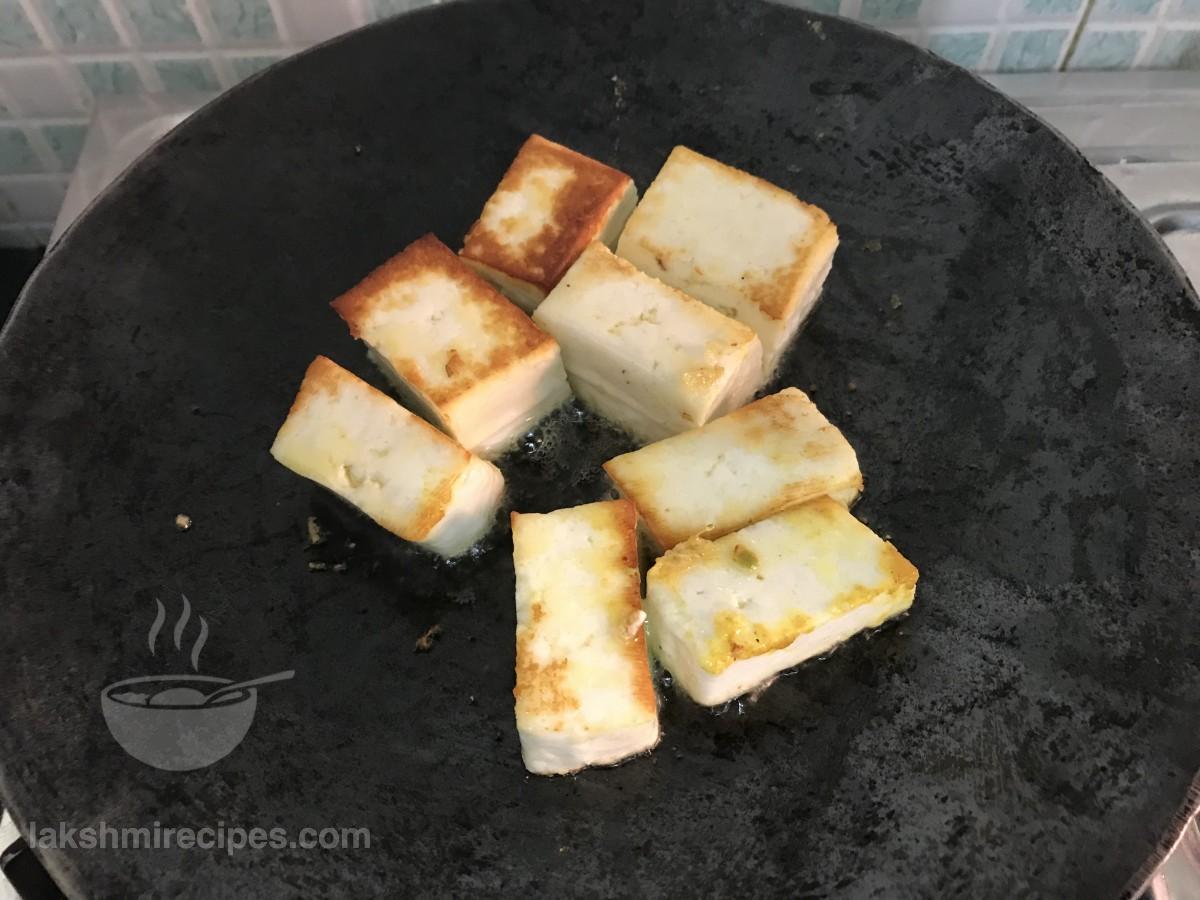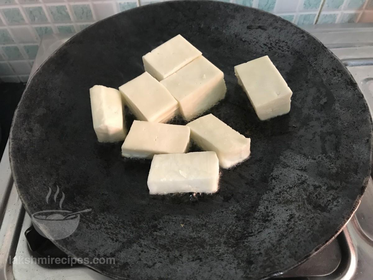 - Heat some refined oil on a tawa and then place the paneer pieces over it. Flip carefully to stir fry the paneer pieces, till they turn light crispy red in color.