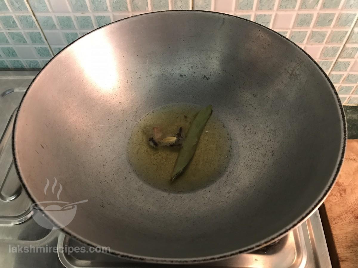 - Heat some refined oil in a kadhai and add bay leaf, cloves and cardamom to it. Saute the ingredients lightly till you can feel the aroma.