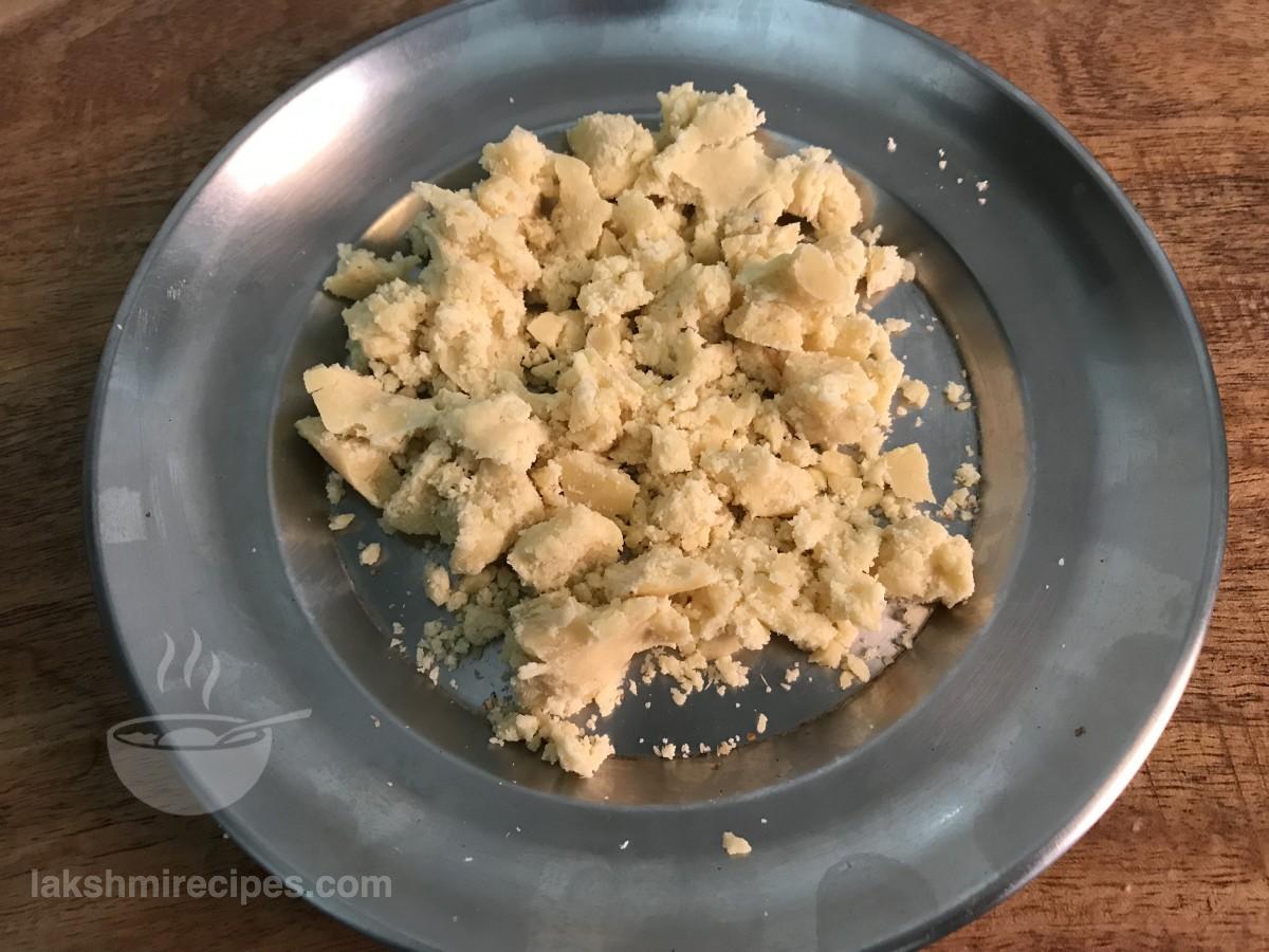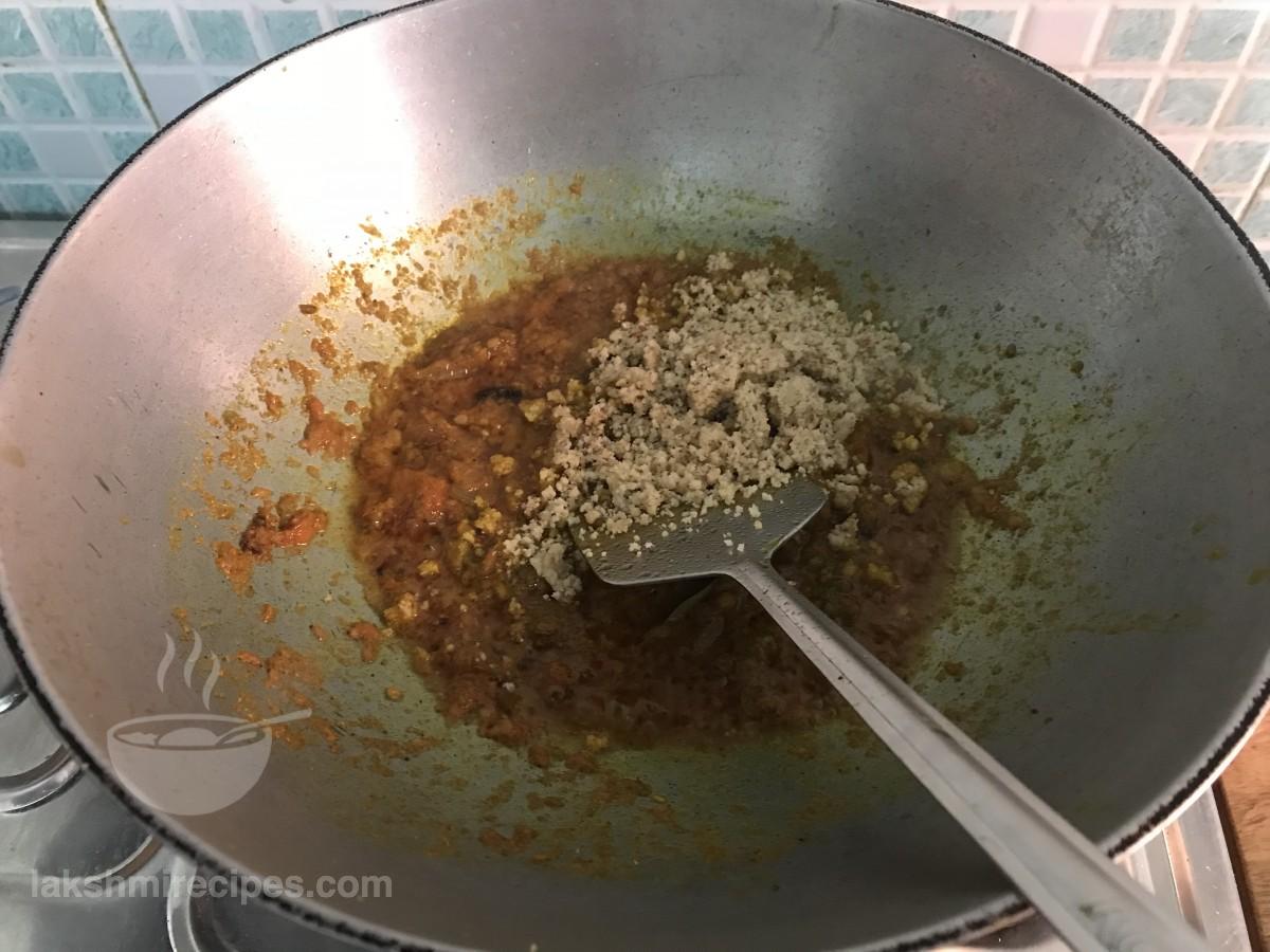 - Now take the khoya or mawa, and crumble it with your hands. Add it to the cooking gravy and mix well.
