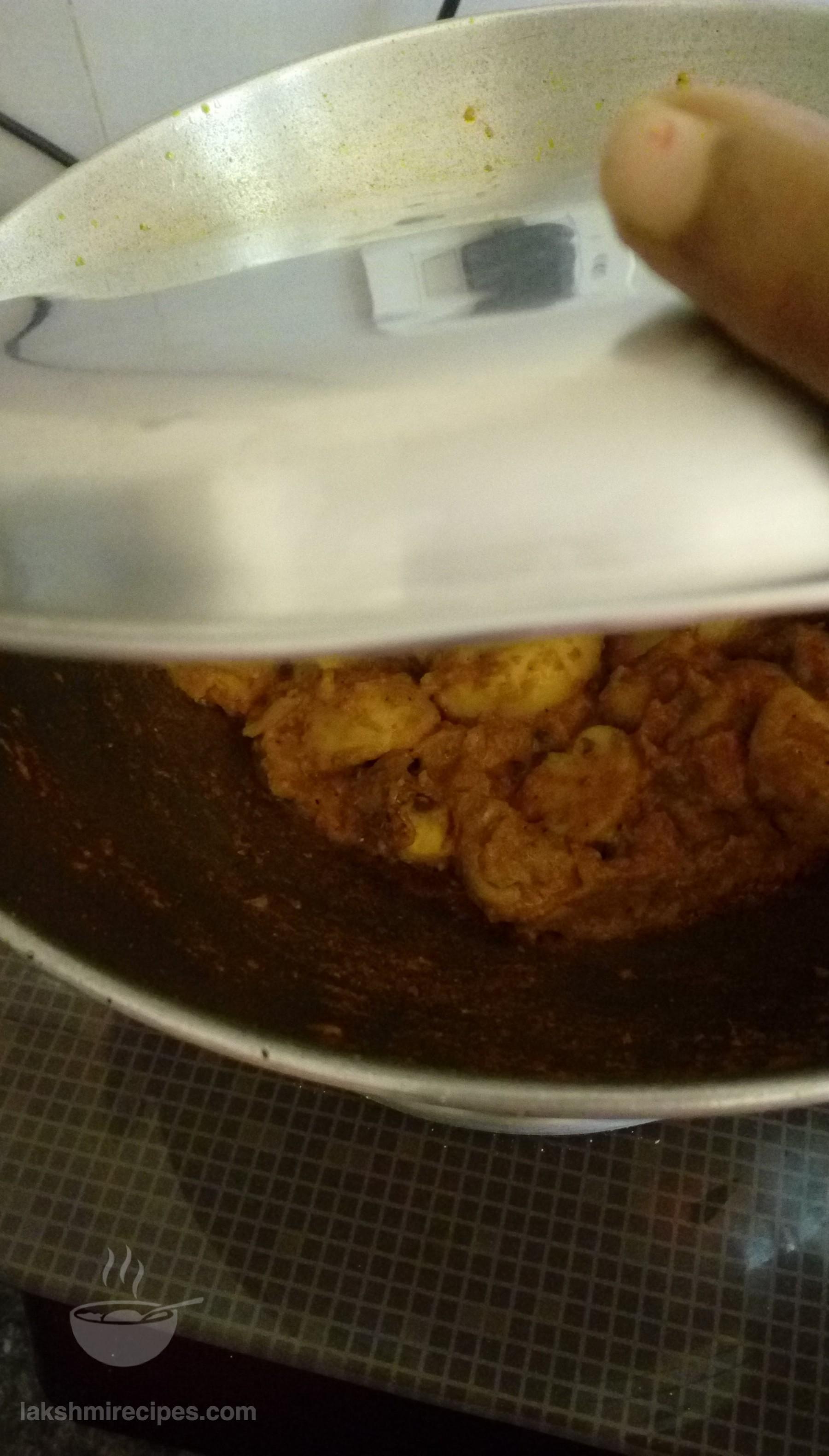 - Now cover the kadhai with a lid and lower the flame. The mushrooms will release water due to the presence of the salt in the masala and get cooked easily.