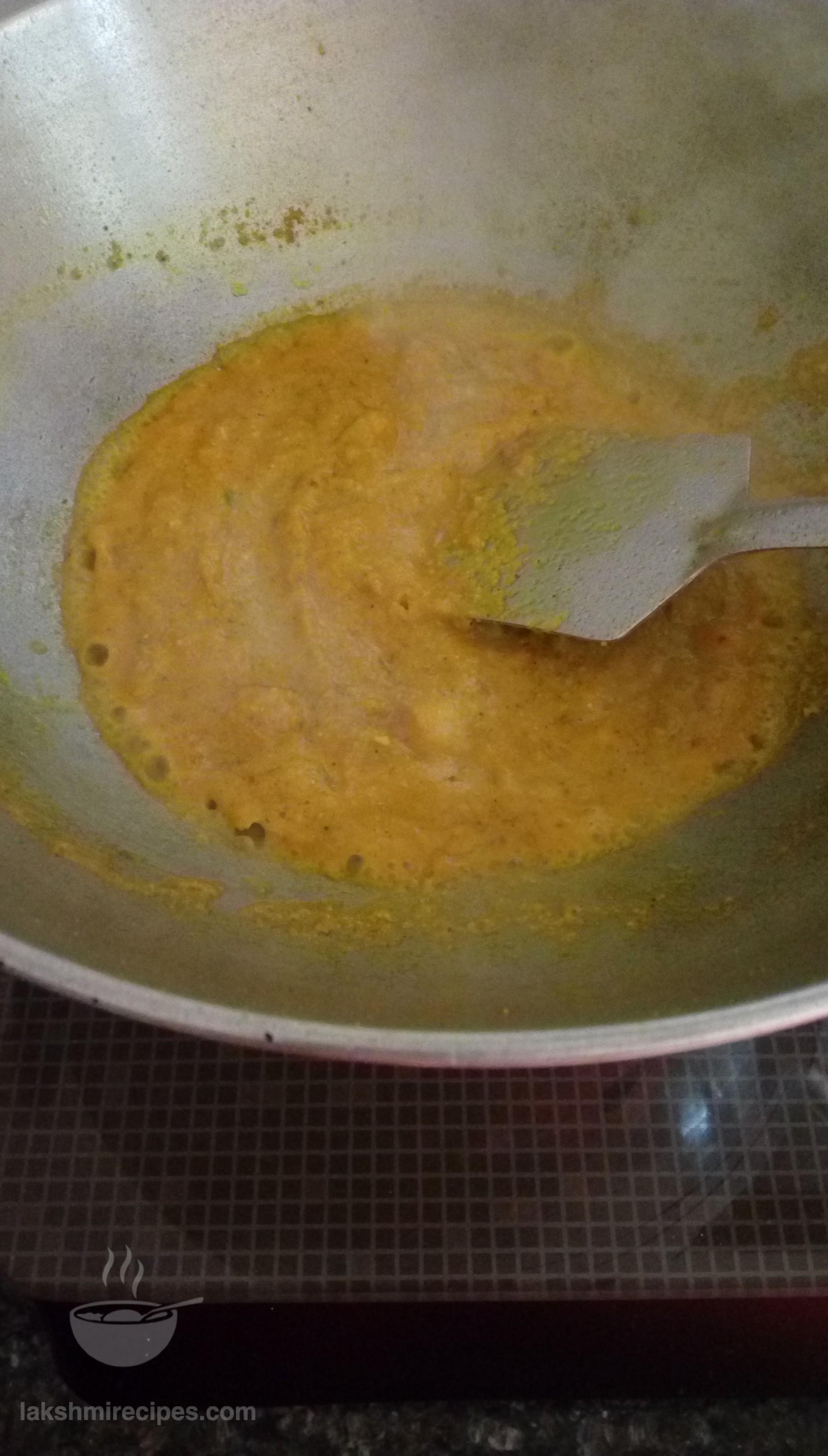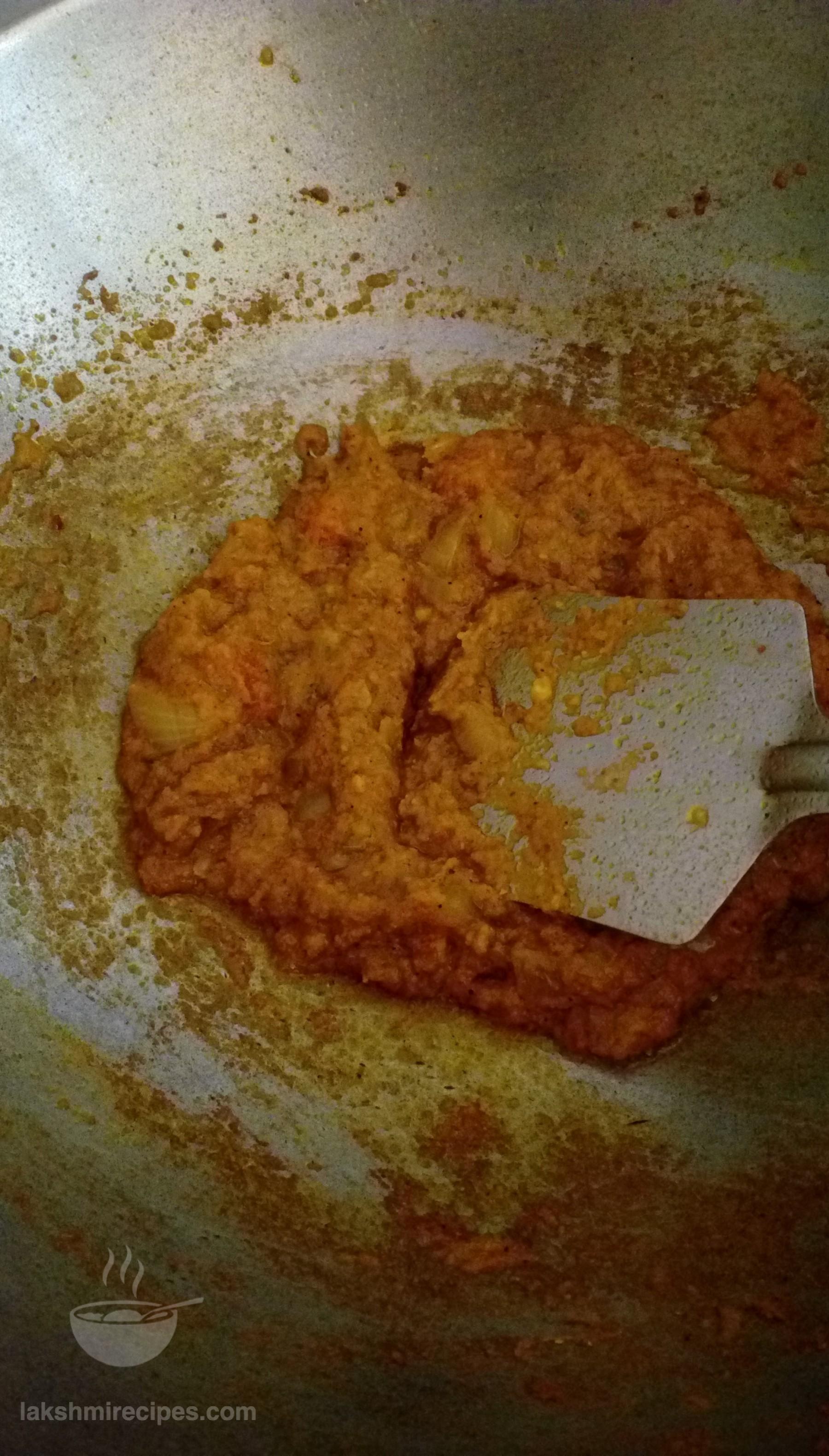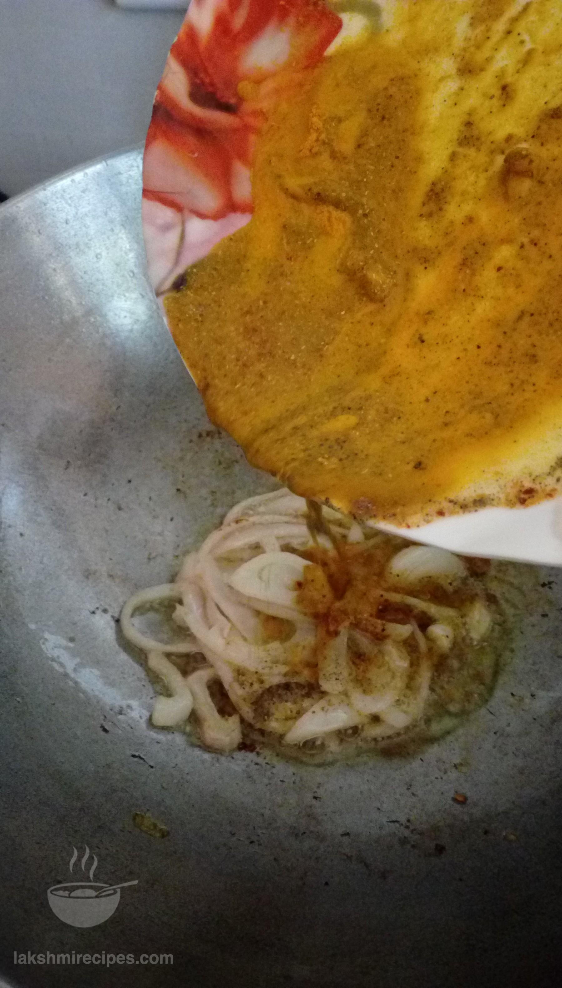 - Now add the solution of spices prepared in the third step to the kadhai and cook it with the sauteed onion (pyaz).