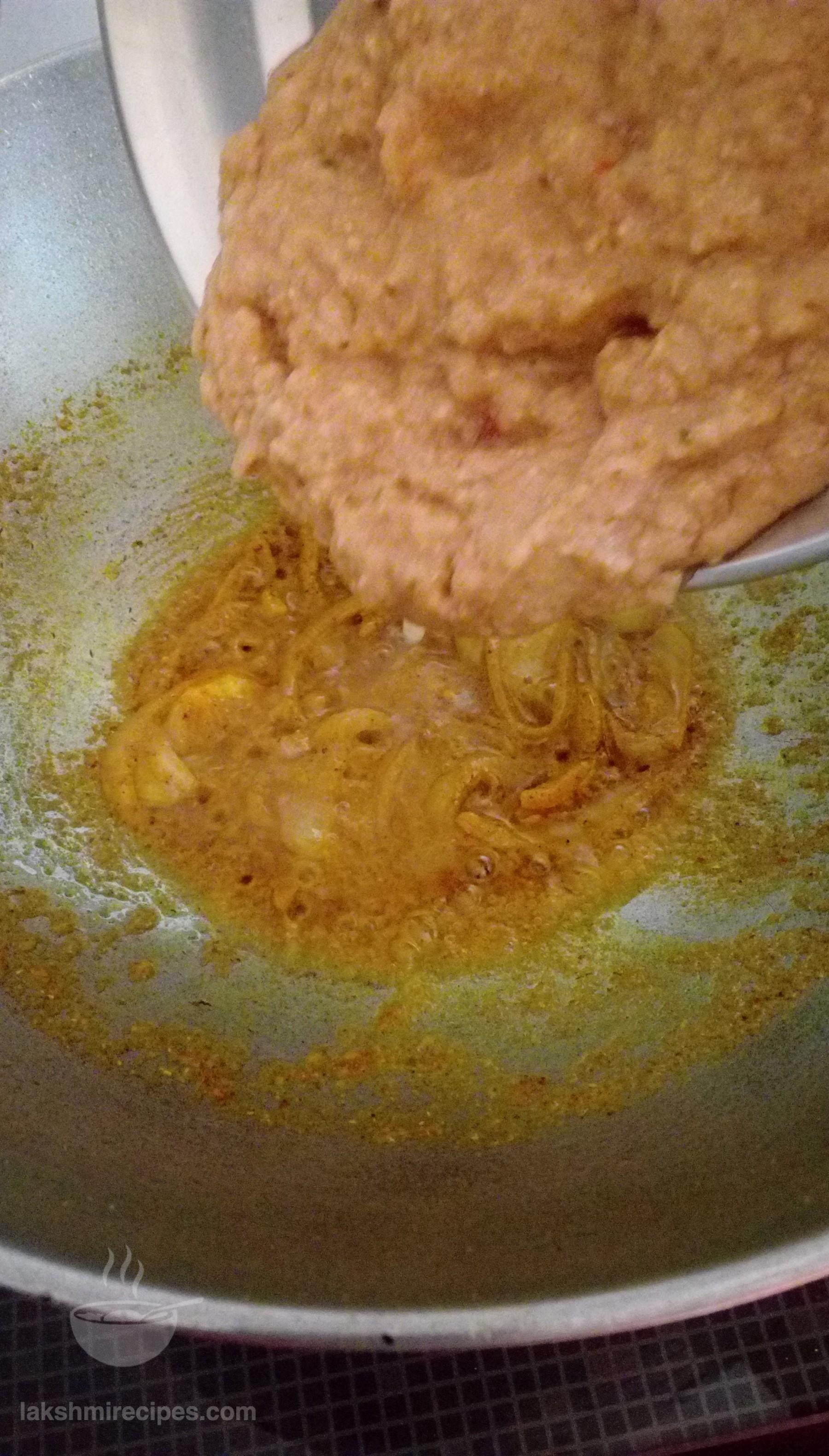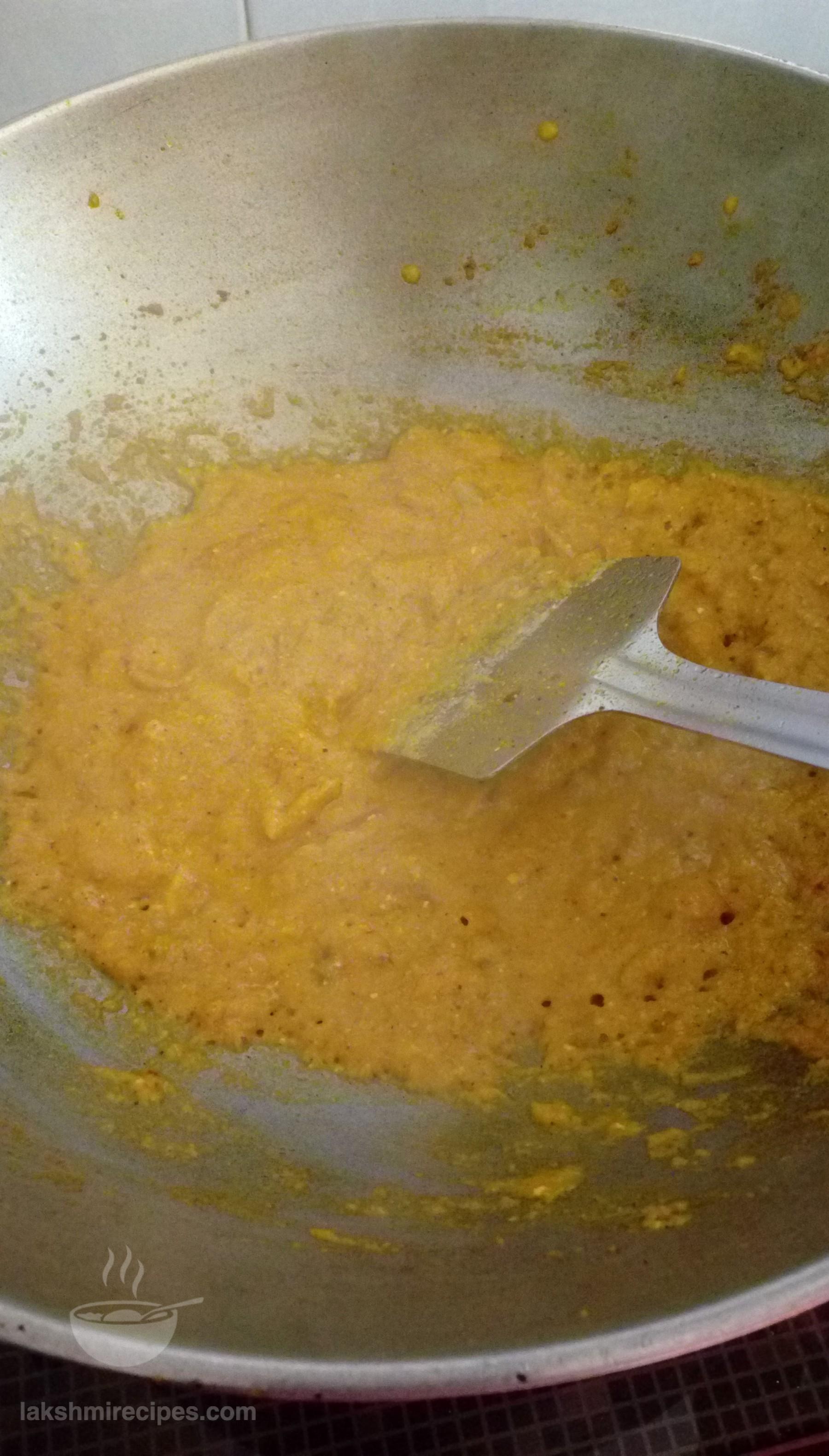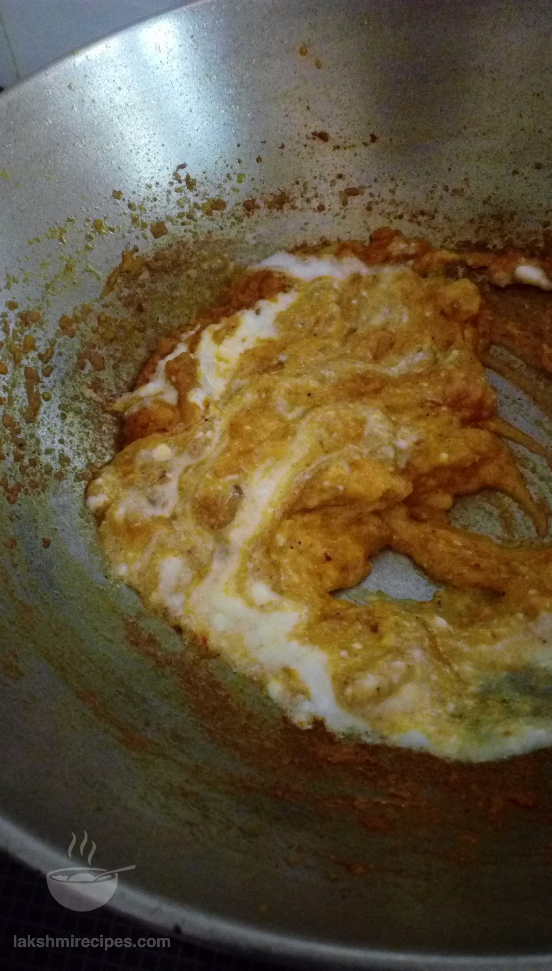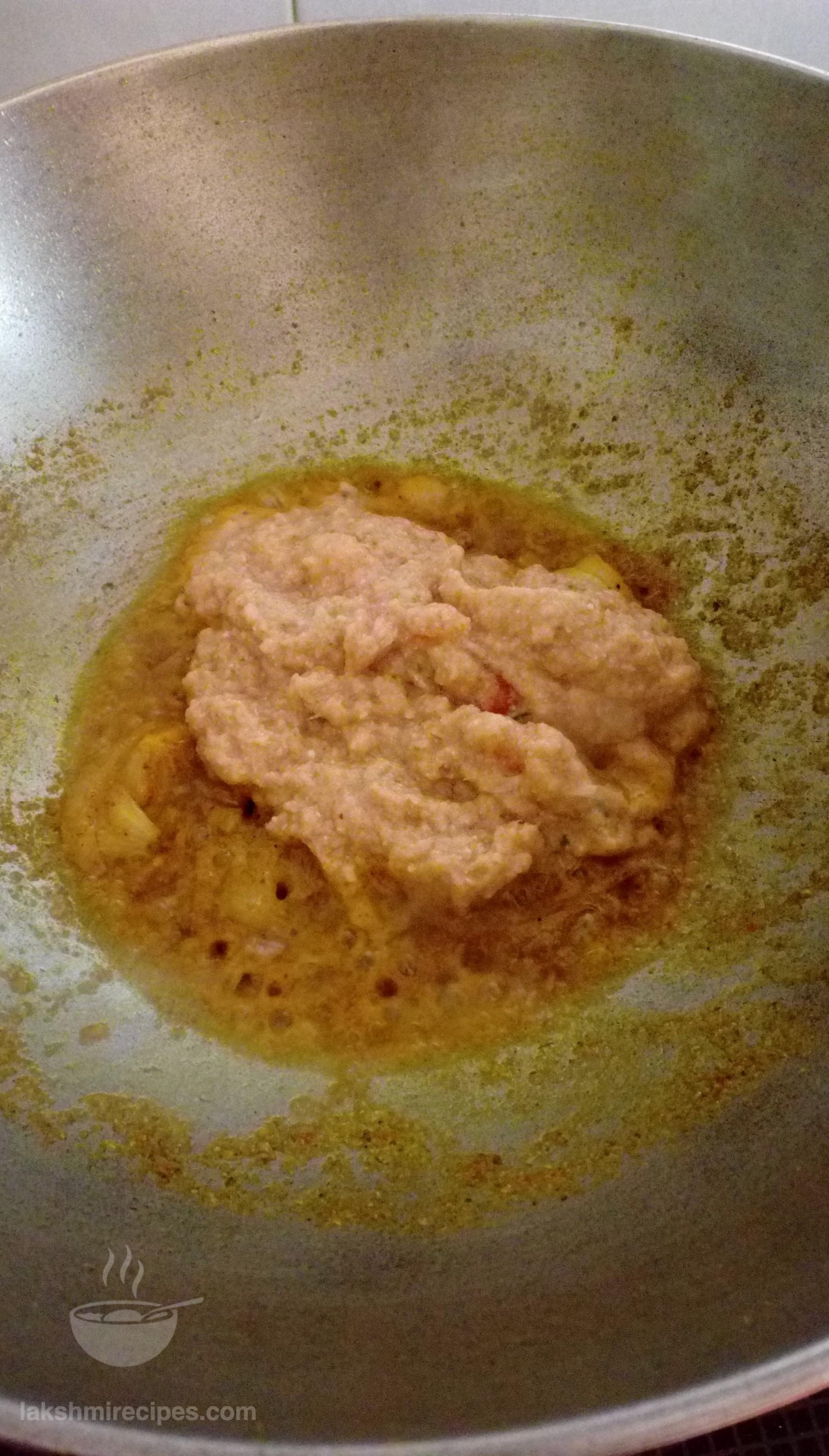 - Now add the solution of spices prepared in the third step to the kadhai and cook it with the sauteed onion (pyaz).