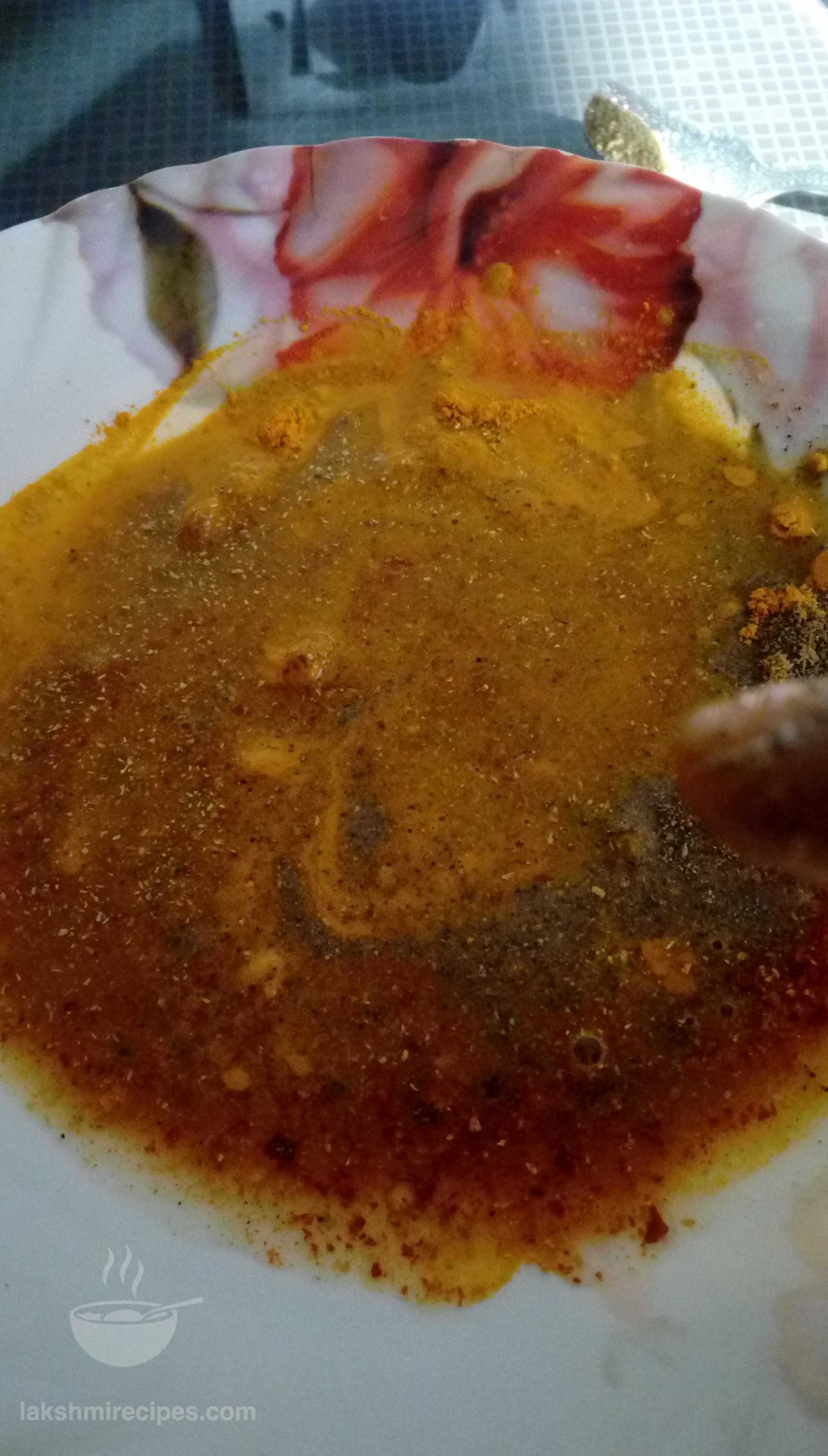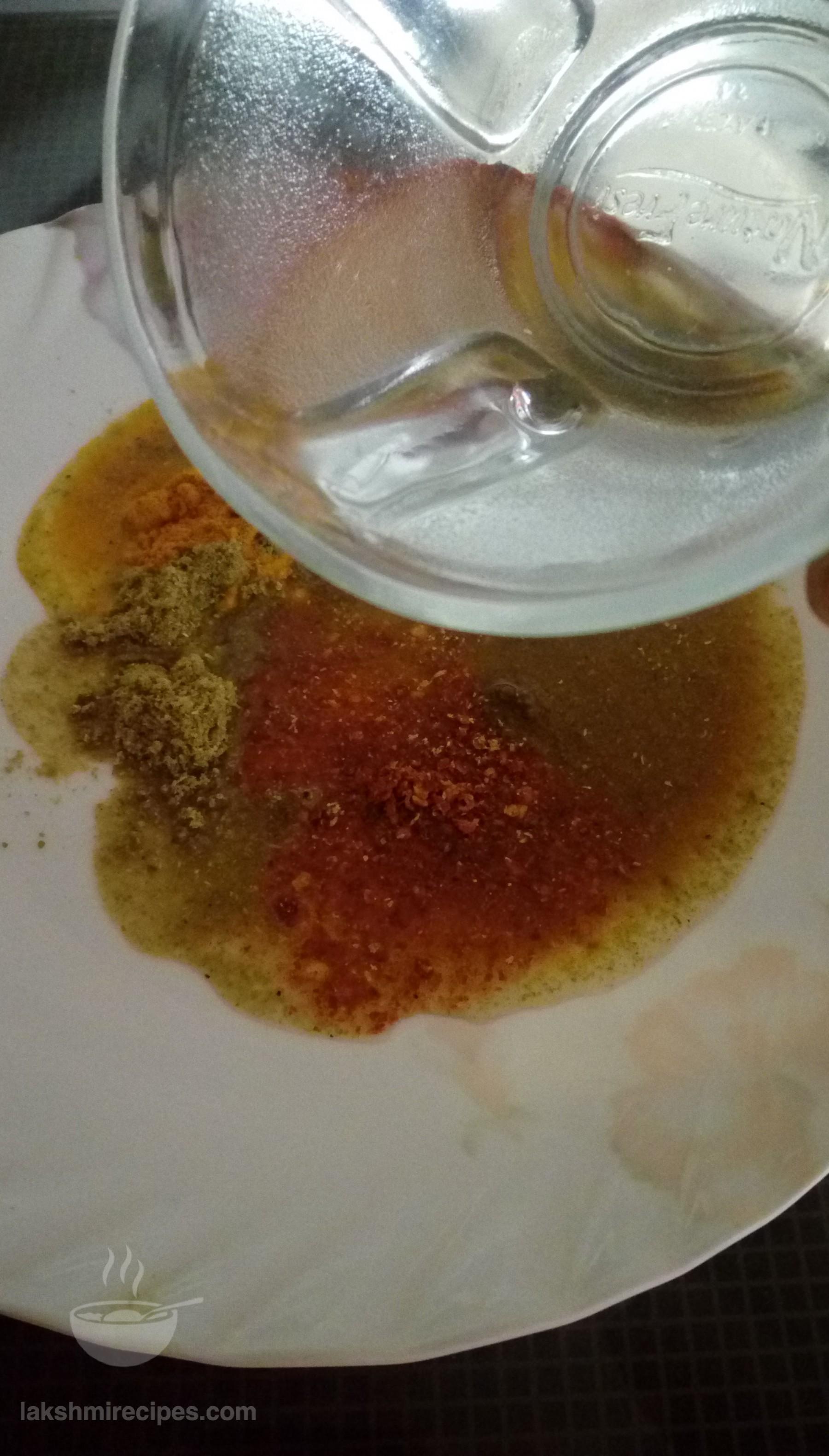 - In a small bowl take some water and add the spices (haldi powder, lal mirch powder, jeera powder, kali mirch powder, dahniya powder) and salt to taste (namak swaad anusar) to it. Mix to form a uniform solution.