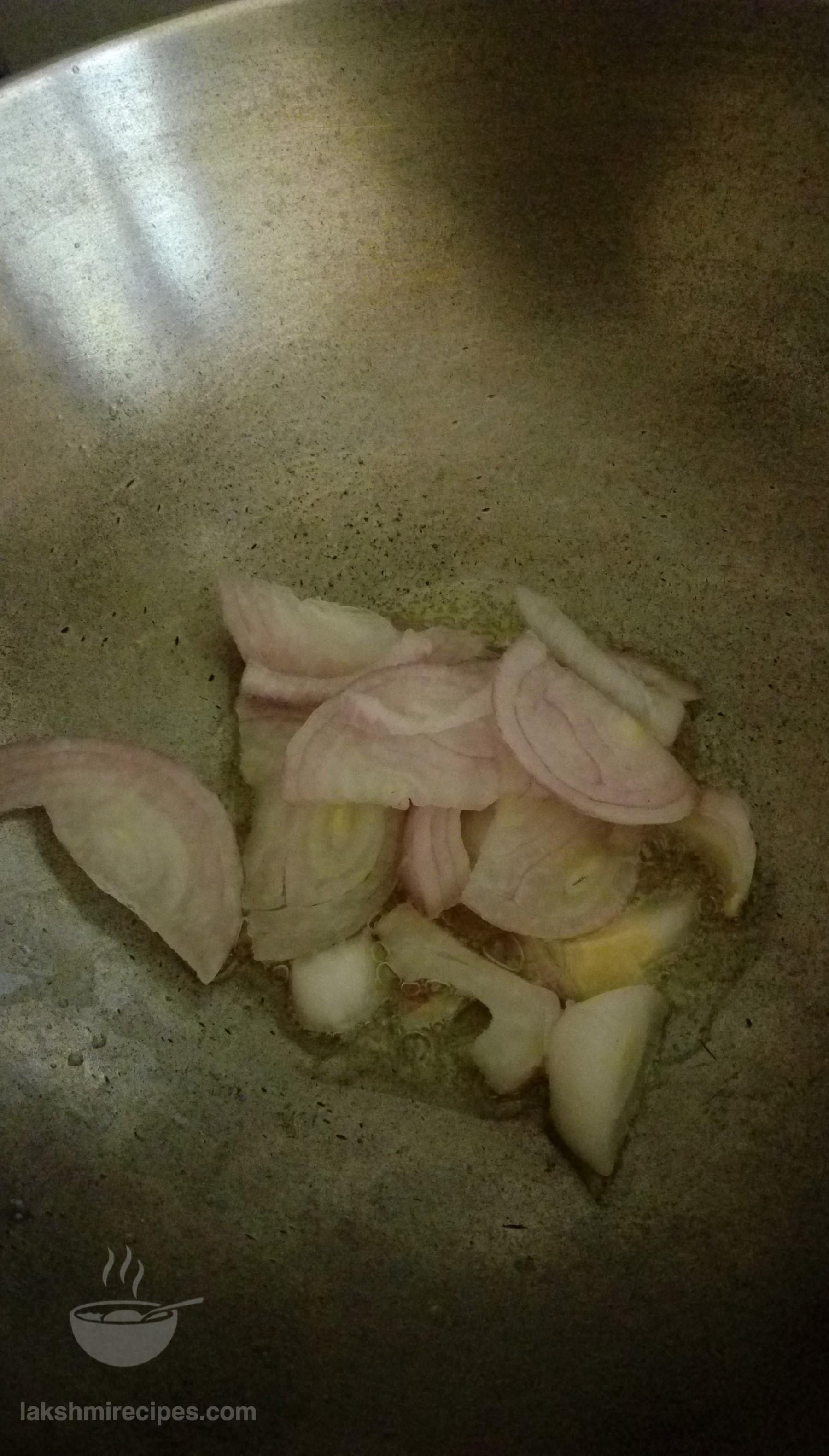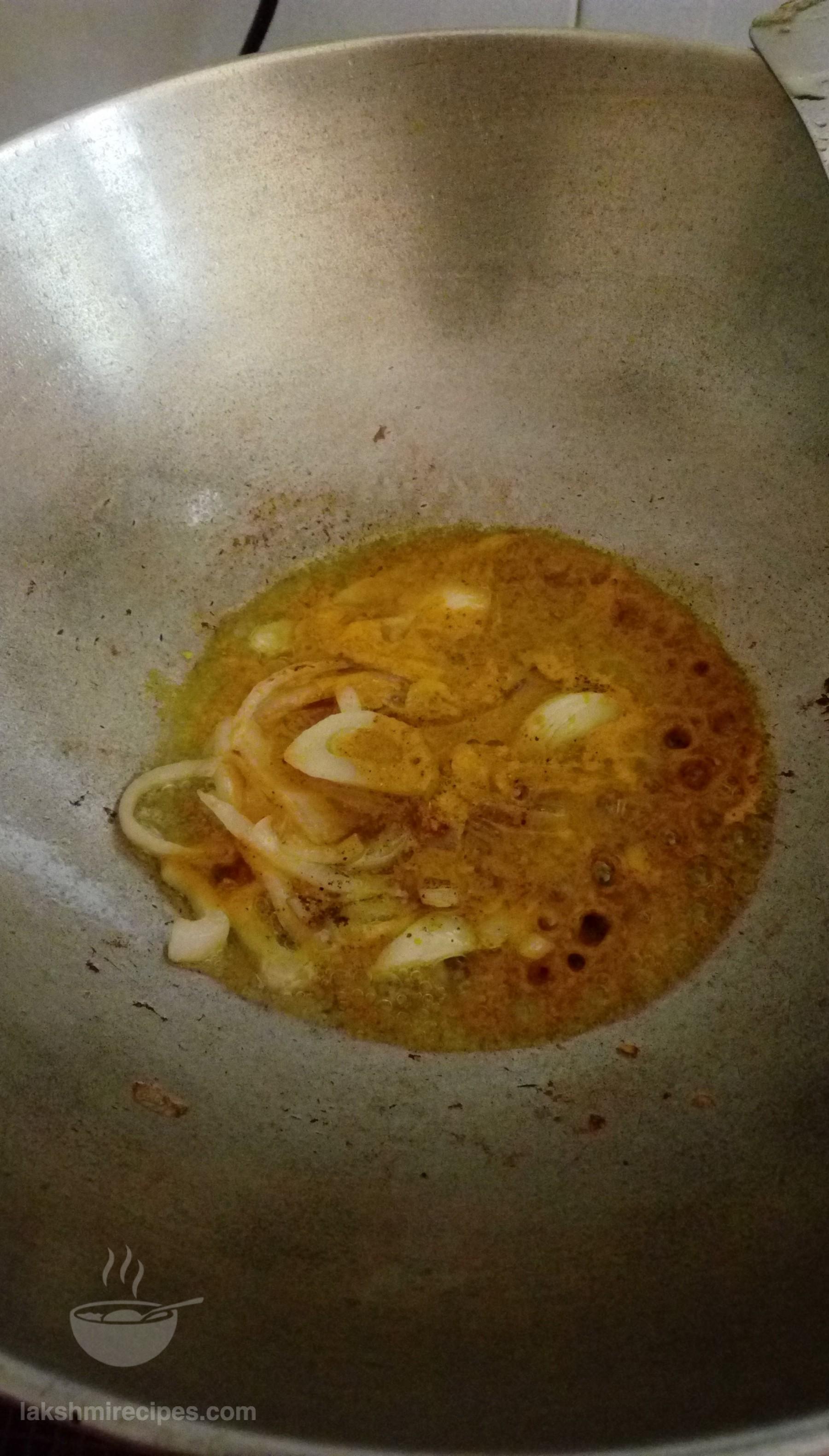 - Heat 1 table spoon refined oil in kadhai and add the 1/2 onion (pyaz) that was finely chopped. Saute the onion (pyaz) till it turns light red in color.