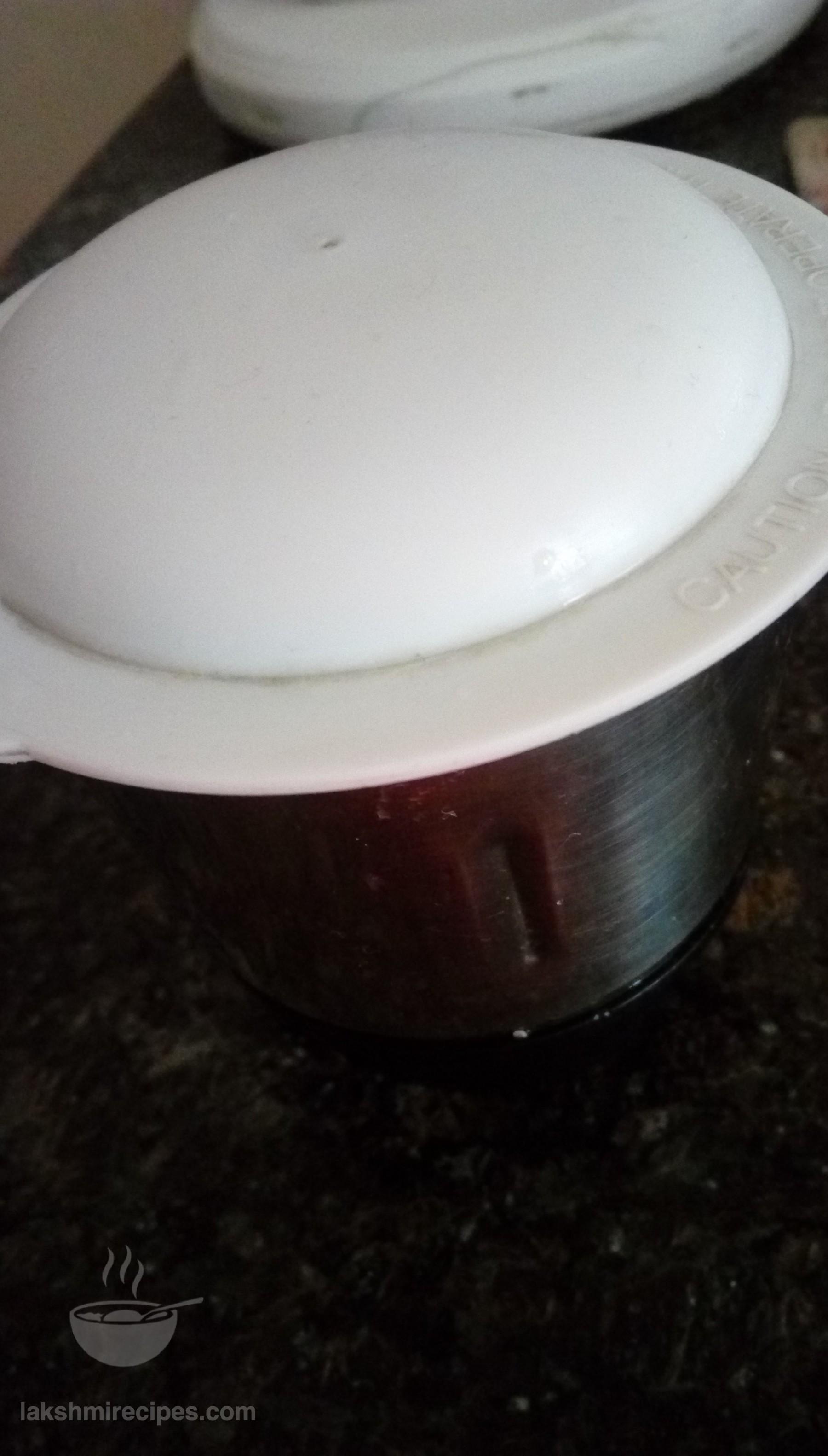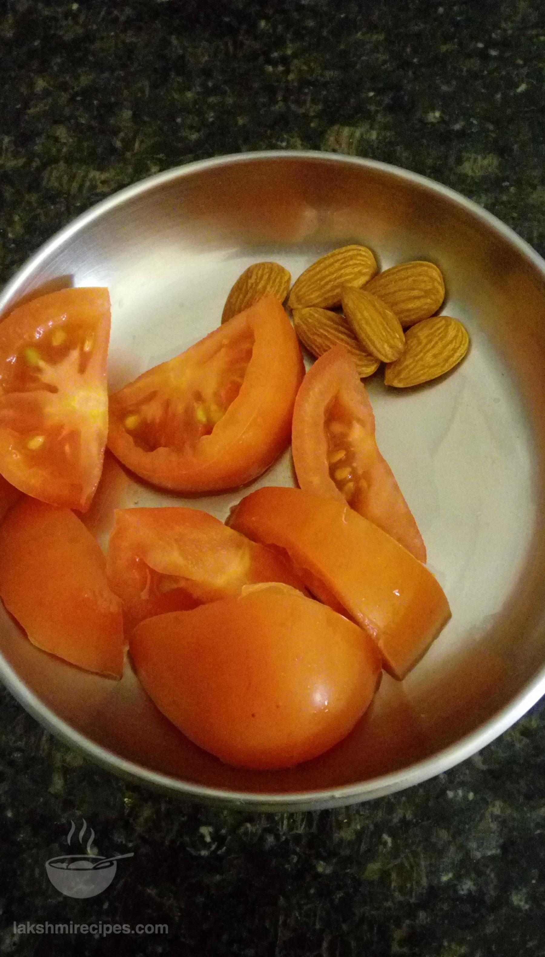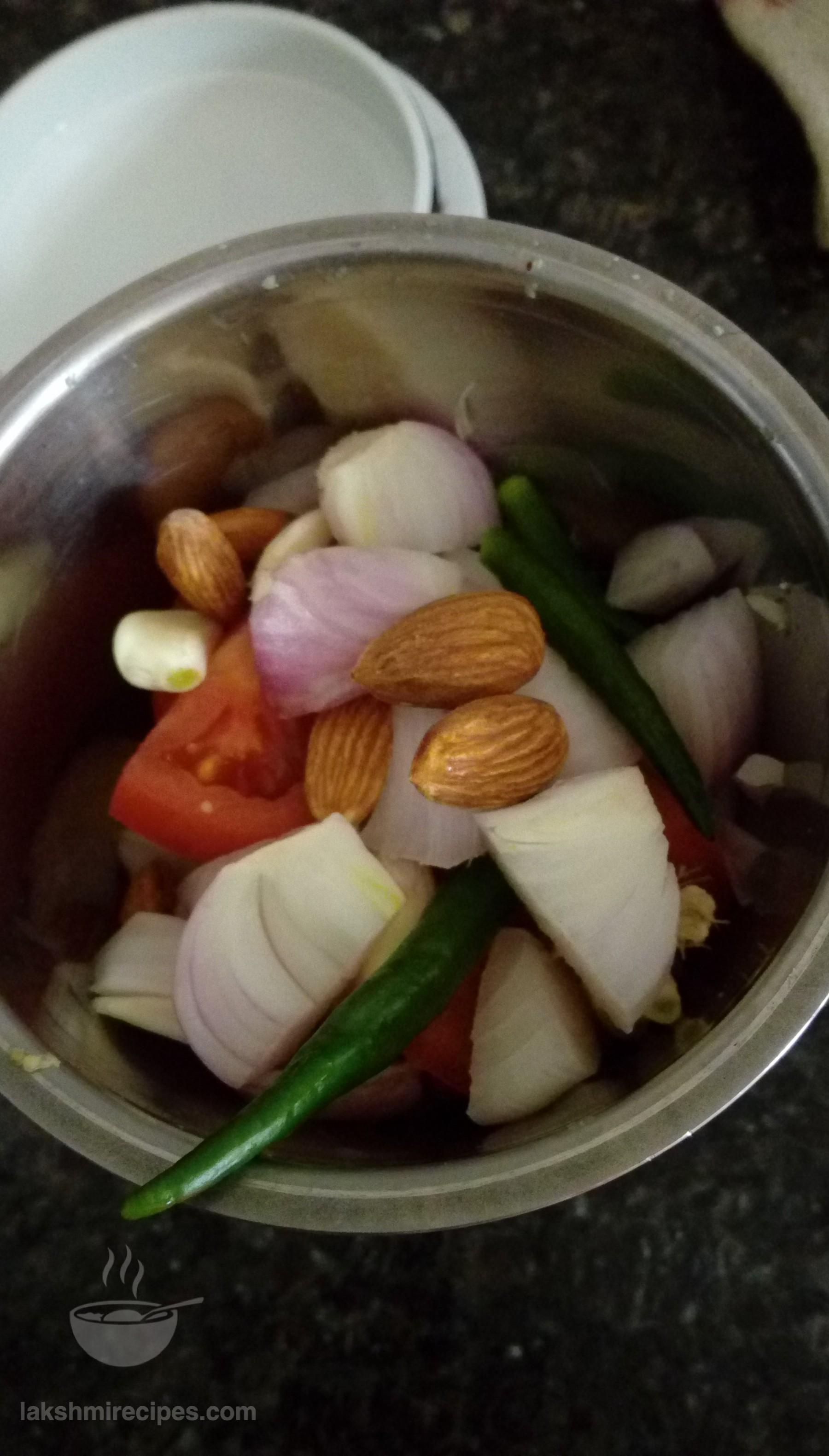- In a mixer grinder take 1 tomato (tamatar), 1/2 onion (roughly chopped pyaz), garlic petals (lehsun ki kali), green chillis (hari mirch), ginger (adrak) and almonds (badaam) together to make a fine paste of the ingredients.