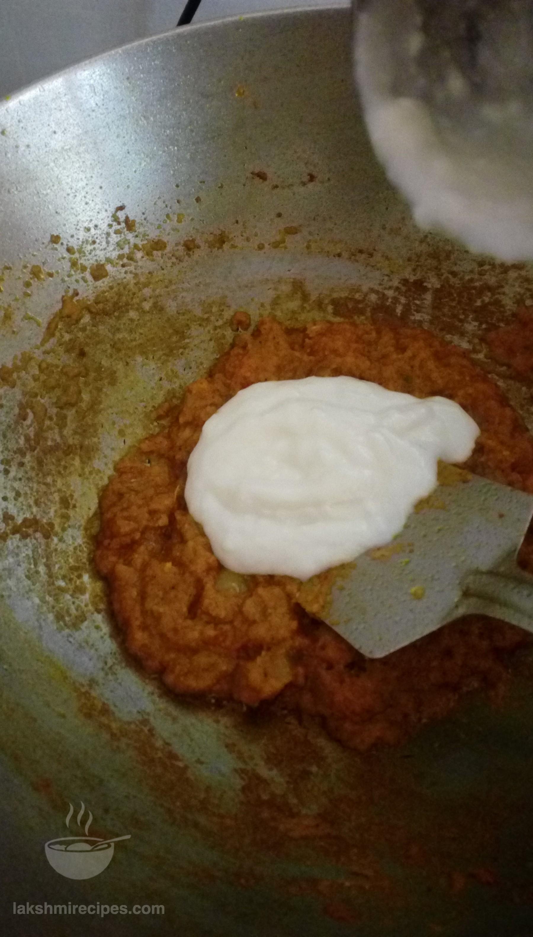 - When the masala is cooked well, then add the fresh cream or malai and curd (dahi) to the kadhai. Stir and mix it with the masala.