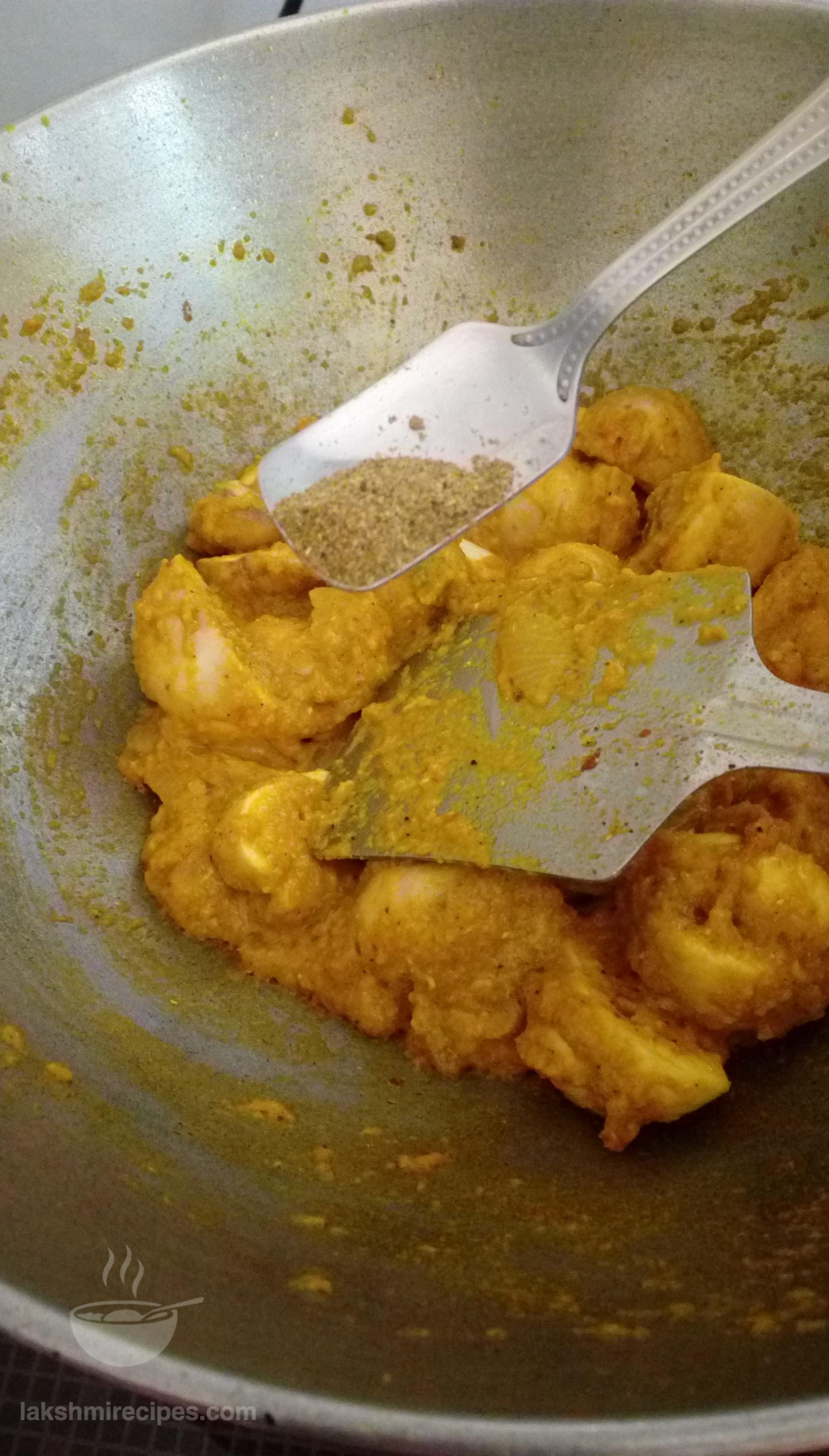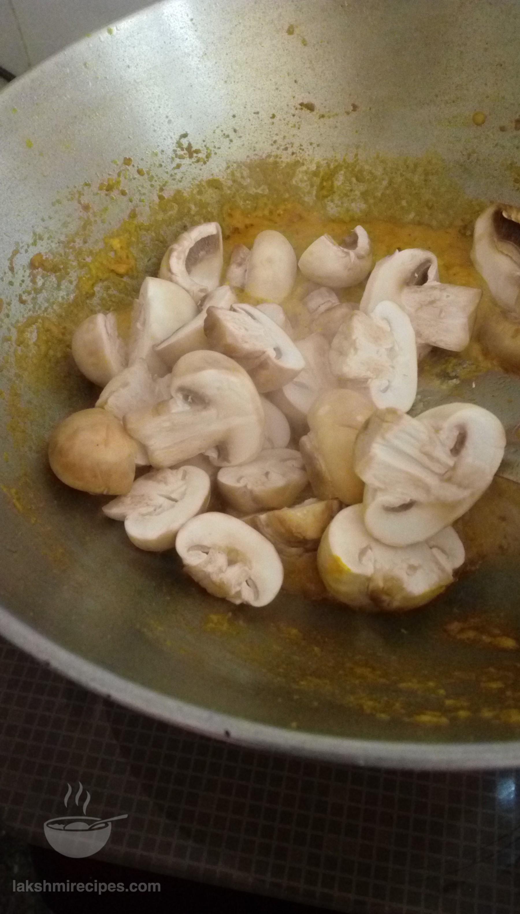 - Stir and cook the masala for a few seconds. Then add mushrooms, followed by garam masala powder and mix both the ingredients with the cooking masala.