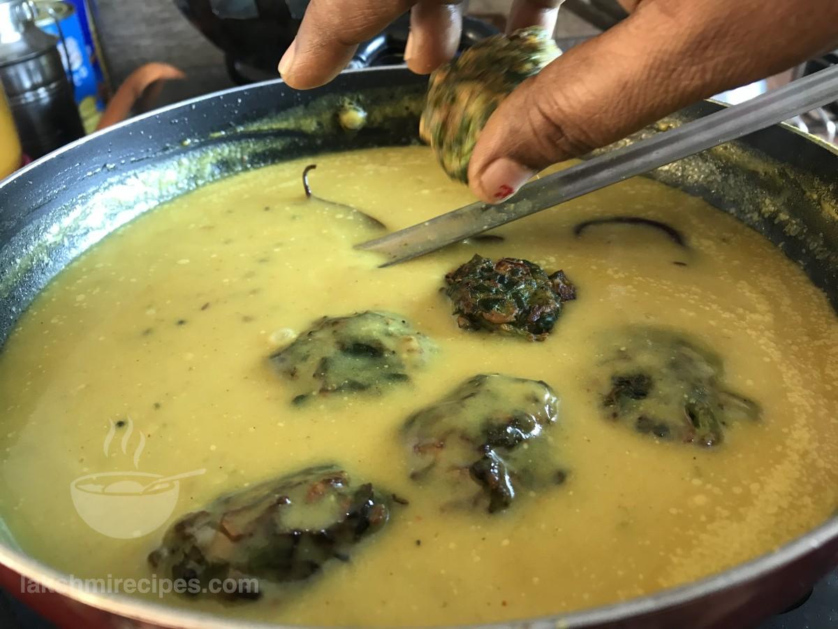 - Add the pakodas prepared earlier to the kadhi. The "Paalak Kadhi Pakoda" is ready. Serve it with hot rice and enjoy.