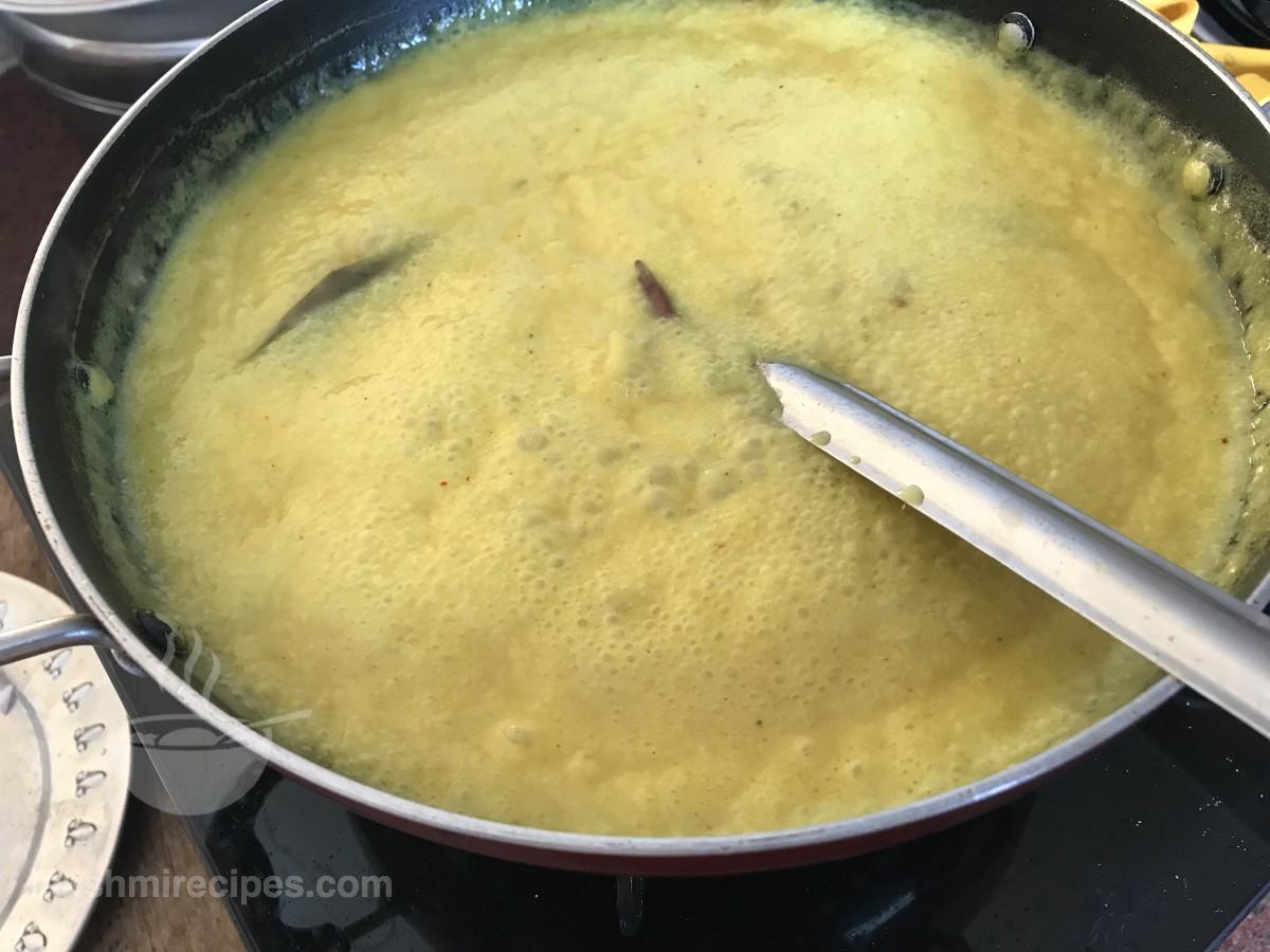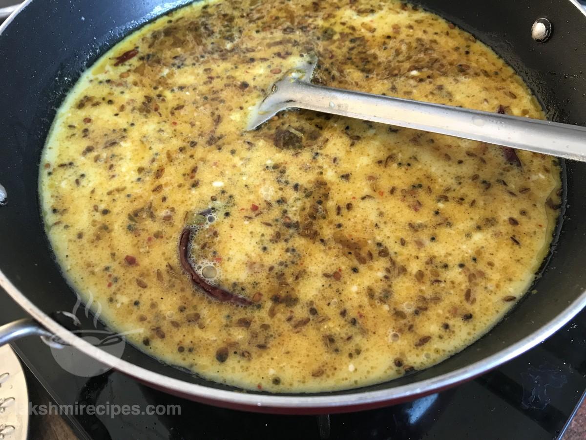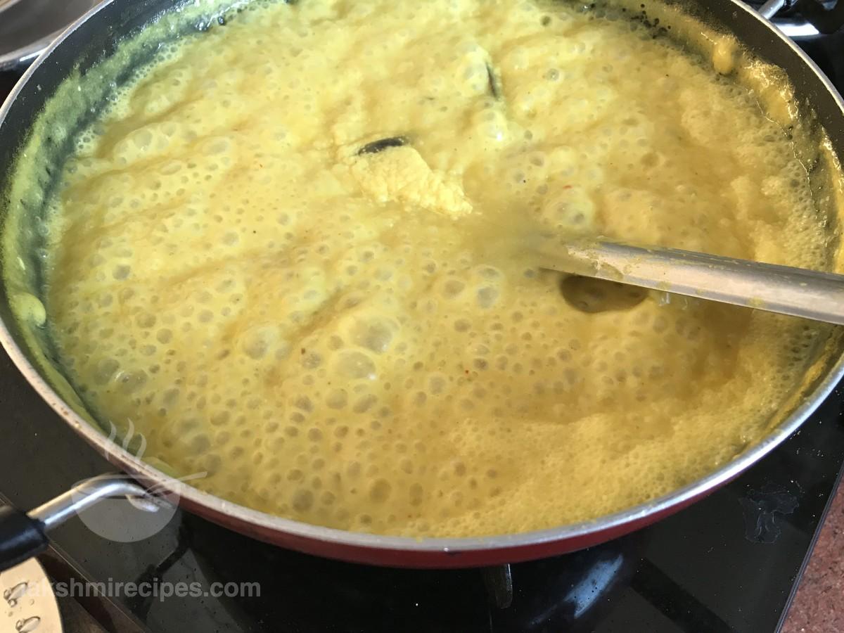 - When the kadhi begins to boil then lower the flame to medium level and stir and cook it for 5-7 minutes.