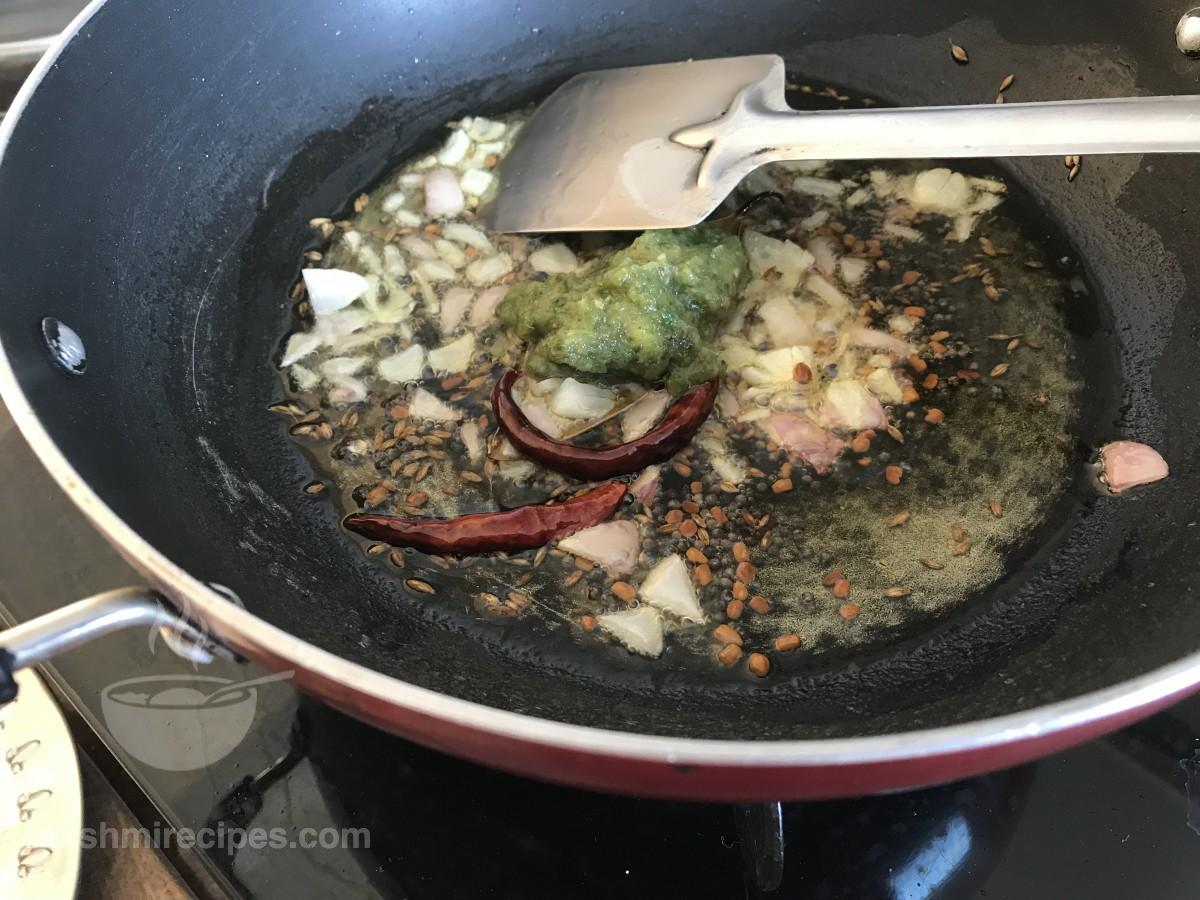 - Now add the paste of ginger-garlic and green chilli to the cooking ingredients. Saute it too.