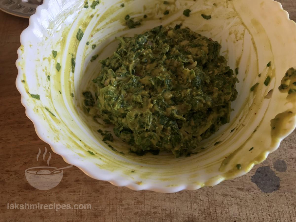 - Then add chopped onion, green chilli, red chilli powder and 1-2 tea spoon water to the above ingredients. (Kindly note that spinach leaves will release water when salt is added and mixed with them. Therefore add less water only.) Mix again and prepare the batter for making pakode for "Paalak Kadhi Pakoda".