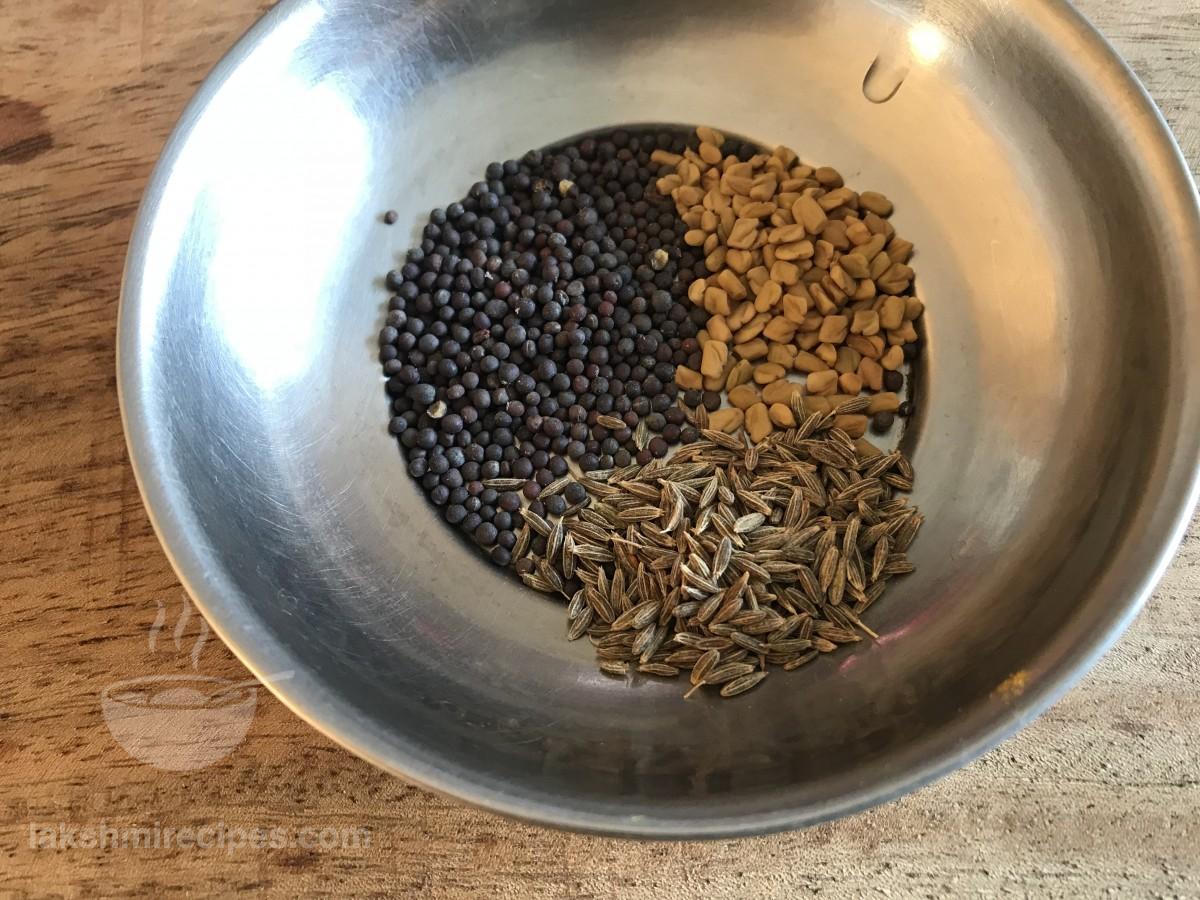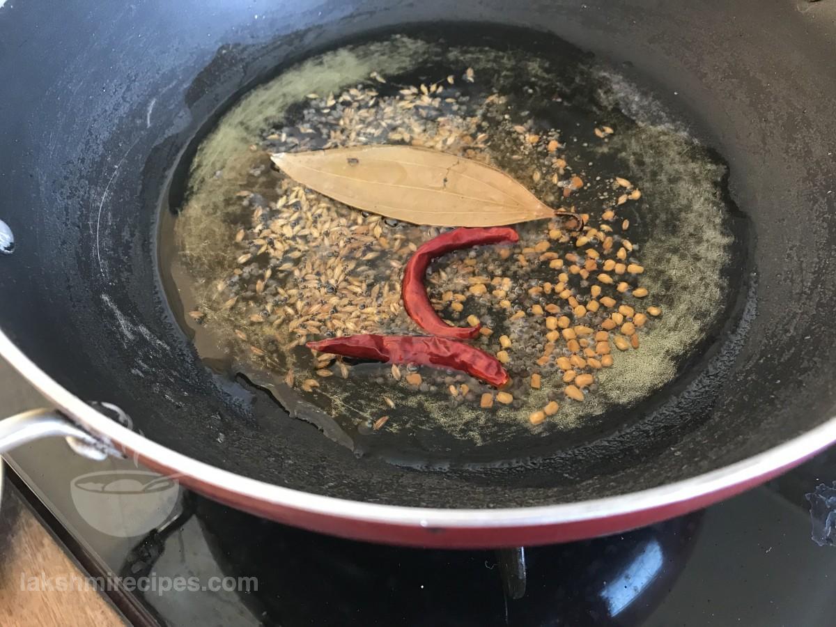 - एक गहरे कढ़ाई में थोड़ा तेल डालकर गरम करें और उसमें सरसों दाना/राई, जीरा और मेथी दाना डालें। सरसों दाना/राई, जीरा और मेथी दाना को चटकने दें।