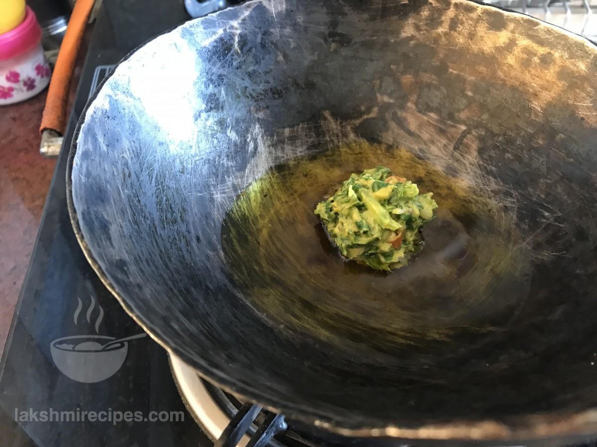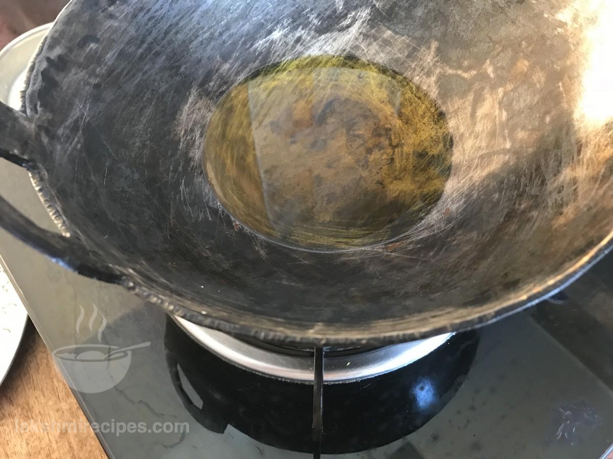 - अब एक कढ़ाई में थोड़ा सरसों का तेल गरम करें और जब तेल "पकोड़े तलने के लिए पर्याप्त गर्म होजाए तो आंच को कम कर दें।