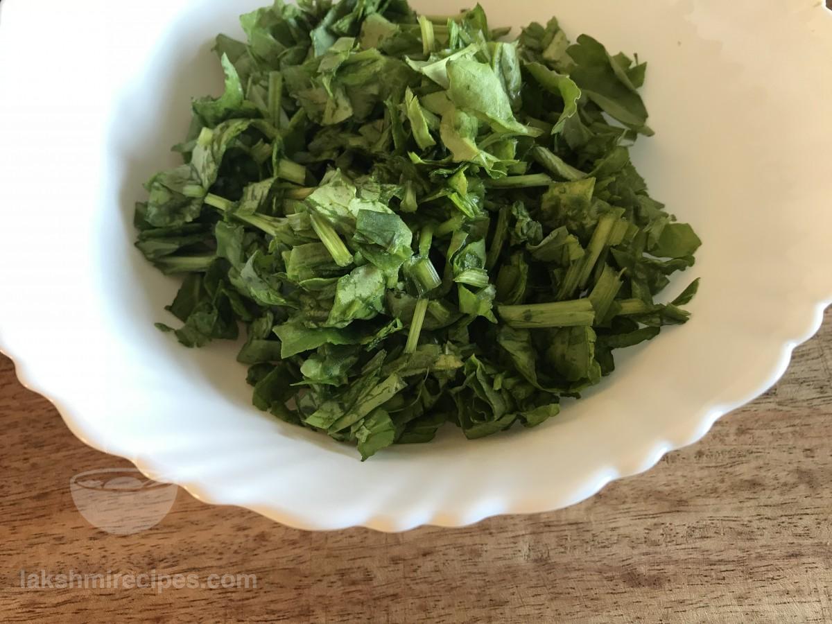 - Rinse the spinach leaves with clean water atleast 2-3 times and then chop them into 1/2 inch big pieces.