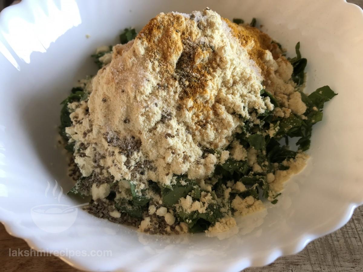 - Transfer this chopped spinach pieces to a mixing bowl and add gram flour, carom seeds, turmeric powder and salt to it. Mix the ingredients well.